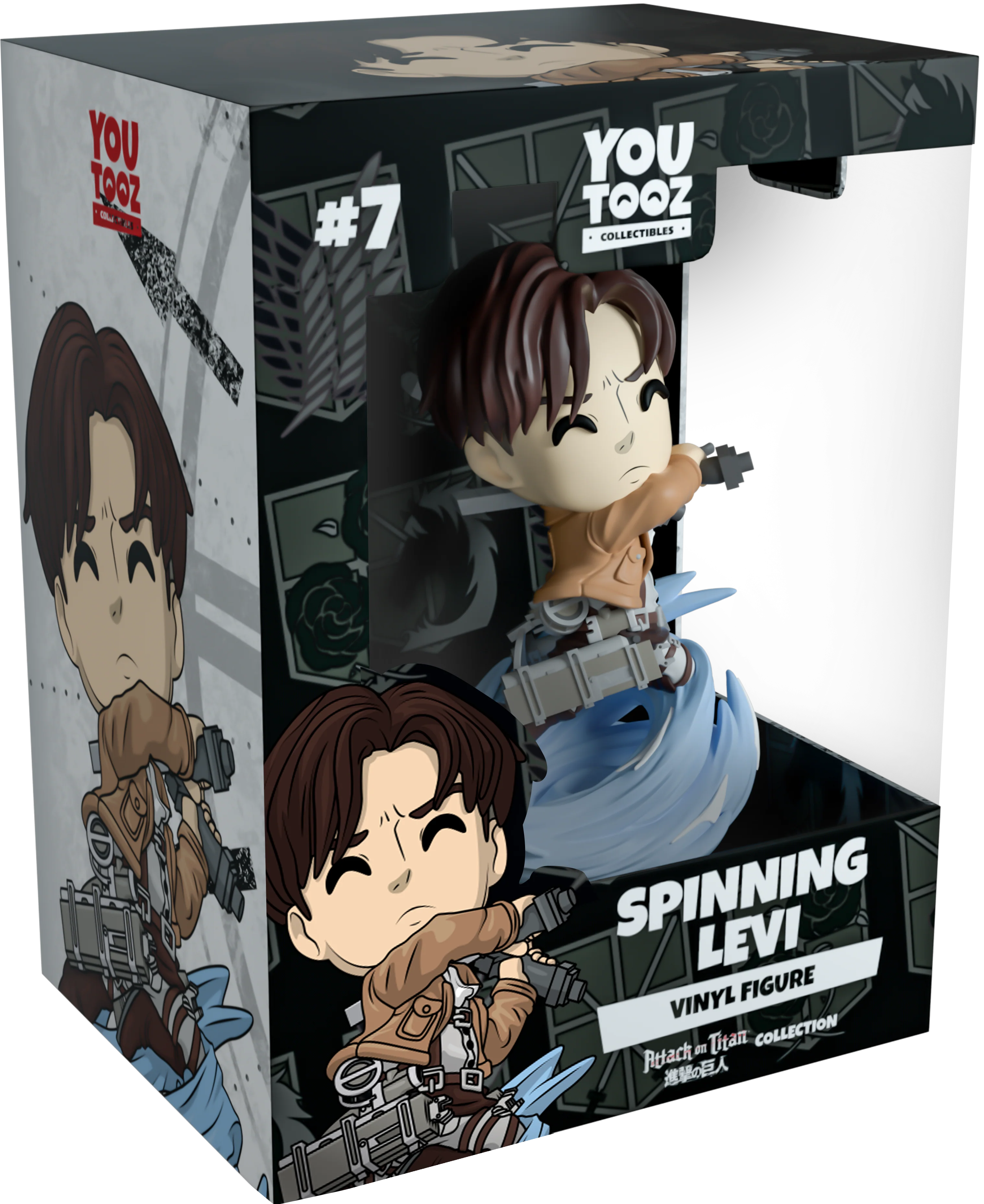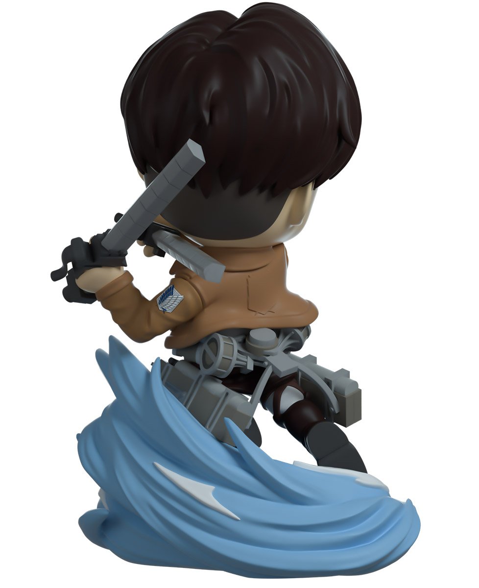 Levi bursts into action, spinning through a gust of swirling blue and white air at 4.5” tall. His body twists backwards with a knee raised high, while his swords are lifted over his left shoulder preparing to viciously slice his enemies to shreds. His face looks forward stoically with pursed lips from under a long dark brown undercut. He wears the standard issue Survey Corps uniform with a white cravat popping out from the collar and grey ODM gear. The exterior of his packaging resembles the map of the walls used in the manga. While the interior pattern shows the three military regiment insignias in a grey repeating across a black background. The protective sleeve displays a closer view map encompassing the packaging. This collectible ships in a matte, embossed, protective outer sleeve and a custom sized plastic protector for maximum protection during shipping.