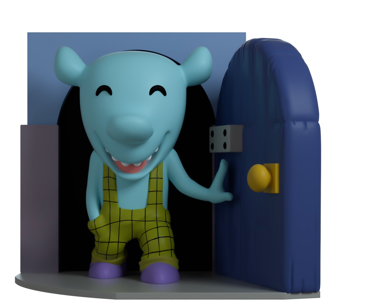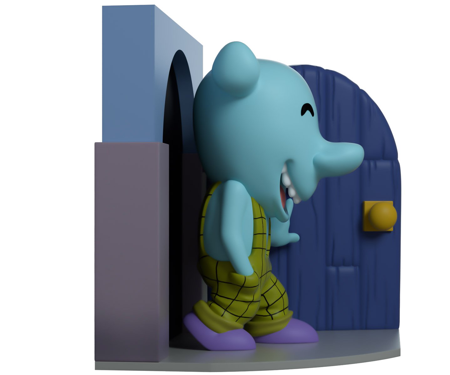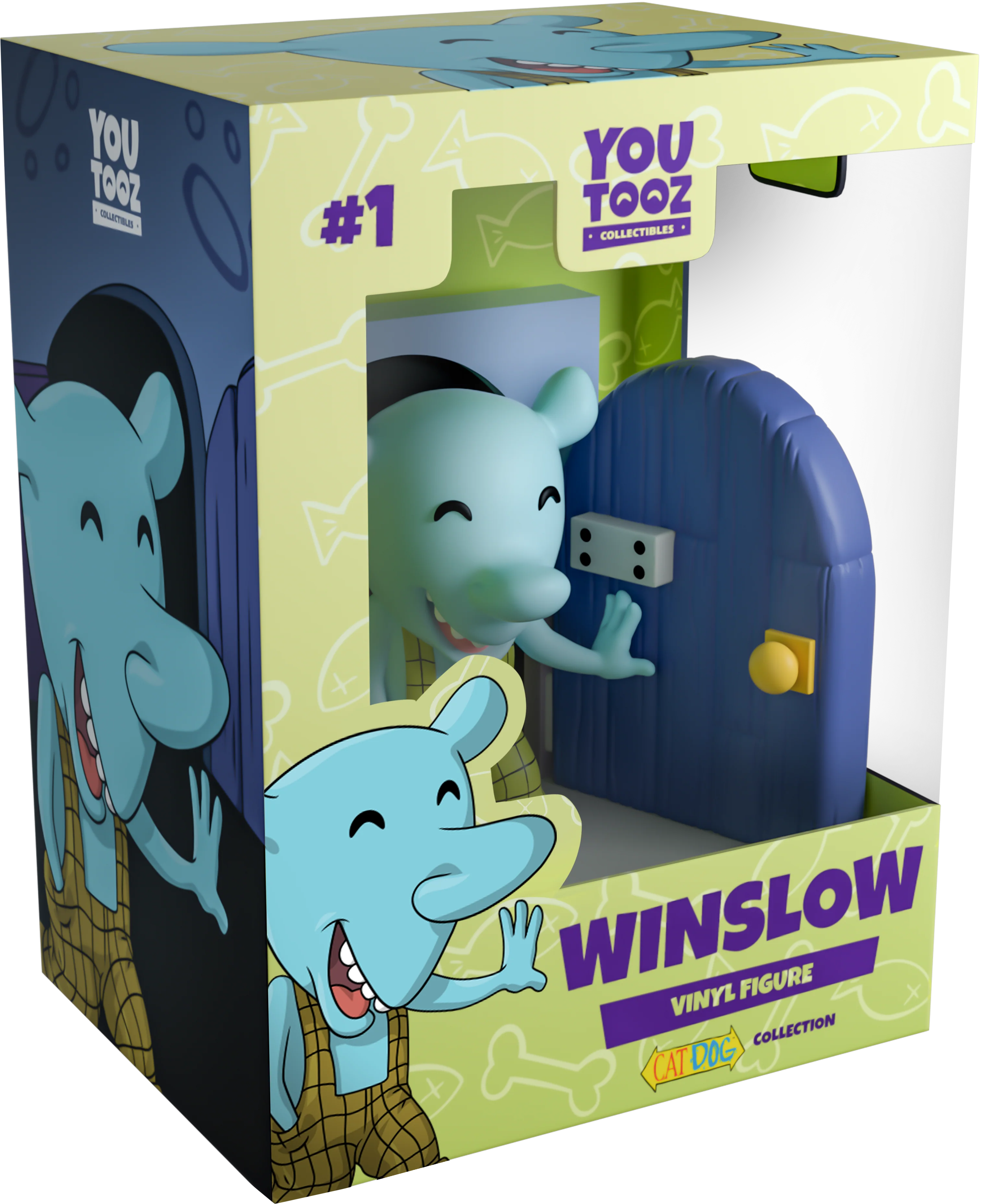 Wearing a bright smile on his face, Winslow makes his entrance standing at 3.6 inches. He is seen walking through his wall hole, with his left hand opening his door and his right hand in his pocket. He is dressed in his original green plaid overalls and purple shoes. The exterior of his window box showcases the wall and front door entrance of where Winslow lives. The interior is a bright green background with a pattern of white bone and fish. The protective sleeve is a purple background with Cat and Dog's torso wiggling across. This collectible ships in a matte, embossed, protective outer sleeve and a custom sized plastic protector for maximum protection during shipping.