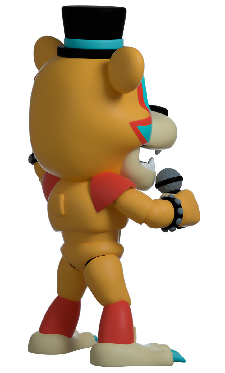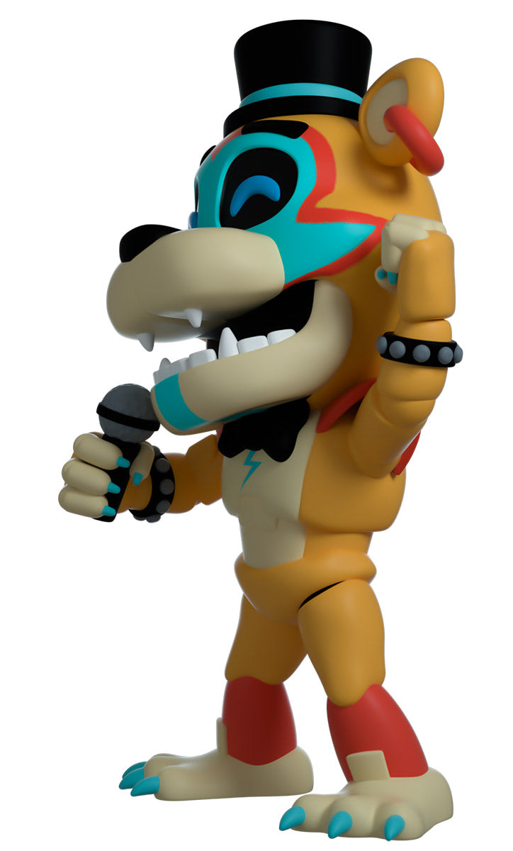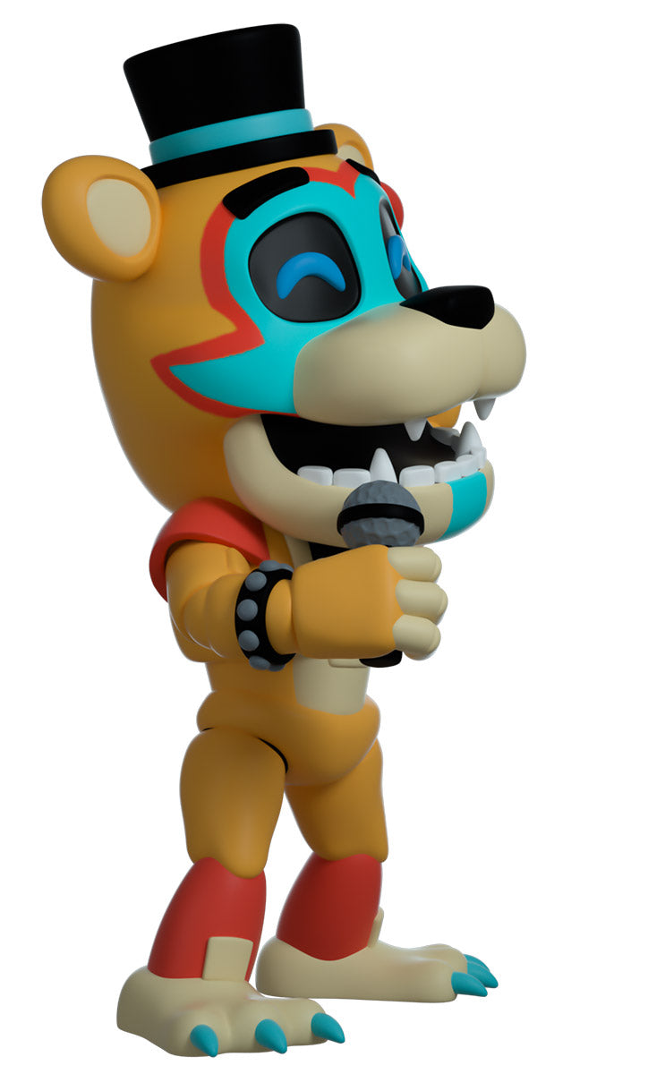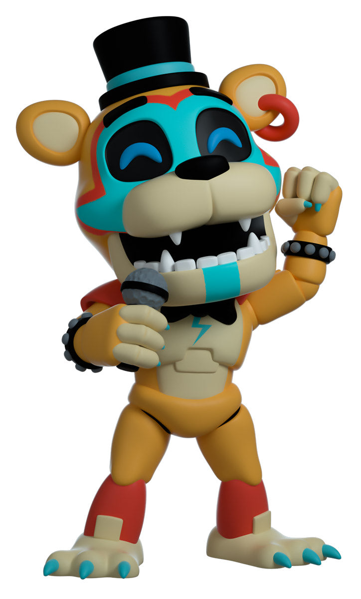Glamrock Freddy stands at 4.7 inches tall showcasing a huge smile on his face. With a microphone in his right hand, he is singing his animatronic heart out. His left hand is stretched upwards in a closed fist position. He is seen wearing a black and blue top hat as well as a black bow tie with a blue lighting symbol across his chest plate. He is accessorized with black studded bracelets on both arms as well as an earring on his left ear. The exterior of his double-walled packaging shows the main lobby area of the Freddy Fazbear’s Mega Pizzaplex, with its checkered floors and a runway leading to the main concert stage. The interior shows a security monitor set up, showing Freddy, Chica, Monty and Roxy through the screens while Vanny stands behind the machine, watching. The protective sleeve shows Freddy, Chica, Monty, and Roxy playing their respective instruments in front of the Security Breach logo. This collectible ships in a matte, embossed, protective outer sleeve and a custom sized plastic protector for maximum protection during shipping.