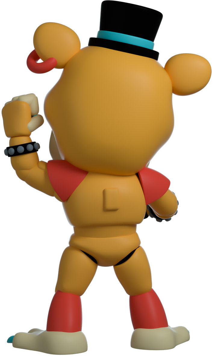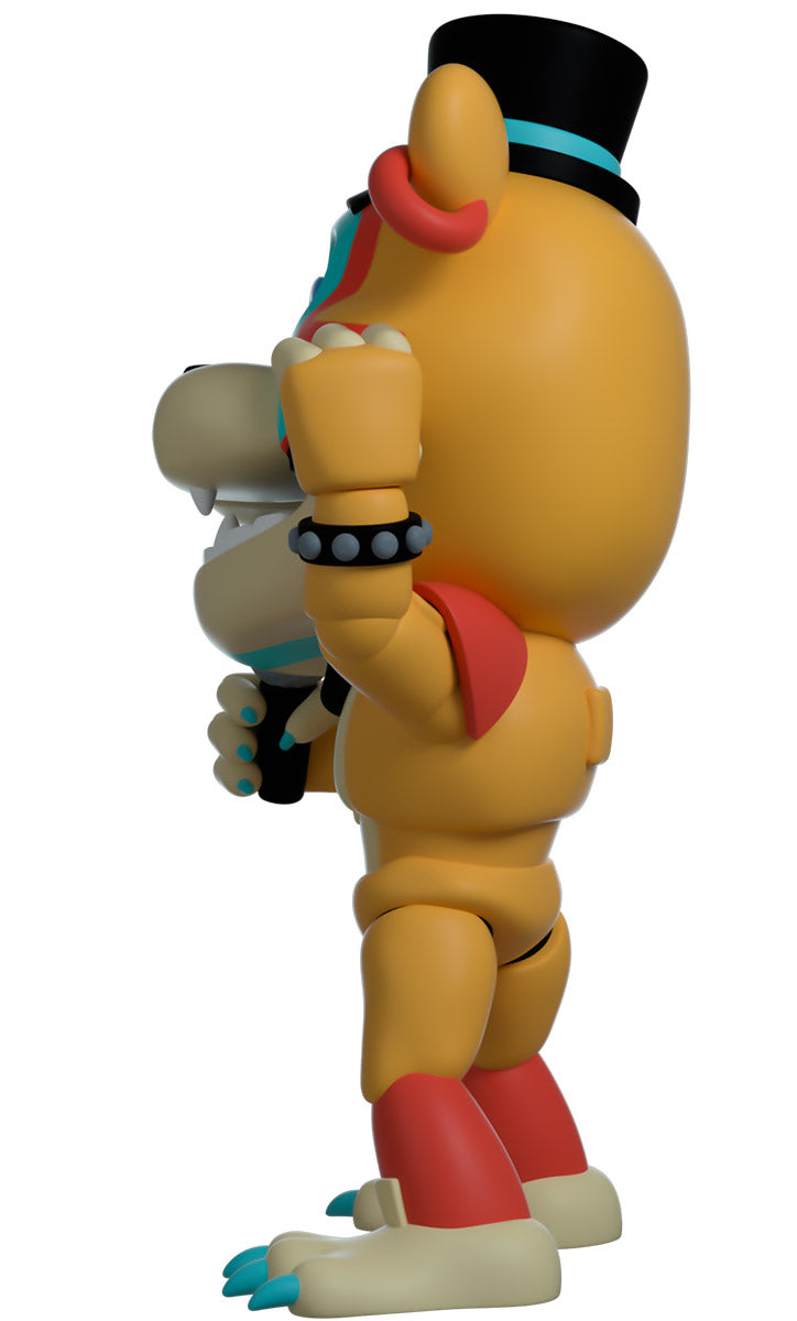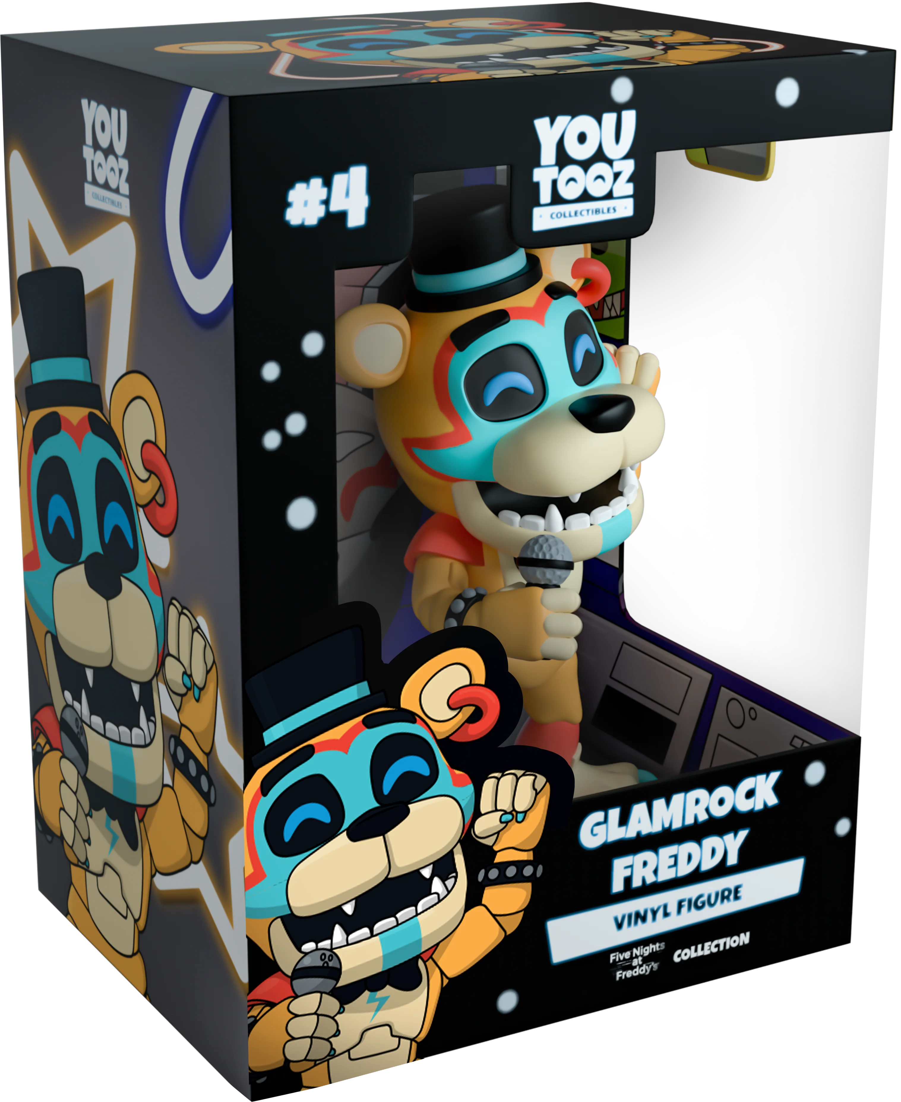 Glamrock Freddy stands at 4.7 inches tall showcasing a huge smile on his face. With a microphone in his right hand, he is singing his animatronic heart out. His left hand is stretched upwards in a closed fist position. He is seen wearing a black and blue top hat as well as a black bow tie with a blue lighting symbol across his chest plate. He is accessorized with black studded bracelets on both arms as well as an earring on his left ear. The exterior of his double-walled packaging shows the main lobby area of the Freddy Fazbear’s Mega Pizzaplex, with its checkered floors and a runway leading to the main concert stage. The interior shows a security monitor set up, showing Freddy, Chica, Monty and Roxy through the screens while Vanny stands behind the machine, watching. The protective sleeve shows Freddy, Chica, Monty, and Roxy playing their respective instruments in front of the Security Breach logo. This collectible ships in a matte, embossed, protective outer sleeve and a custom sized plastic protector for maximum protection during shipping.