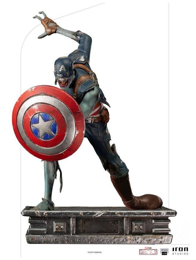 Dragging its left leg because of its fractured ankle, the decrepit creature once known as the first Avenger walks forward on the metal floor of a train car, hungry and in search of its next prey. Even reduced to growling like a primal predator, this creature is still dangerous and lethal thanks to the fighting instinct and Super Soldier serum that still remains within him. Even as a zombie, the creature still knows how to use its legendary shield. Sideshow and Iron Studios present the "Zombie Captain America 1:10 Art Scale Statue," derived from the Marvel Studios animated series What If...? on the Disney+ streaming service.