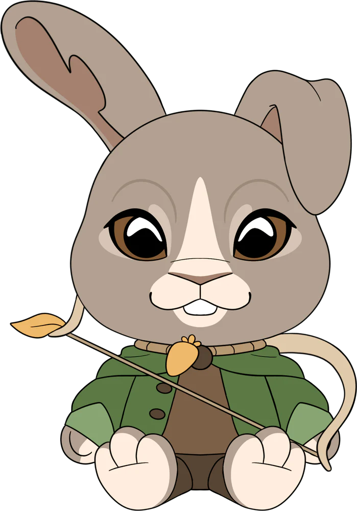 Finneas has Youtooz in his sights! What for? His plush debut of course! Sitting at 9 inches tall with his trust bow slung over his shoulder and wearing a golden carrot from the rope around his neck, small buck teeth shine out from a smiling light muzzle as his deep brown eyes stare forward. With a pair of long ears sticking out from the top of his head, he wears an open green hooded cloak over a brown shirt as his little bunny feet are kicked forward. This plush is packed to the seams with 100% PP cotton and is made of a mixture of minky and felt materials, absolutely perfect for cuddling or shooting targets with!