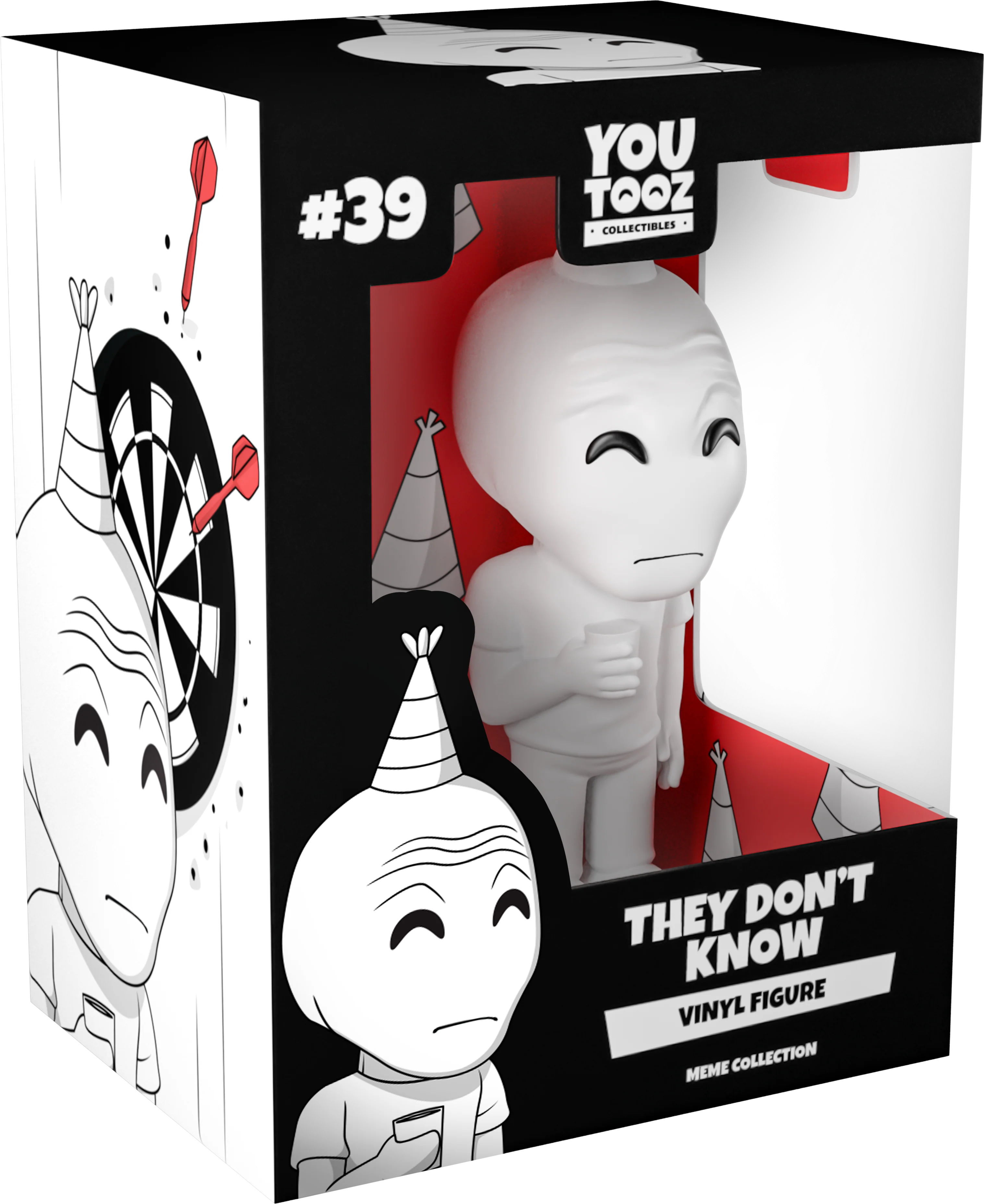 Born to feel. I wish I was home right now. The music is too loud and people don’t want me here. Oh wait, you do? That’s cool, you like video games? The feel guy debuts as a Youtooz collectible figure standing 4.9 inches in height. Ripped out of the internet and into the palm of your hand, he is pure white, wearing a party hat and holding a cup, with a somber expression on his face. The double-walled window box is illustrated using black and white colors, showing him standing in the corner of a house party. This collectible ships in a matte, embossed, protective outer sleeve.