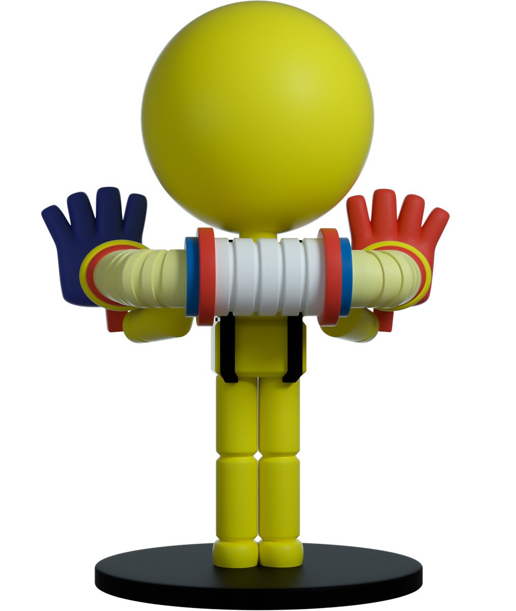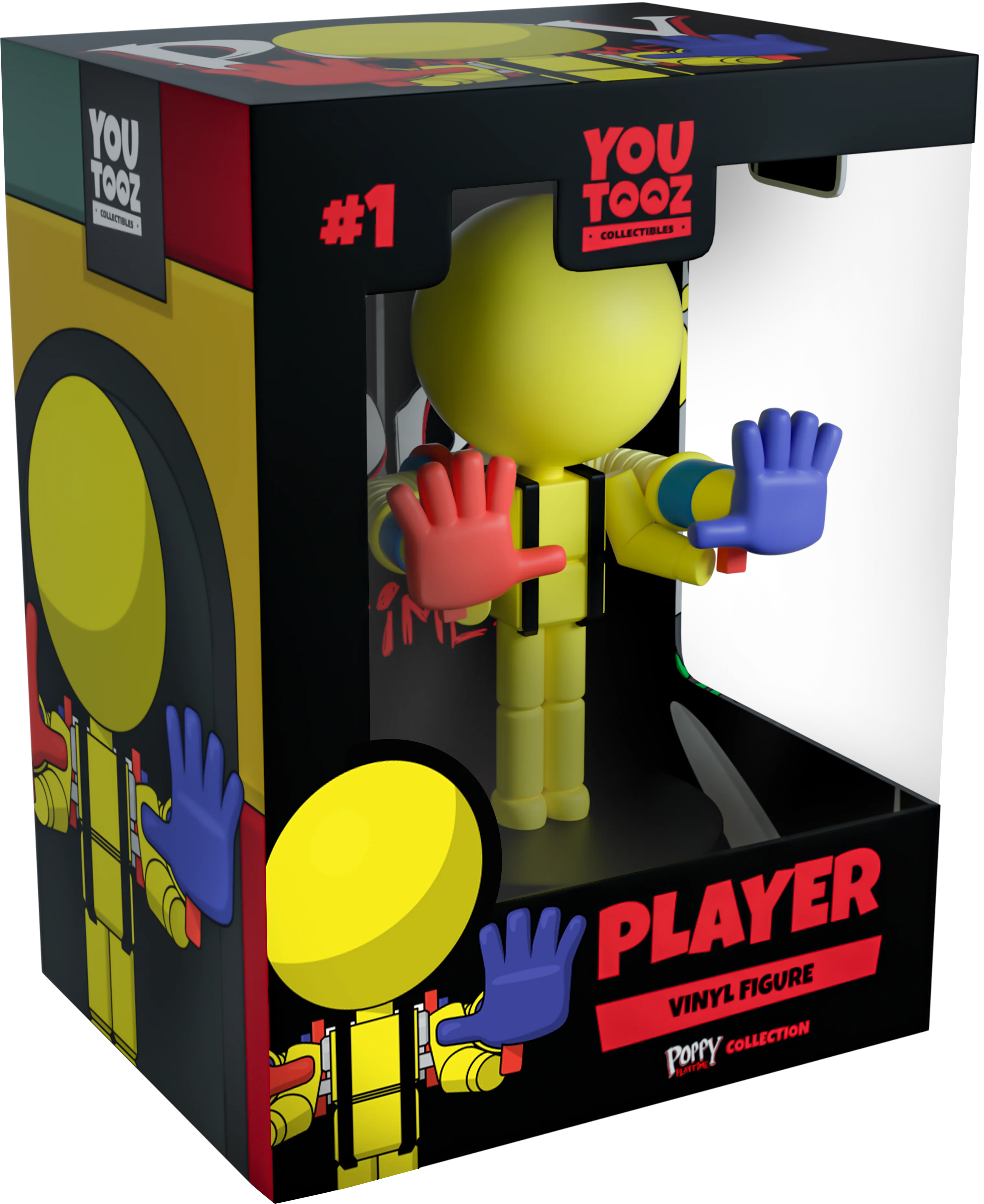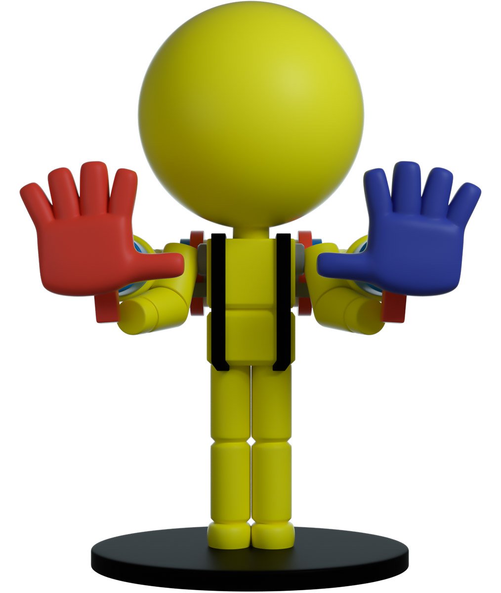 Player stands at 4.7 inches, ready to find out what really happened at the toy factory. The whole body and head are a bright yellow, and they are seen holding a GrabPack with both their hands. Their left hand controls the blue hand and their right hand controls the red hand. The GrabPack is strapped onto the Player using black straps that attach to their chest and back. The exterior of their double-walled packaging shows the inside of the toy factory, with Huggy Wuggy's hand peeking through the door. The interior shows a black background with incredibly sharp teeth, saliva dripping down from them. The protective sleeve shows the outside of the toy factory in an all red colorway. This collectible ships in a matte, embossed, protective outer sleeve and a custom sized plastic protector for maximum protection during shipping.
