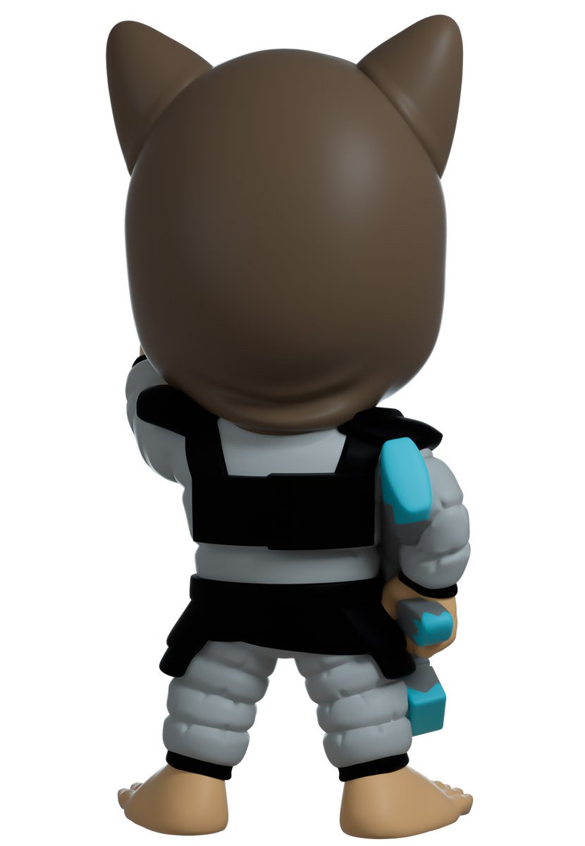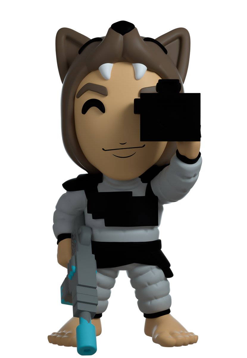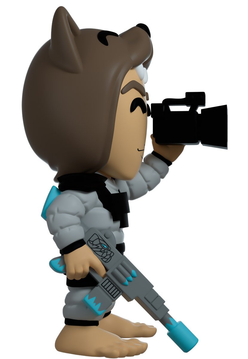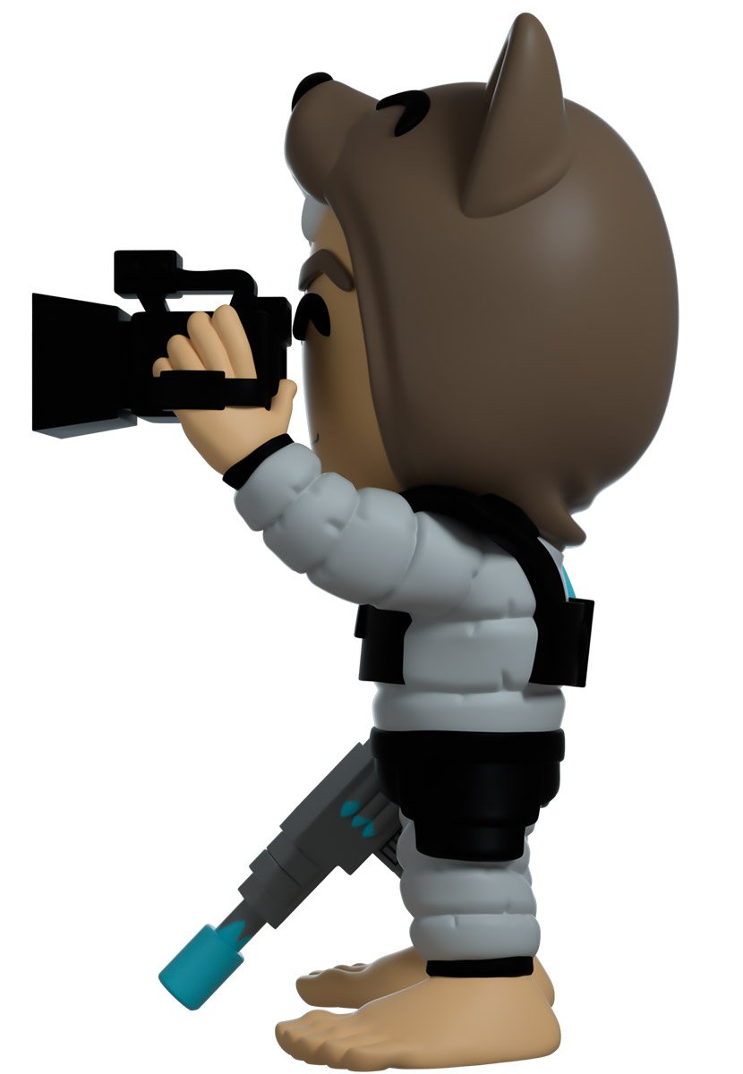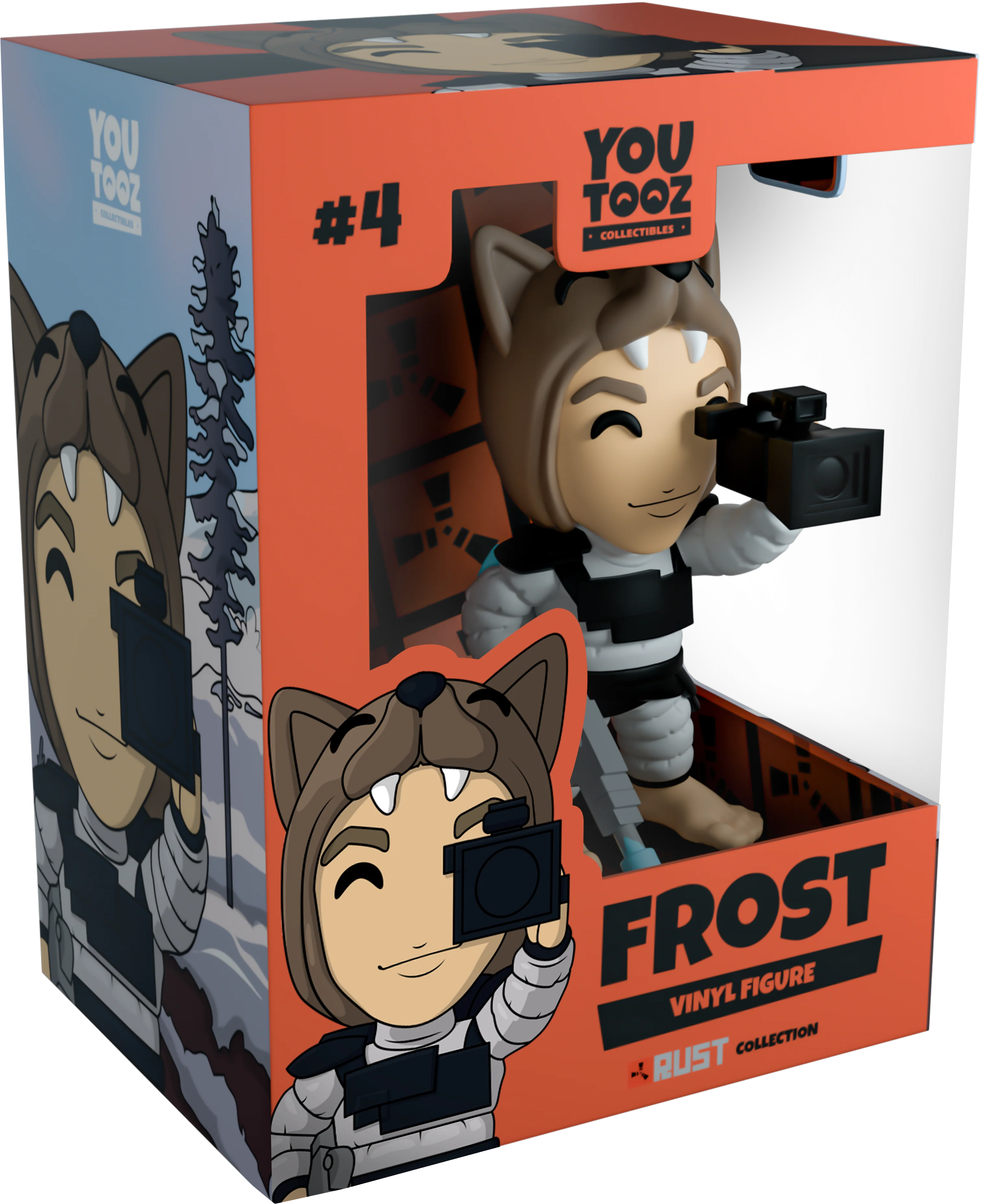 Always comfortable and always filming Frost debuts his first Youtooz! At 4.7” tall with a black video camera held up to one eye and a slight smirk across his face, he wears a brown bear hood which practically swallows his head leaving fangs protruding over his forehead. His body is covered in an insulated puffy light grey suit, with his bare hands and feet exposed to the elements. He’s further protected by a black tactical vest across his chest and shoulders, and black waist armor. In his right hand he flaunts a grey assault rifle tipped with a superb frost blue barrel and stock. This is an official collaboration between Youtooz, Frost and Rust. The exterior of his packaging shows Frost filming atop a rocky snow covered mountain. While the interior is a repeating pattern of the Rust logo. The protective sleeve shows a scenic sunset casting light over a decaying water tower nestled amongst an autumn browned forest.