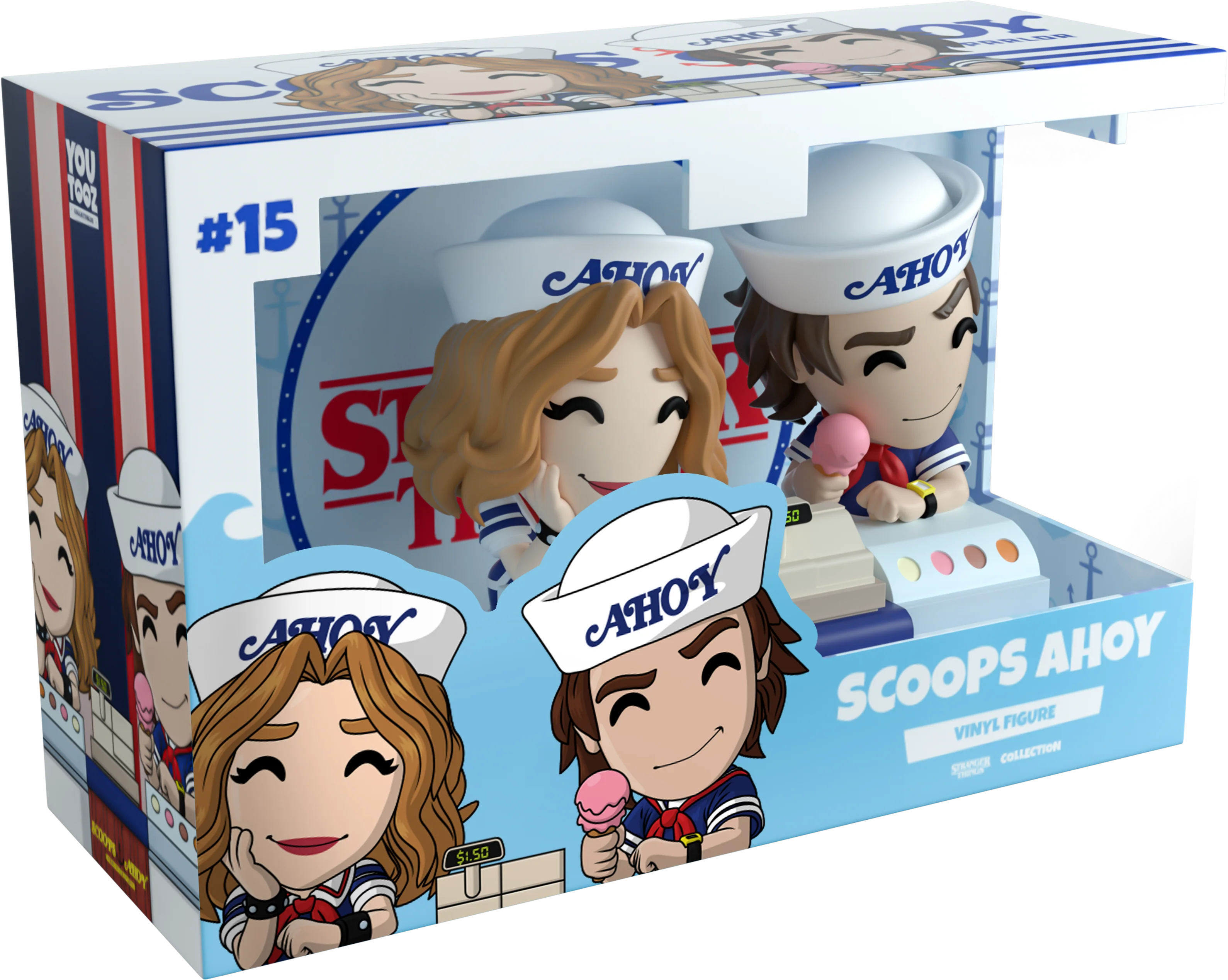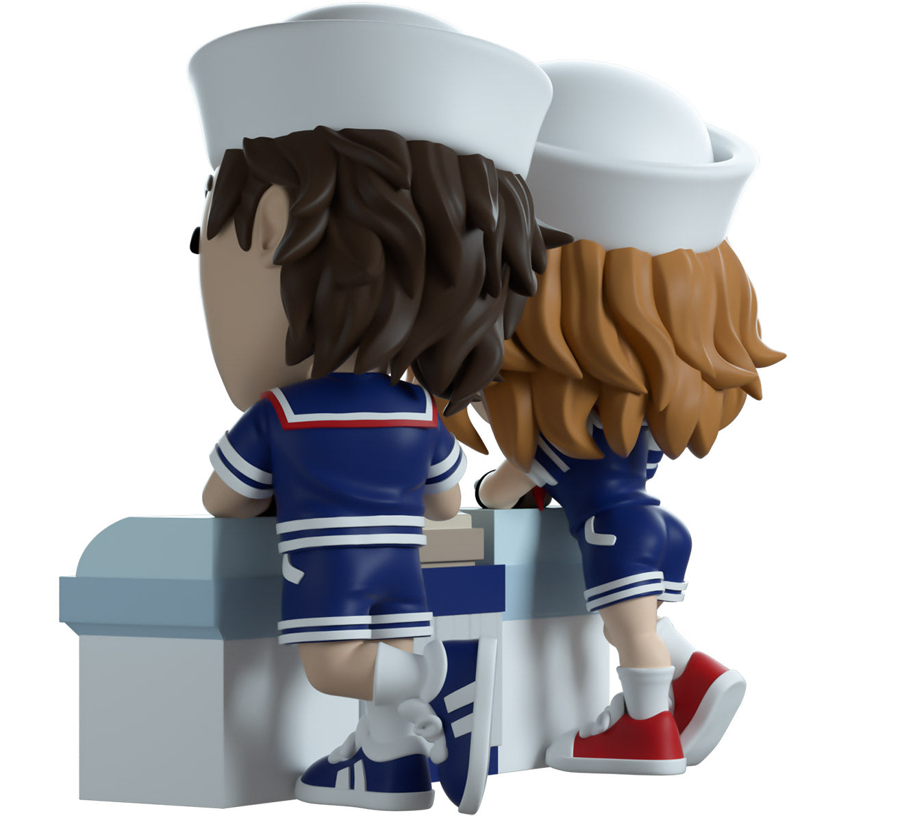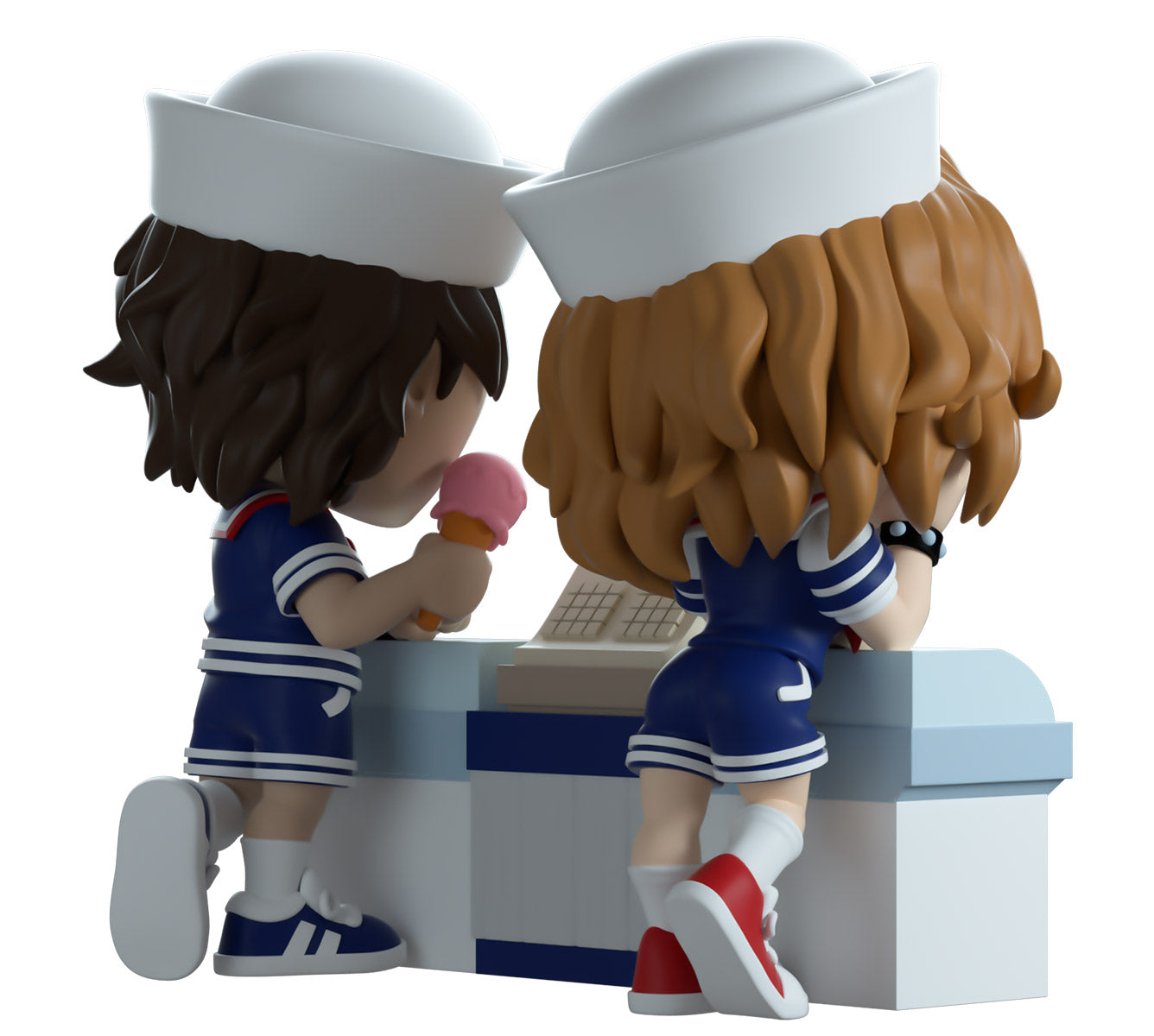 Steve and Robin are here to serve up a delicious scoop of ice cream as America’s favorite place to cool down arrives at Youtooz! At 5 inches tall, the pair lean forward with their arms resting on the top of the long ice cream cabinet and stand on either side of a beige cash register as they wear matching blue and white sailor uniforms with red neck ties and white hats with ‘ahoy’ written on the front. With a raised eyebrow and a slight smirk, Steve holds out a pink ice cream cone in his right hand while Robin’s long locks of wavy brown hair frame her smiling red lipped face which rests on her right hand. The exterior of their packaging sees the duo waiting to serve up a delicious treat within the striped walls of Scoops Ahoy, while the interior is a series of anchors over a light blue background. The protective sleeve is a light blue wave pattern over a stark white as their figure can be seen through the large clear display window at its front. This collectible ships in a matte, embossed, protective outer sleeve and a custom sized plastic protector for maximum protection during shipping.