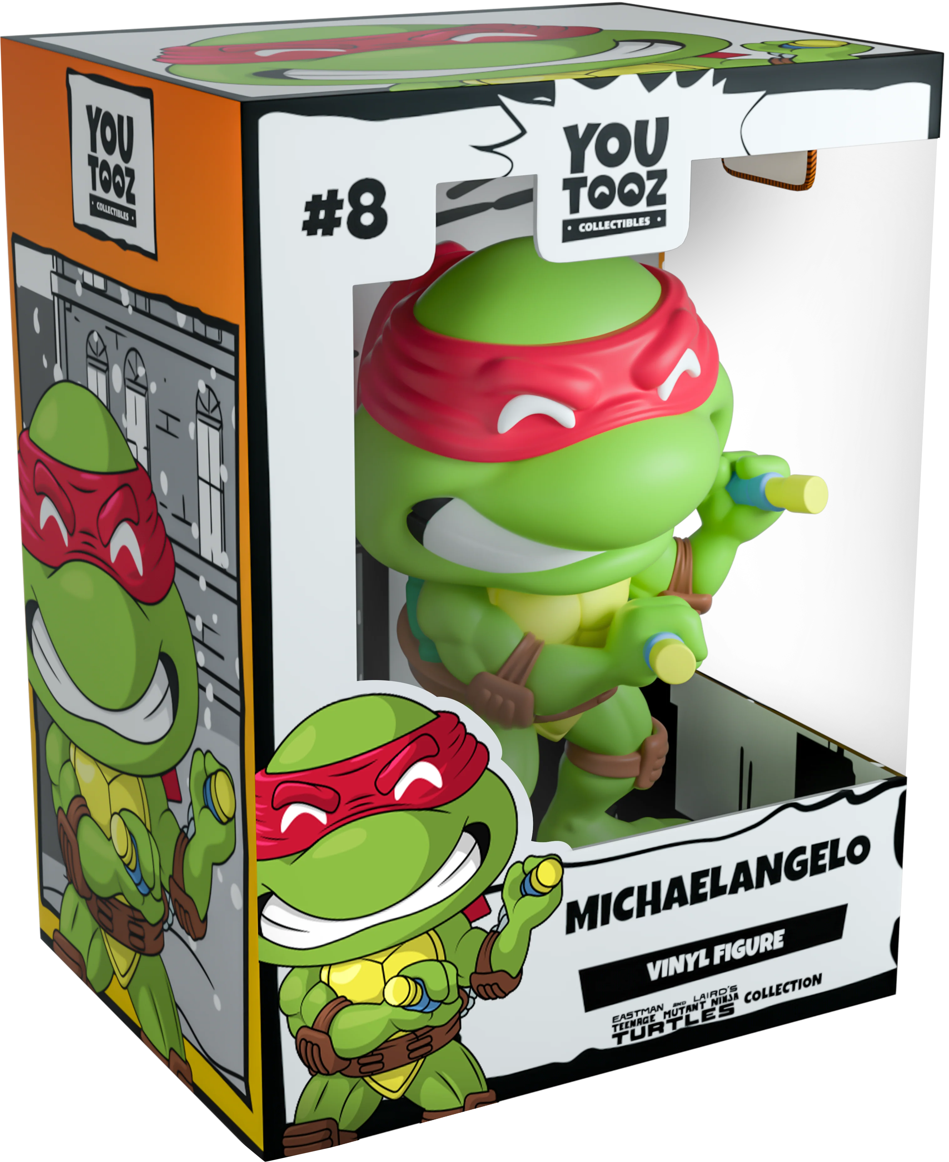 Michelangelo returns to Youtooz wearing a vibrant red mask to match his brothers in this classic throwback to when the turtles began their fight against evil! Standing at 4.3 inches tall, concentrating for battle with furrowed brows and bared teeth, he’s posed holding knunchucks wrapped around his arm at the ready to unleash a deadly blow! Dressed for battle with nothing weighing him down, he wears a simple brown strap around his green and yellow waist as well as protective knee and elbow guards. The exterior of his packaging sees a toy truck with its doors flung open revealing a mountain of goods and a lone cat. The interior is the silhouette of a city skyline reflecting off the lake at its front while the protective packaging has him posing in front of a comic book-esque panel as his figure can be seen through the large clear window at its front. This collectible ships in a matte, embossed, protective outer sleeve and a custom sized plastic protector for maximum protection during shipping.