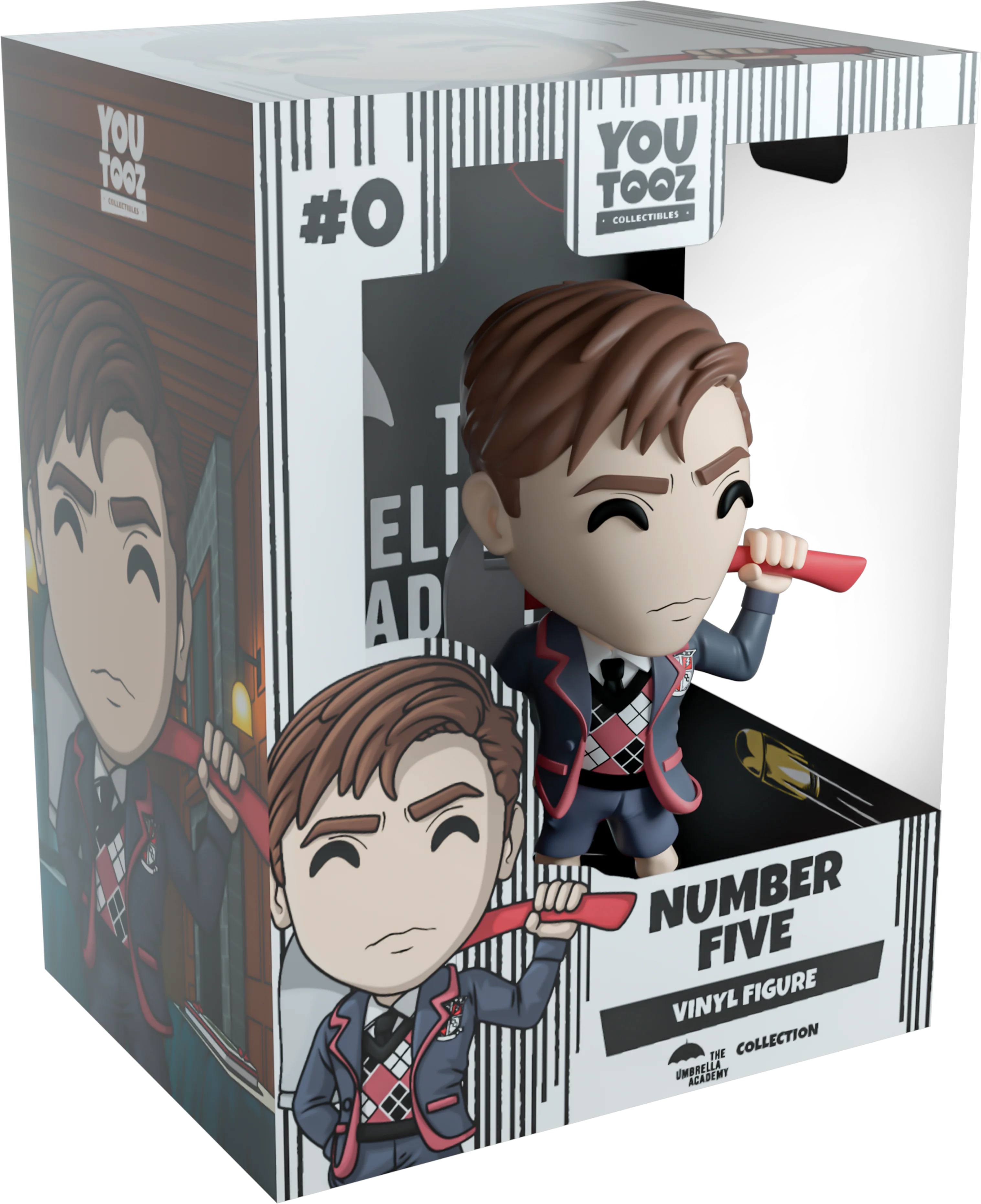 Number Five has done the calculations and travelled forward (or backward?) to 2024 for their Youtooz debut! Standing at 4.6 inches tall with a red-handled fire axe swung over his shoulder casually and one hand resting in the pocket of his shorts, a stern look crosses his face with thin pursed lips as his short brown hair is swept over to the side with its fringe curling down onto his forehead. Always looking smart, he wears a dark blue blazer over a black, red and white argyle vest along with a white shirt and tie, while his long black socks feed into laced dress shoes. The exterior of his packaging sees Number 5 standing on a wooden desk after laying waste to a room full of people. The interior of his packaging is a stark black covered in red and white flying bullets, knives, umbrellas and crosshairs which continues onto the protective sleeve where his figure can be seen through the large clear window at the packaging’s front. This collectible ships in a matte, embossed, protective outer sleeve and a custom-sized plastic protector for maximum protection during shipping.