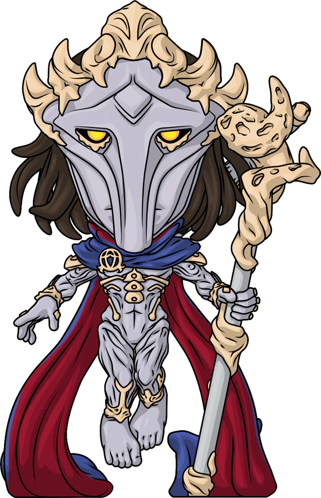 We’ve been developing something secret here at Youtooz recently and there’s only one brilliant mind we could ask to help us finish it! Floating at 5 inches tall with a blue and maroon cloak falling from his shoulder in two thick curling stands to rest on the ground, his yellow eyes stare through a solemn masked face which has bone-esque spikes emerging from its top. Gripping a staff with a spiralling end in his left hand, a long arm emerges from the back of his thin grey body to reach forward with a trio of armoured fingers. The exterior of his packaging is covered in pale bubbles which work their way onto the interior as bright red and blue strings stretch across them. The protective sleeve is then a dark blue with a simple golden frame as his figure can be seen through the large clear window at the packaging’s front. This collectible ships in a matte, embossed, protective outer sleeve and a custom-sized plastic protector for maximum protection during shipping.