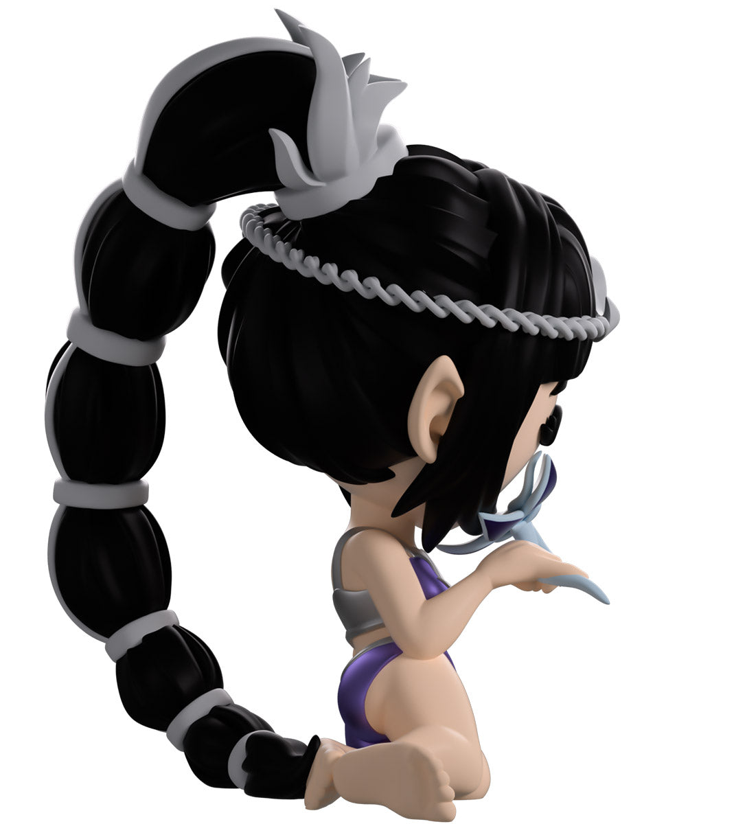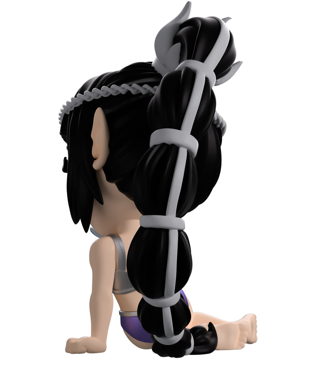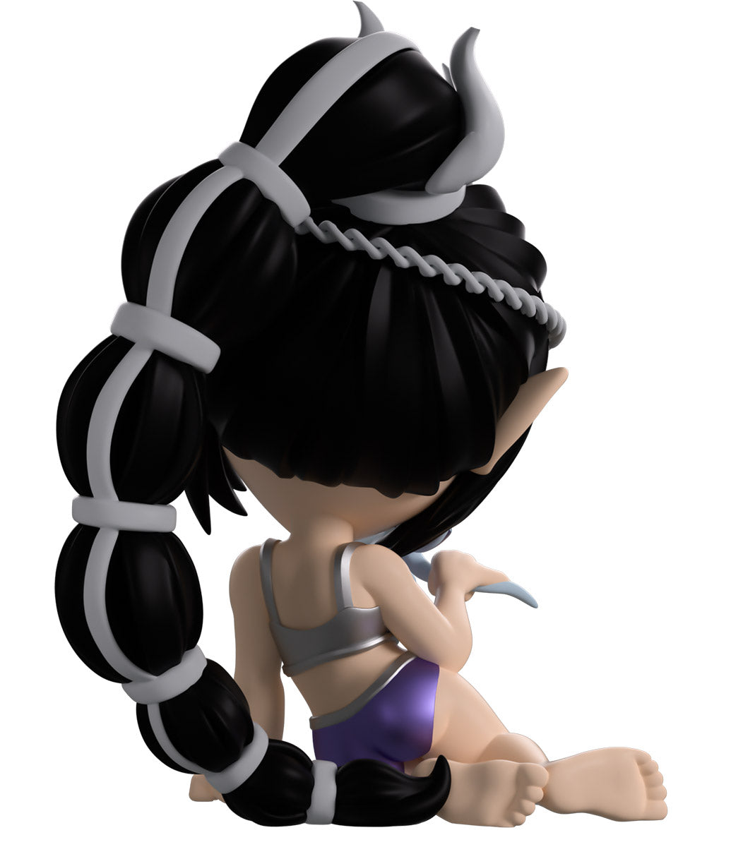 Shadowheart has returned to Youtooz to treat you to a night full of flirting! (and maybe some swimming!) Lying relaxed on her side at 4.2 inches tall as she props herself up with a right hand and holds a Night Orchid to her smiling face, a thin scar runs across her cheek as a silver circlet wraps around long black hair curls in a thick ponytail behind her. With a warm smile and shadowed eyes, she wears a purple two-piece outfit with grey trimming that leaves her midriff and legs exposed. The exterior of her packaging sees her surrounded by flowers in a dark thicket, while the interior is covered in floating red petals over a pink background. These then flow onto the protective sleeve where her figure can be seen through the large clear window at the packaging’s front. This collectible ships in a matte, embossed, protective outer sleeve and a custom sized plastic protector for maximum protection during shipping.
