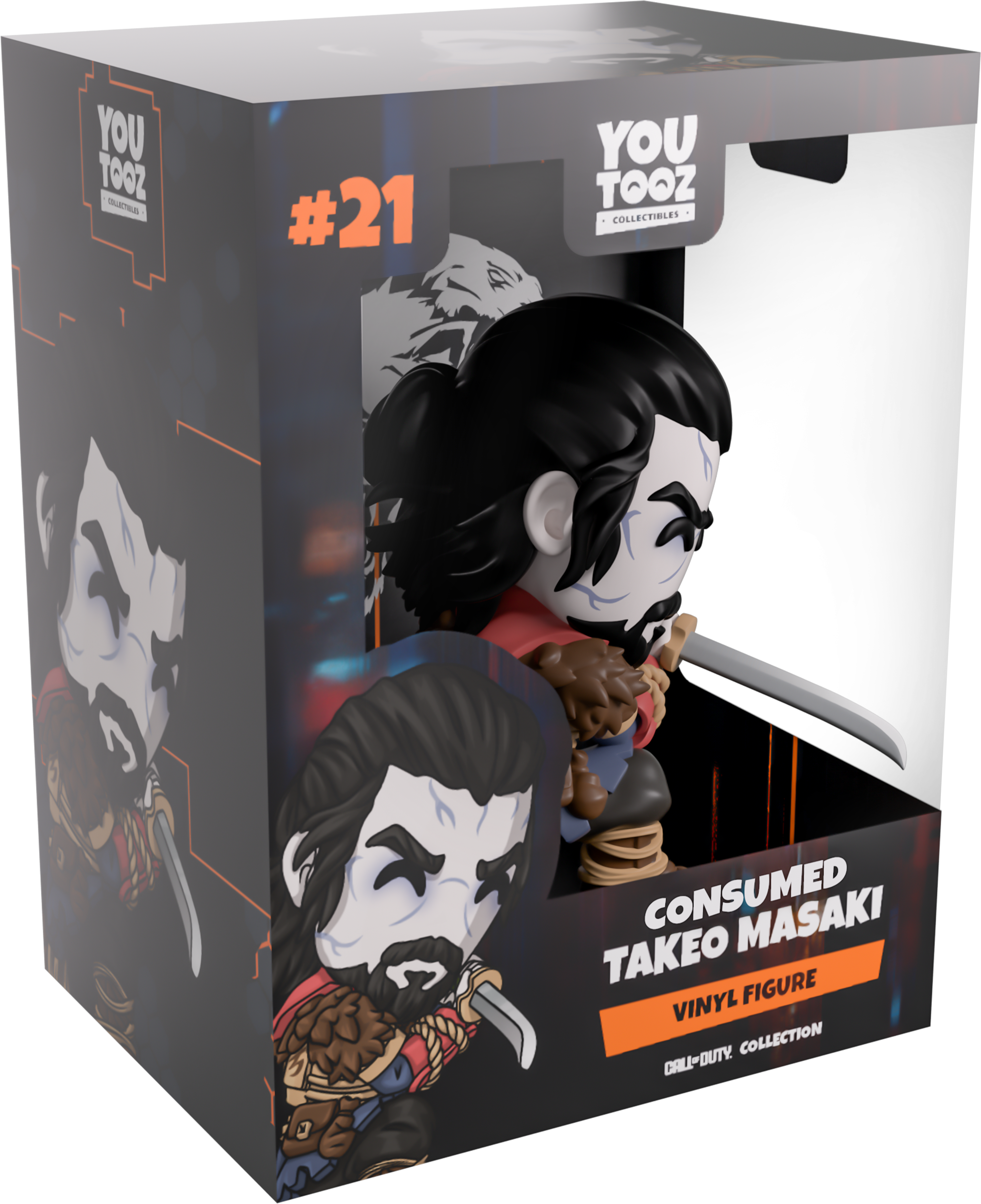 Takeo Masaki has arrived at Youtooz to show us exactly what honour is with his Youtooz debut! Crouching at 4.2 inches tall and holding the tip of his katana forward with bent arms as he readies to thrust it into the next zombie that gets in his way, long black hair is pulled into a messy bun at the back of his head as blue veins cover his pale face, and furrowed brows rest over shadowed eyes. With a red scarf wrapped around his neck over brown fur as light armour covers his torso, the ends of his tattered blue kimono hang over black pants that tuck into brown boots. The exterior of his packaging is covered in a grey hexagonal pattern with bright orange highlights, while the interior is filled with a warping dark camouflage. The hexagons then continue onto the protective sleeve that has grainy vertical blue and orange stripe,s as his figure can be seen through the large clear window at the packaging’s front. This collectible ships in a matte, embossed, protective outer sleeve and a custom-sized plastic protector for maximum protection during shipping