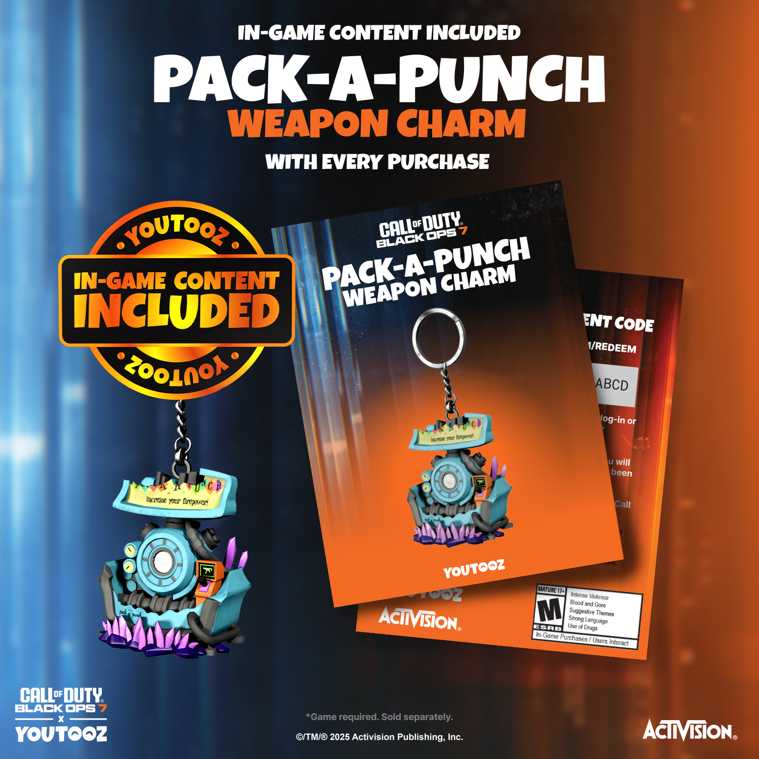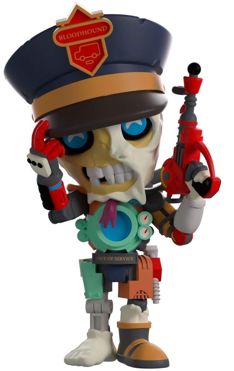 All aboard! T.E.D.D.’s arrived at Youtooz to give you the ride of your life!... Or death! Standing at 5 5 inches tall and tipping his Bloodhound service hat forward as he grips the brim with bright red fingers, synthetic skin peels off his face to reveal a broken smile and bright blue eyes in hollow sockets, along with a trio of switches on the back of his head. Raising a Ray gun in his right hand, his body has been pieced together with an amalgamation of mechanical parts as a teal portal covers his chest and a large grey booster is attached to his back. The exterior of his packaging is covered in a grey hexagonal pattern with bright orange highlights, while the interior is filled with a warping dark camouflage. The hexagons then continue onto the protective sleeve that has a grainy vertical blue and orange stripes, as his figure can be seen through the large, clear window at the packaging’s front. This collectible ships in a matte, embossed, protective outer sleeve and a custom-sized plastic protector for maximum protection during shipping.