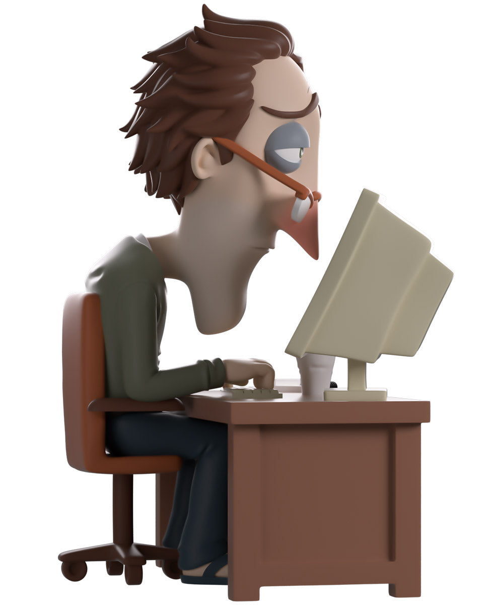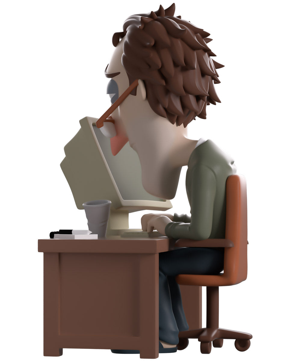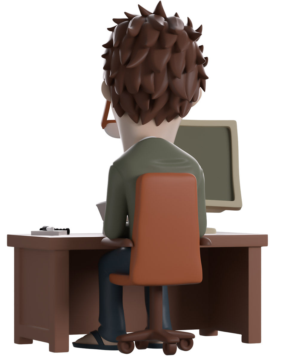 We managed to drag Charlie away from his busy, suuuuper important, work for a Youtooz debut! Wait… Is he working again!? Sitting at 4.7 inches tall and drearily obsessed with his work as he hunches towards the bleak computer monitor on the wooden desk at his front, orange glasses fall down his long nose as his eyebrows raise apathetically over half-lidded eyes and messy brown hair is slicked back. Wearing a mossy green sweater and blue jeans along with sandals, his slumped posture really emphasizes how truly exhausted he is. The exterior of his packaging sees him gloomily working away in a pale-lit room, while the light green interior is covered in a pattern of bugs and vines. The protective sleeve is then pitch black with white stitching running around it as her figure can be seen through the large clear window at the packaging’s front. This collectible ships in a matte, embossed, protective outer sleeve and a custom-sized plastic protector for maximum protection during shipping.