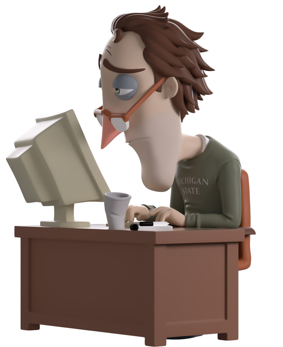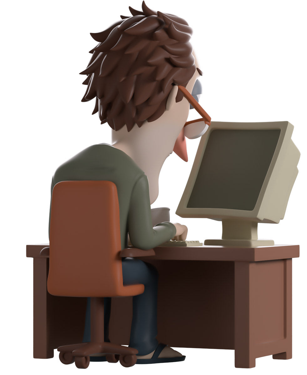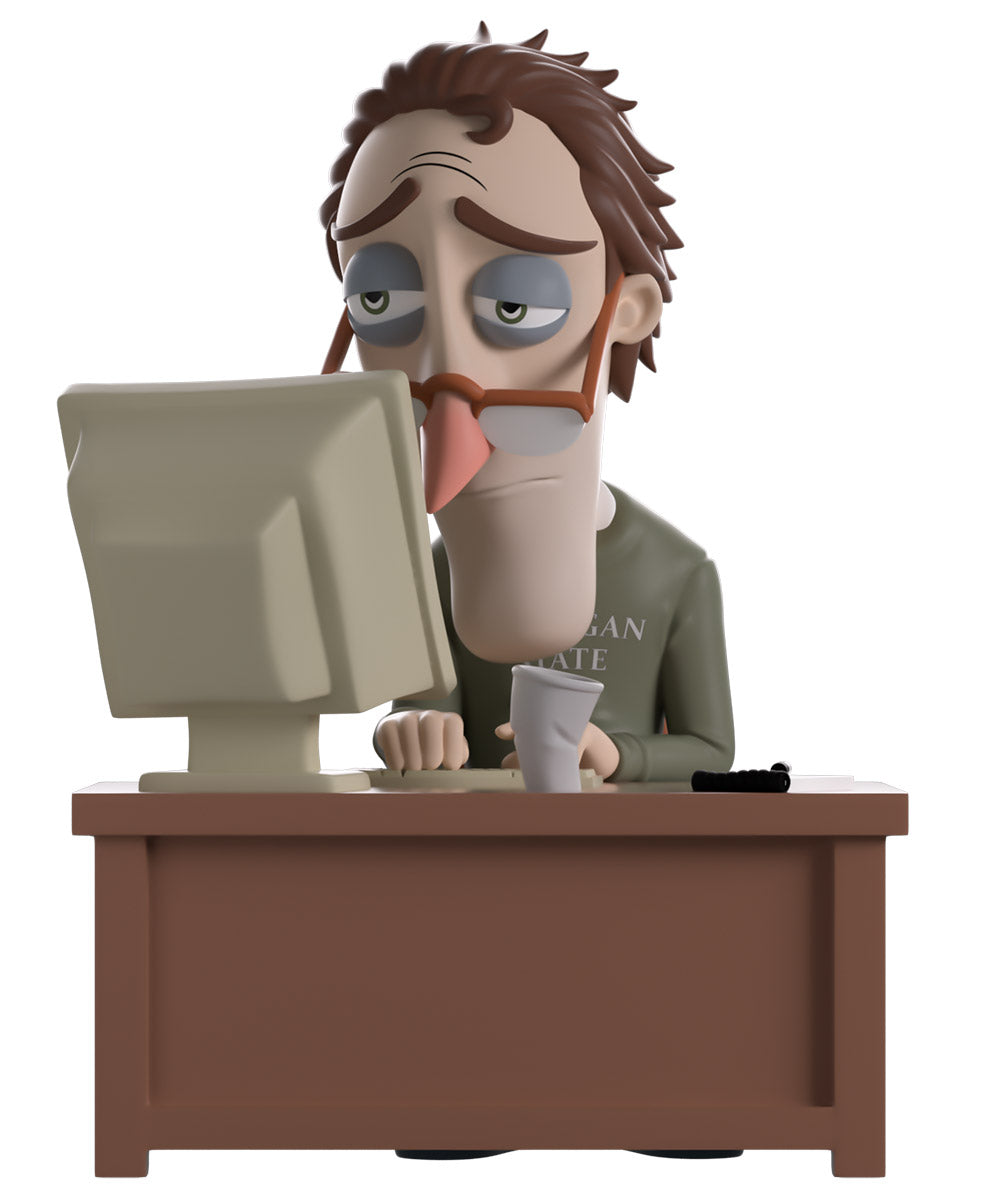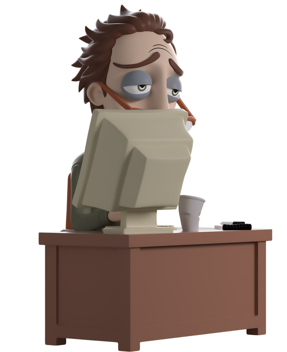 We managed to drag Charlie away from his busy, suuuuper important, work for a Youtooz debut! Wait… Is he working again!? Sitting at 4.7 inches tall and drearily obsessed with his work as he hunches towards the bleak computer monitor on the wooden desk at his front, orange glasses fall down his long nose as his eyebrows raise apathetically over half-lidded eyes and messy brown hair is slicked back. Wearing a mossy green sweater and blue jeans along with sandals, his slumped posture really emphasizes how truly exhausted he is. The exterior of his packaging sees him gloomily working away in a pale-lit room, while the light green interior is covered in a pattern of bugs and vines. The protective sleeve is then pitch black with white stitching running around it as her figure can be seen through the large clear window at the packaging’s front. This collectible ships in a matte, embossed, protective outer sleeve and a custom-sized plastic protector for maximum protection during shipping.