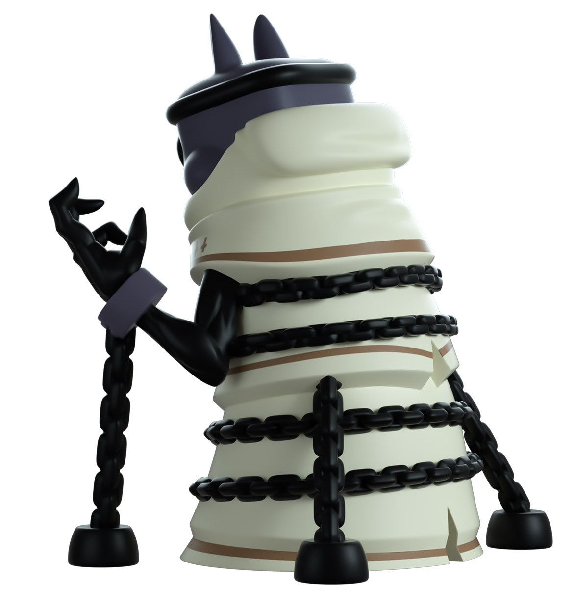 Standing at 4.4 inches tall draped in thick white robes with a large red streak cascading over his body, his spindly black hands are raised upward and shackled at the wrists with chains fixing them to the ground. With sharp pointed ears and a black band around his head, his sullen face stares downwards with a trio of glowing red eyes as a series of black chains wrap around his body to restrain him. The exterior of his packaging sees a solitary pentagram etched into the ground. While the interior is a vibrant blood splatter littered with symbols over an off-white background. The protective sleeve continues this off-white, with crosses and chains affixed to the ground and being pulled into the sky as his figure can be seen through the large clear window at the packaging’s front. This collectible ships in a matte, embossed, protective outer sleeve and a custom-sized plastic protector for maximum protection during shipping.