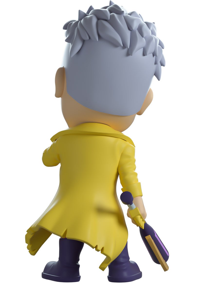 The Trickster is here to make his stylish (and terrifying!) debut! Standing at 4.7 inches with his undercut grey hair is shaved at the sides and is slicked up in thick points, glowing yellow eyes shine through dark makeup as he raises his hand to wipe the bright blood off his face. With a devilish smile that curls up at each end and holding a deadly bladed purple bat outwards in his right hand, he wears a long tattered yellow trench coat over a shirtless blood smeared chest while his tight red and yellow pants are tucked into tall purple boots. The exterior of his packaging sees Trickster in front of a purple backdrop of abandoned buildings. While the interior is a black silhouetted forest with a glowing red and blue haze and the white ‘Dead by Daylight’ logo at its back, This grim motif then continues onto the protective sleeve with dark trees surrounding it completely as the figure can be seen through the large clear window at its front. This collectible ships in a matte, embossed, protective outer sleeve and a custom sized plastic protector for maximum protection during shipping.