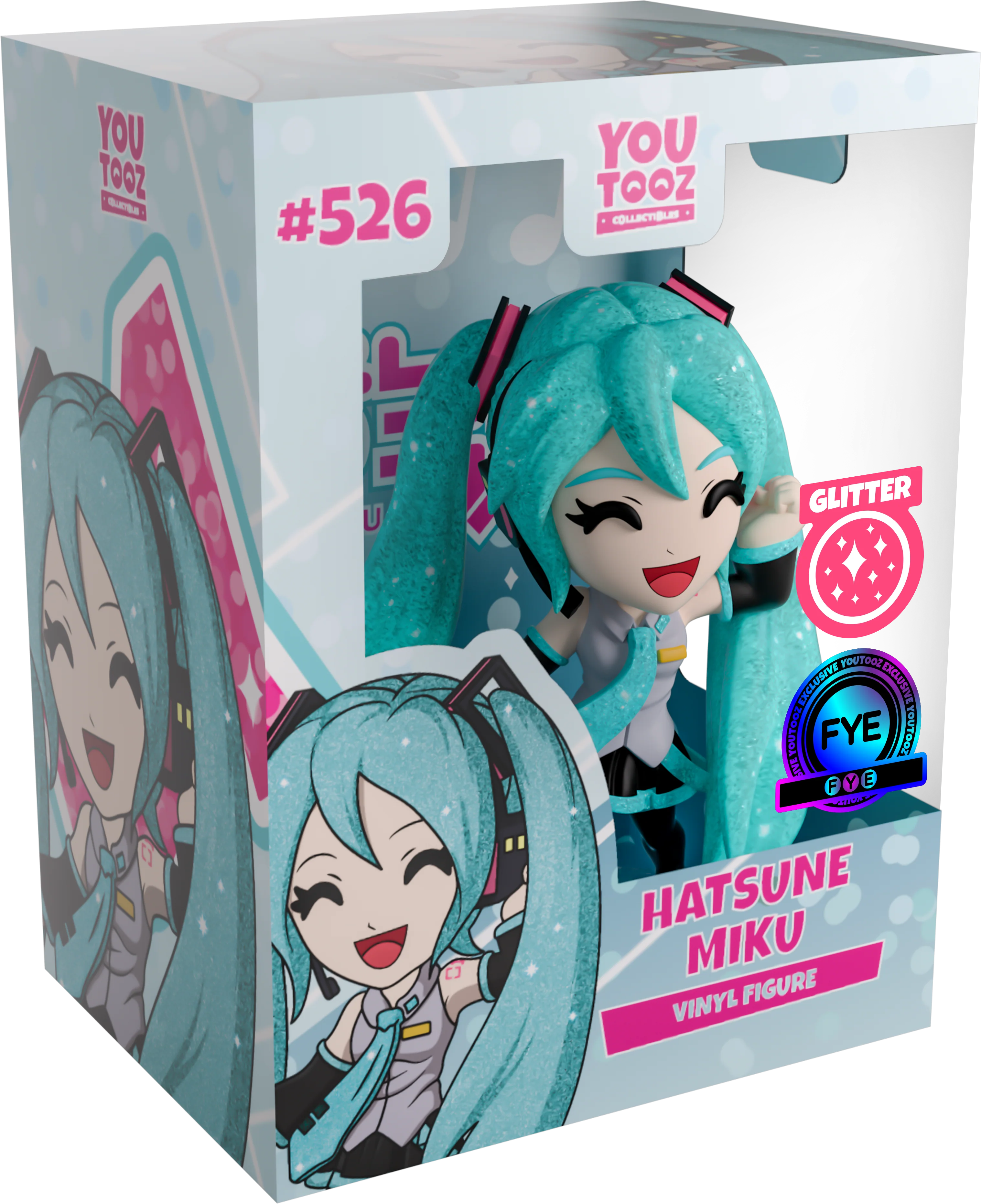 It’s time for an encore with Hatsune Miku’s return to Youtooz for her second vinyl figure! Standing at 4.5 inches tall, her iconic blue has received an amazing glitter treatment to shine dazzingly as the light hits it! Her long hair is pulled into large twintails with pink and black square hair clips as it flows down to her ankles and her left hand raised upwards while a huge smile stretches across her face as she’s posed mid-song. Wearing her iconic outfit of a grey sleeveless shirt with blue-green tie and black skirt, she’s accessorized perfectly with a black headset sitting behind her bangs along with black arm sleeves and boots while her red ‘01’ code can be seen on her upper left arm. The exterior of her packaging is a pale blue showing the silhouettes of music notes and Miku, while the interior continues the motif of pale blue and polka dots with her Logo in a bright pink behind her. The protective sleeve displays Miku in front of a pink ‘01’ while notes float along a pink and blue wavy music bar and her figure can be seen through the large clear window at its front. This collectible ships in a matte, embossed, protective outer sleeve and a custom sized plastic protector for maximum protection during shipping.