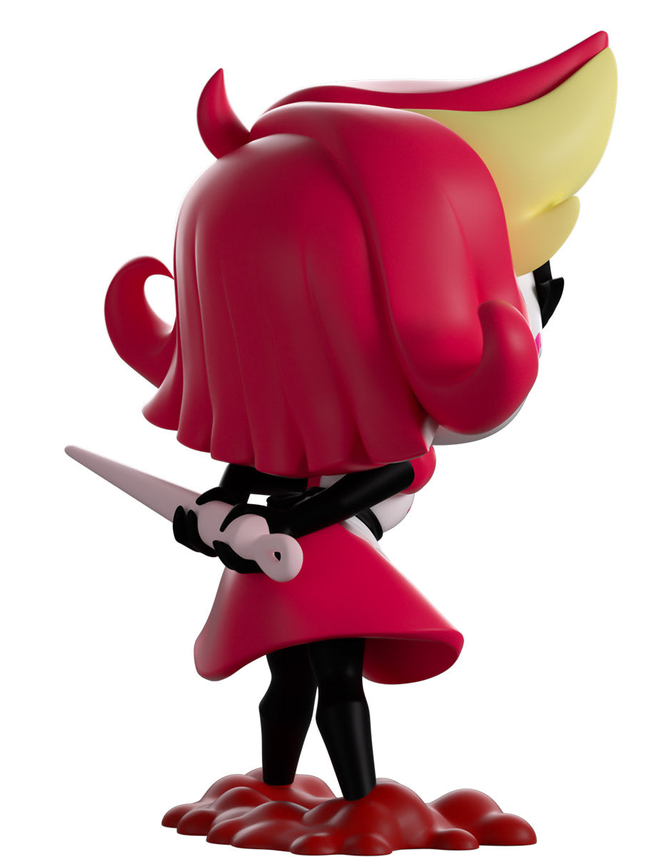 Youtooz has some bugs that need squashing and who better to call than Niffty to clean things up! Standing in a pool of blood and leaning forward 4.9 inches tall with a smile stretching across he white face under a single huge red and yellow eye that looks to the side cheekily. Nifty's arms fold behind her back as she hides the long sewing needle held in her hands. With bright red hair flicking out to either side of her head as a yellow streak marks the fringe, she wears a white apron over her flowing red dress along with a black neckerchief. The exterior of her packaging looks down a hallway of the hotel with a snake-wrapped vase at the front. The interior then mimics the hotel’s maroon wallpaper, while the protective sleeve shows off the city’s silhouette with deep red lights shining from the buildings, as his figure can be seen through the large clear window at the packaging’s front. This collectible ships in a matte, embossed, protective outer sleeve and a custom-sized plastic protector for maximum protection during shipping.