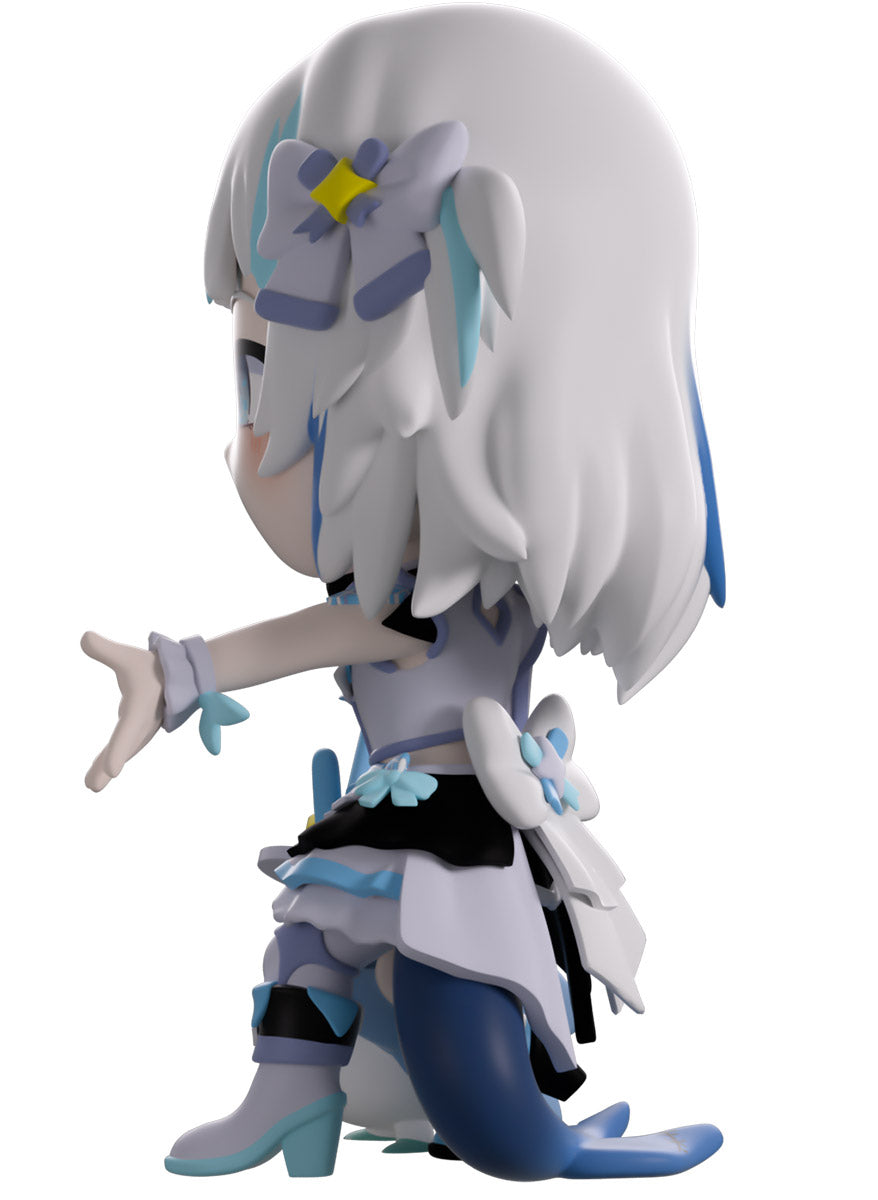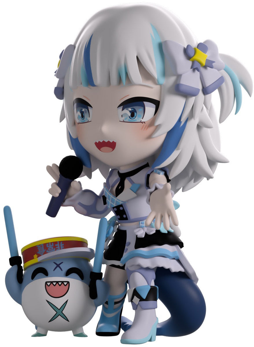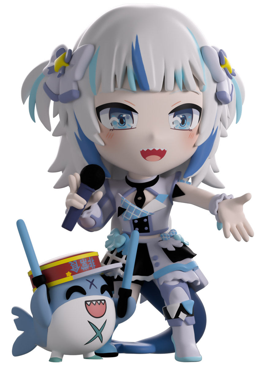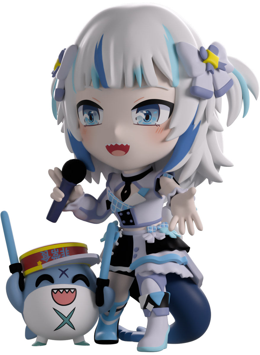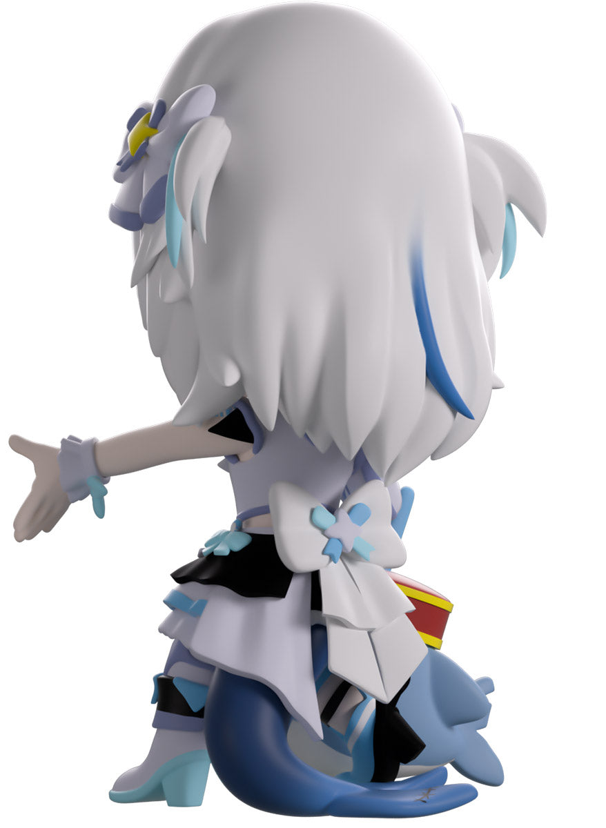 Wait, what’s this? Gawr Gura has swum into Youtooz to make her vinyl debut! Standing at 4.5 inches tall and ready to belt out the sweetest tunes topside of the ocean, her left hand is stretched out welcomingly as the right holds a microphone up to her face. With blushing cheeks, dazzling blue eyes and a cheery open mouth that reveals a small row of sharp teeth, her white and blue streaked hair is topped with a pair of delicate bows and sits in a blunt fringe across her forehead while falling down to just below her shoulders in thick strands. Dressed and accessorized to put on the best show ever, she wears an intricate blue, black and white outfit covered in bows, patterns and frills as her large blue tail rests at her behind and the adorable Bloop cheers her on with a huge smile and their lightsticks raised! The exterior of her packaging is a bright star sending out illuminating rays over a blue and purple background. The interior is a light blue Seigaiha pattern that fades to white and is covered in shining stars which continues onto the protective sleeve as her figure can be seen through the large clear window at the packaging’s front. This collectible ships in a matte, embossed, protective outer sleeve and a custom-sized plastic protector for maximum protection during shipping.