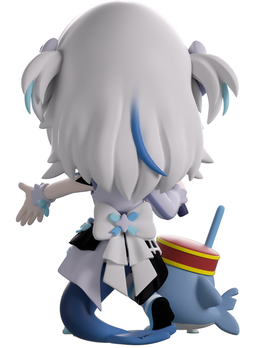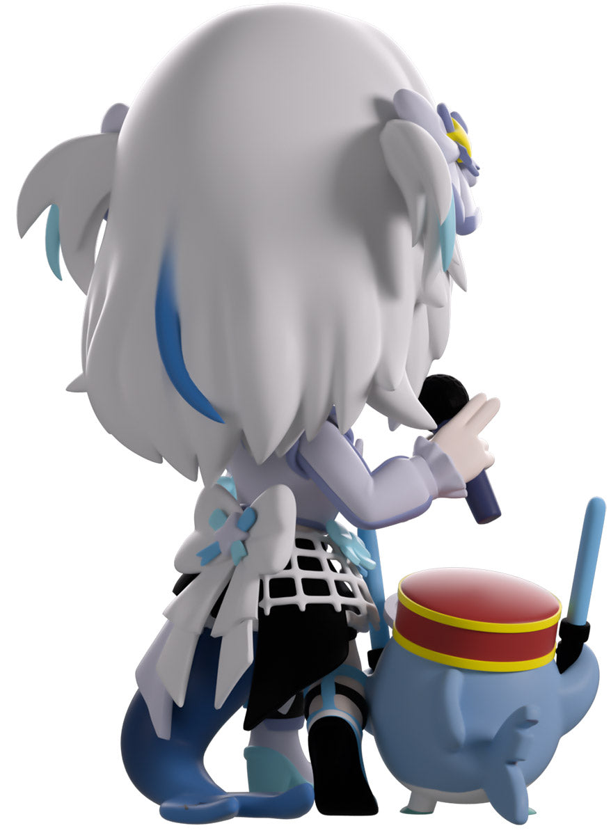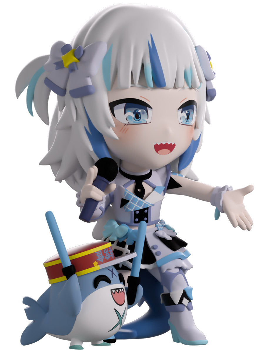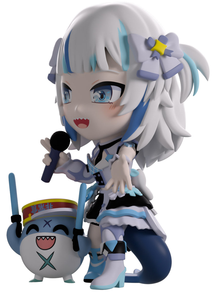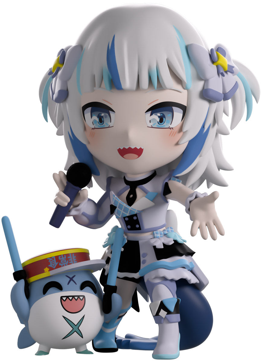 Wait, what’s this? Gawr Gura has swum into Youtooz to make her vinyl debut! Standing at 4.5 inches tall and ready to belt out the sweetest tunes topside of the ocean, her left hand is stretched out welcomingly as the right holds a microphone up to her face. With blushing cheeks, dazzling blue eyes and a cheery open mouth that reveals a small row of sharp teeth, her white and blue streaked hair is topped with a pair of delicate bows and sits in a blunt fringe across her forehead while falling down to just below her shoulders in thick strands. Dressed and accessorized to put on the best show ever, she wears an intricate blue, black and white outfit covered in bows, patterns and frills as her large blue tail rests at her behind and the adorable Bloop cheers her on with a huge smile and their lightsticks raised! The exterior of her packaging is a bright star sending out illuminating rays over a blue and purple background. The interior is a light blue Seigaiha pattern that fades to white and is covered in shining stars which continues onto the protective sleeve as her figure can be seen through the large clear window at the packaging’s front. This collectible ships in a matte, embossed, protective outer sleeve and a custom-sized plastic protector for maximum protection during shipping.