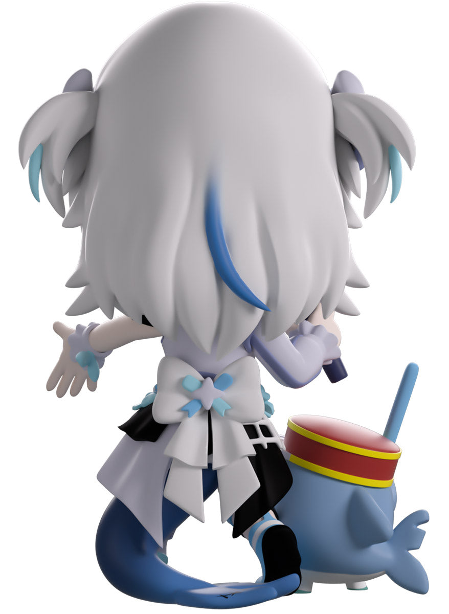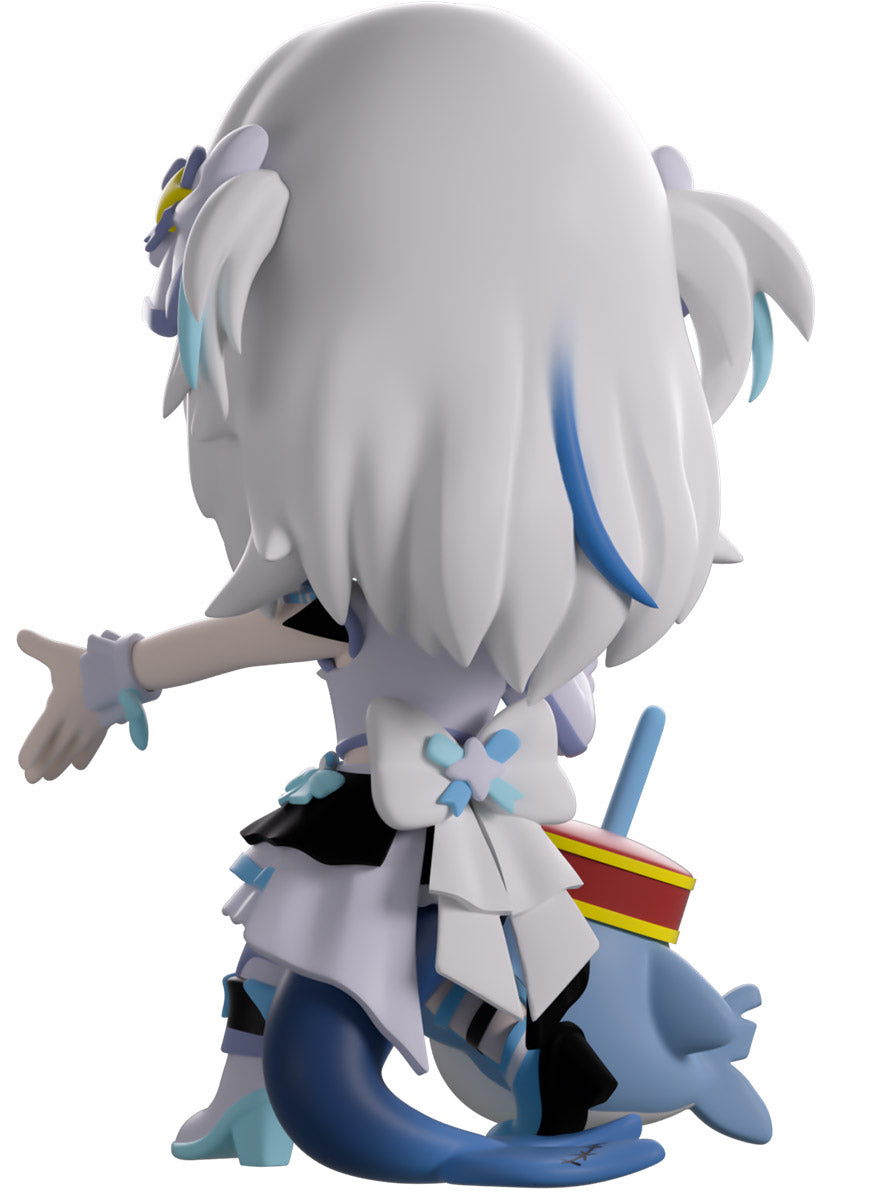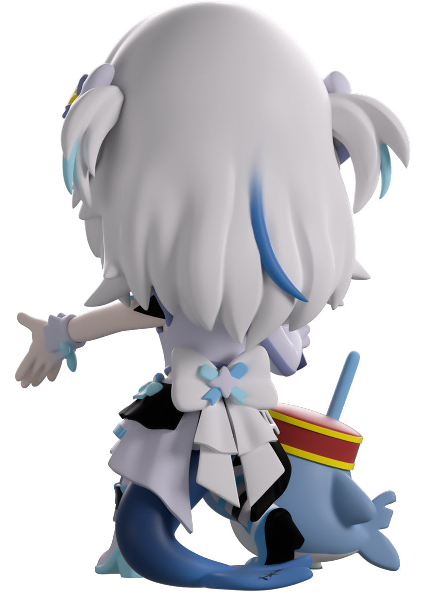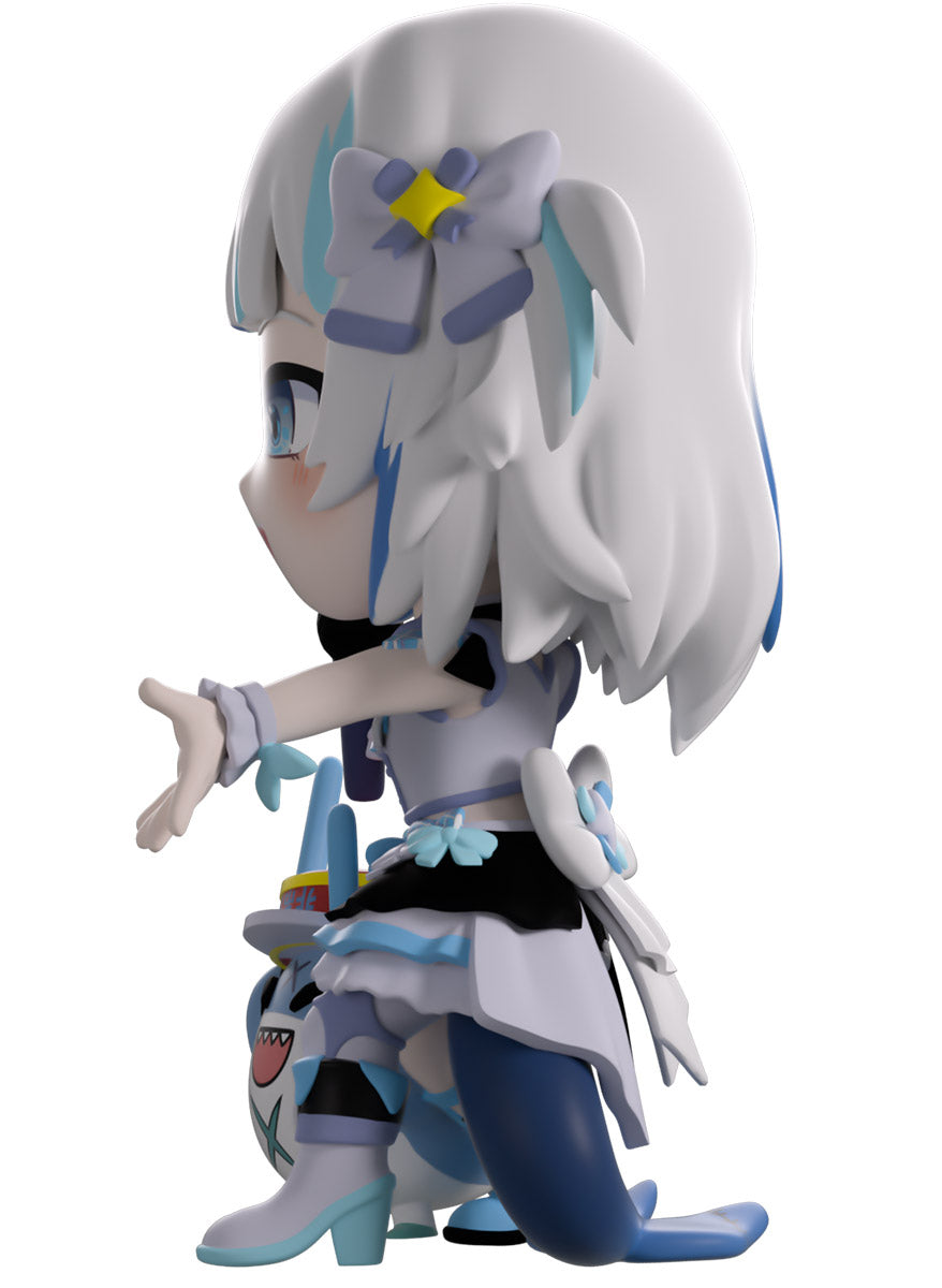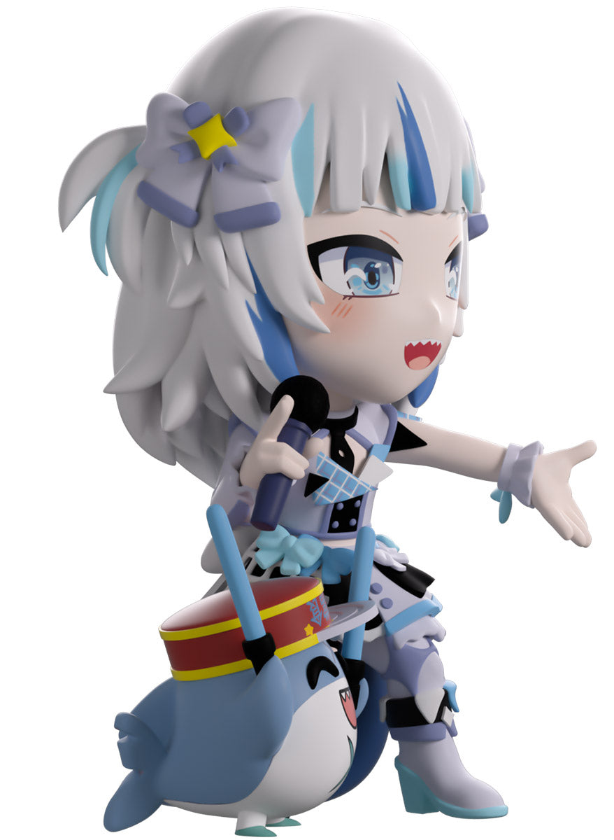 Wait, what’s this? Gawr Gura has swum into Youtooz to make her vinyl debut! Standing at 4.5 inches tall and ready to belt out the sweetest tunes topside of the ocean, her left hand is stretched out welcomingly as the right holds a microphone up to her face. With blushing cheeks, dazzling blue eyes and a cheery open mouth that reveals a small row of sharp teeth, her white and blue streaked hair is topped with a pair of delicate bows and sits in a blunt fringe across her forehead while falling down to just below her shoulders in thick strands. Dressed and accessorized to put on the best show ever, she wears an intricate blue, black and white outfit covered in bows, patterns and frills as her large blue tail rests at her behind and the adorable Bloop cheers her on with a huge smile and their lightsticks raised! The exterior of her packaging is a bright star sending out illuminating rays over a blue and purple background. The interior is a light blue Seigaiha pattern that fades to white and is covered in shining stars which continues onto the protective sleeve as her figure can be seen through the large clear window at the packaging’s front. This collectible ships in a matte, embossed, protective outer sleeve and a custom-sized plastic protector for maximum protection during shipping.