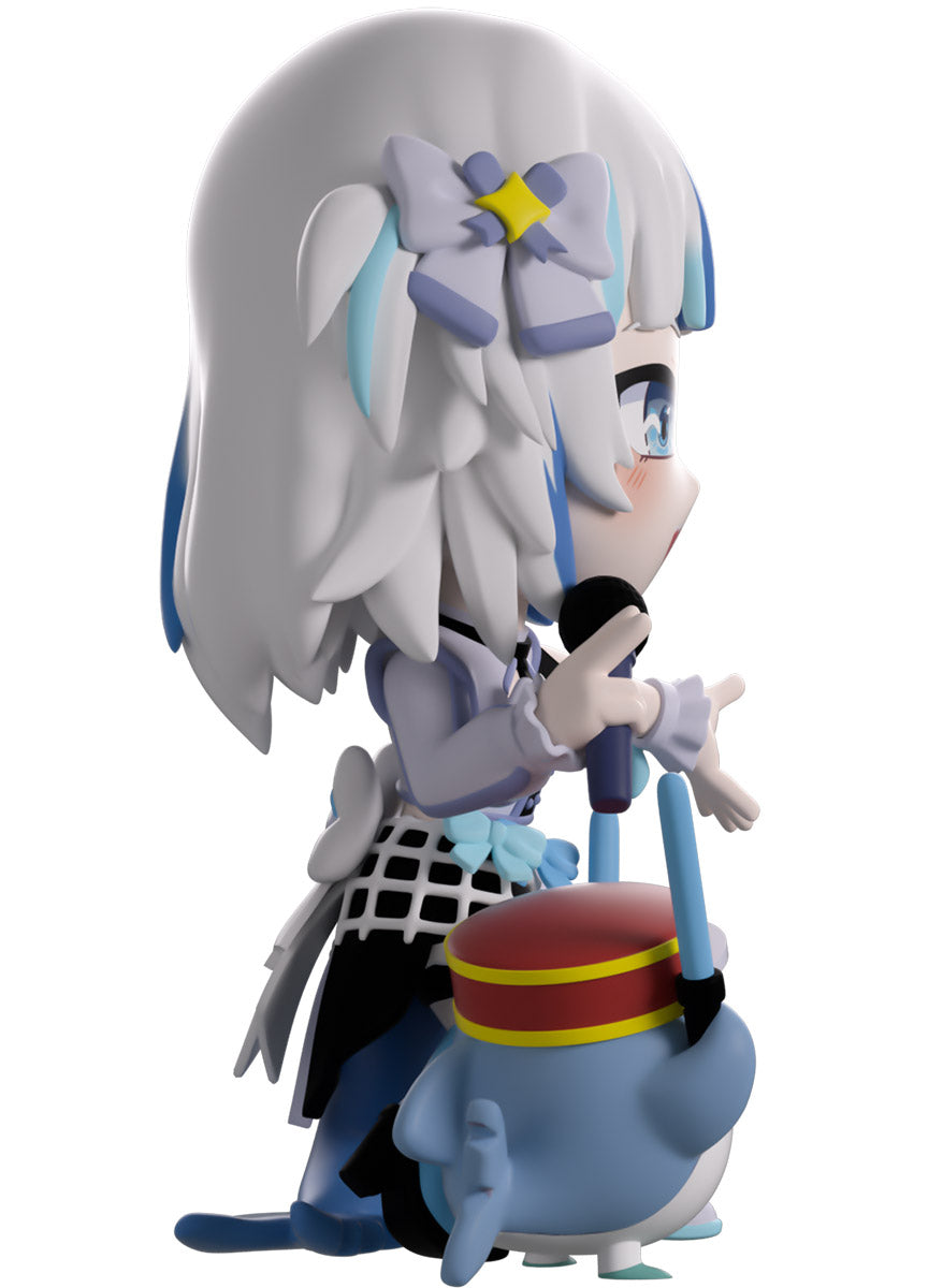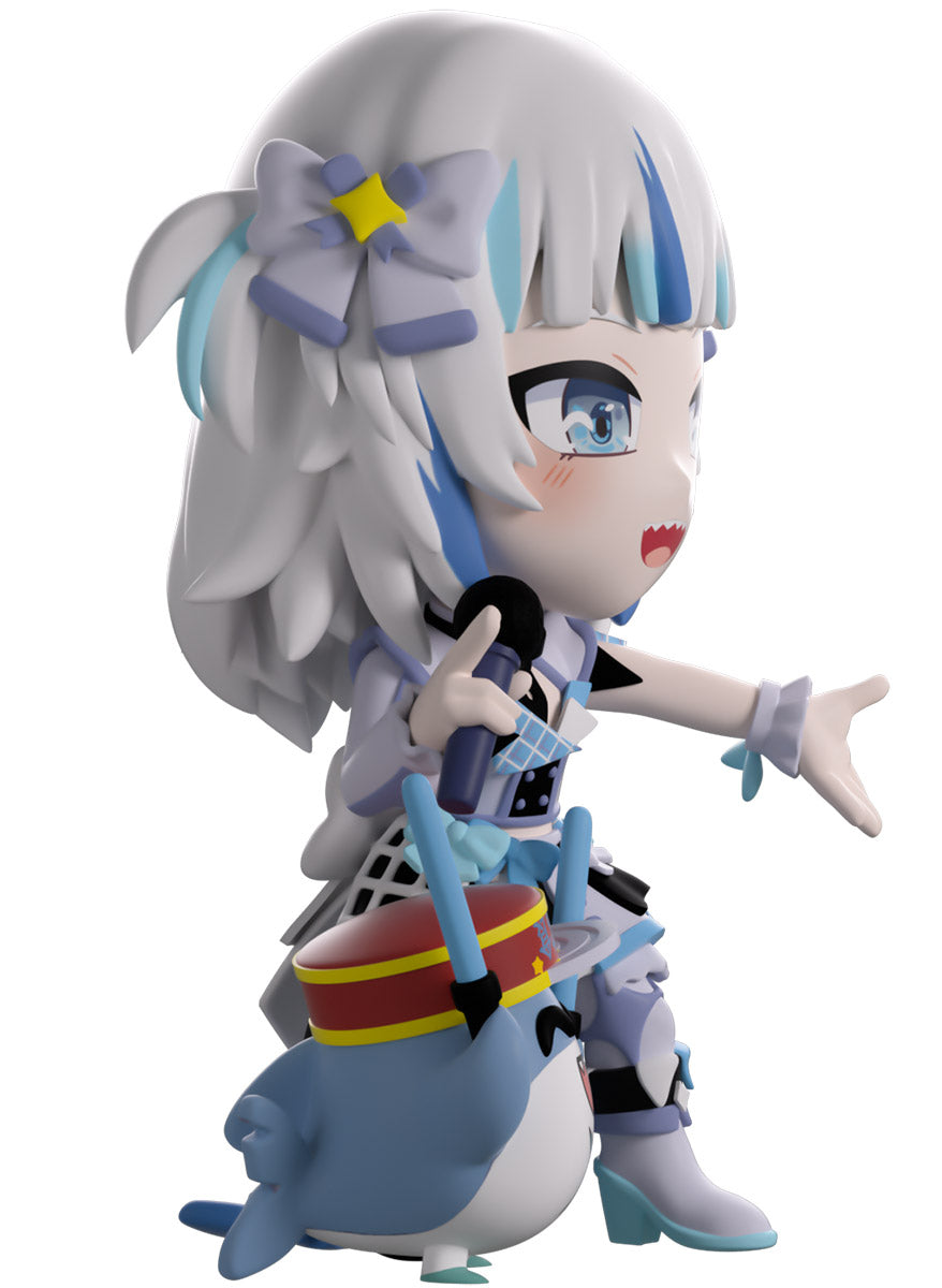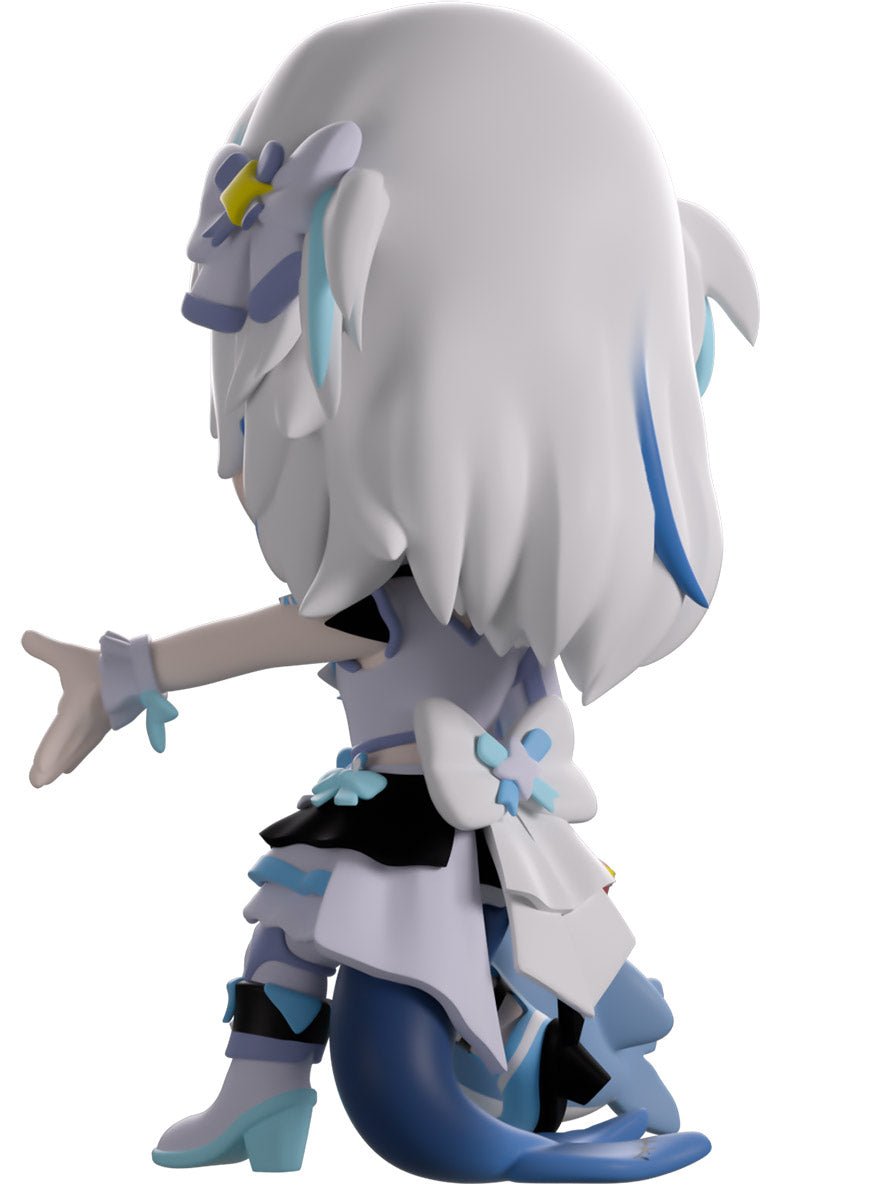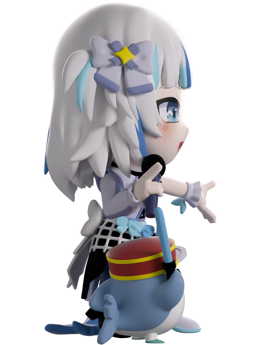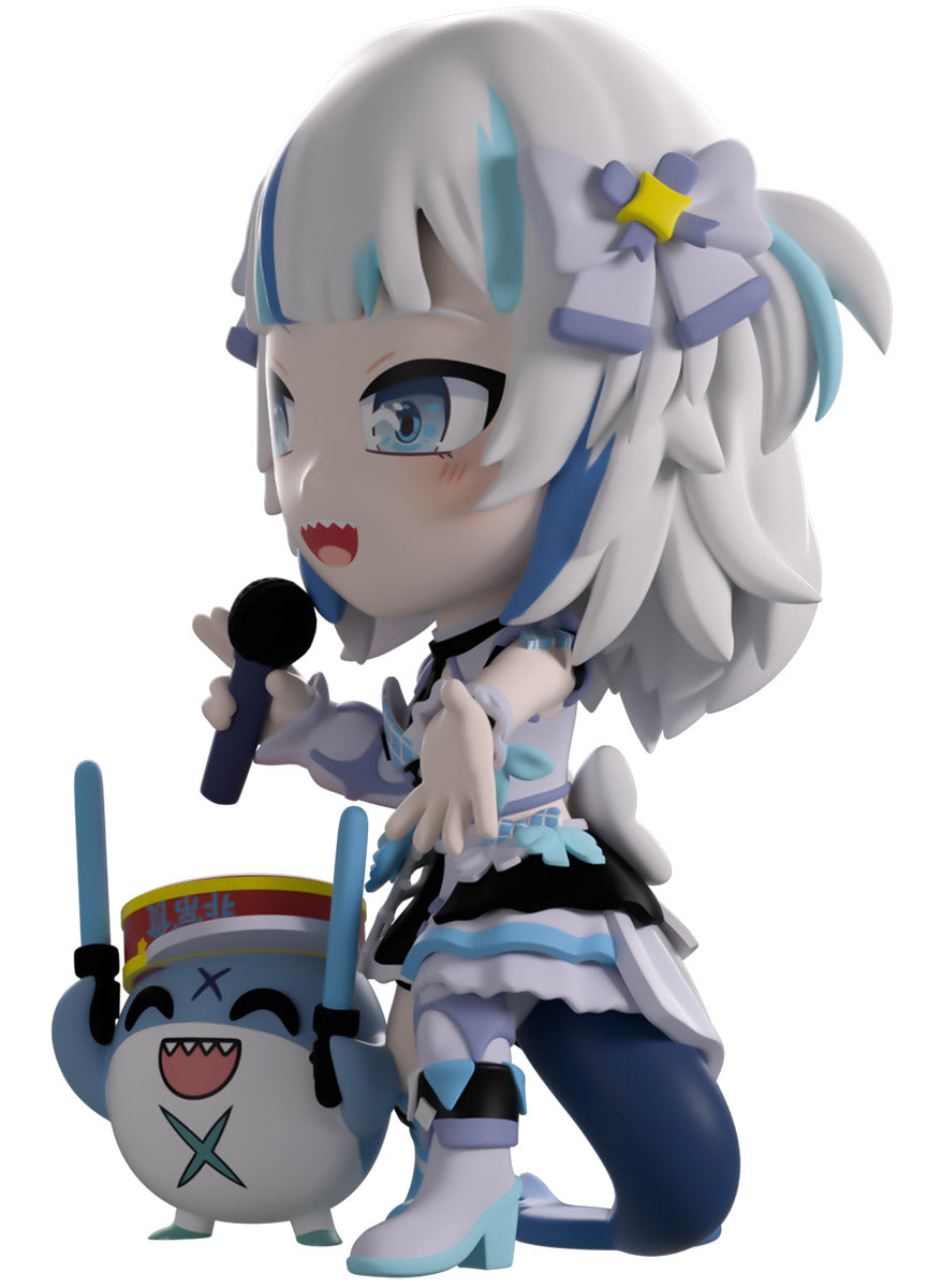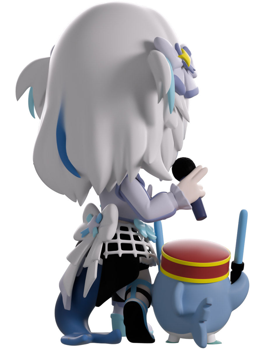 Wait, what’s this? Gawr Gura has swum into Youtooz to make her vinyl debut! Standing at 4.5 inches tall and ready to belt out the sweetest tunes topside of the ocean, her left hand is stretched out welcomingly as the right holds a microphone up to her face. With blushing cheeks, dazzling blue eyes and a cheery open mouth that reveals a small row of sharp teeth, her white and blue streaked hair is topped with a pair of delicate bows and sits in a blunt fringe across her forehead while falling down to just below her shoulders in thick strands. Dressed and accessorized to put on the best show ever, she wears an intricate blue, black and white outfit covered in bows, patterns and frills as her large blue tail rests at her behind and the adorable Bloop cheers her on with a huge smile and their lightsticks raised! The exterior of her packaging is a bright star sending out illuminating rays over a blue and purple background. The interior is a light blue Seigaiha pattern that fades to white and is covered in shining stars which continues onto the protective sleeve as her figure can be seen through the large clear window at the packaging’s front. This collectible ships in a matte, embossed, protective outer sleeve and a custom-sized plastic protector for maximum protection during shipping.