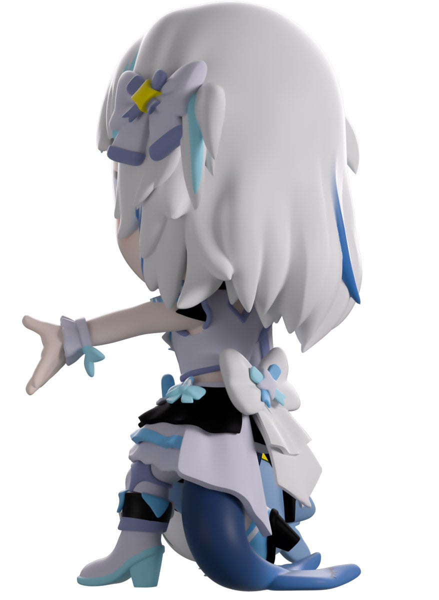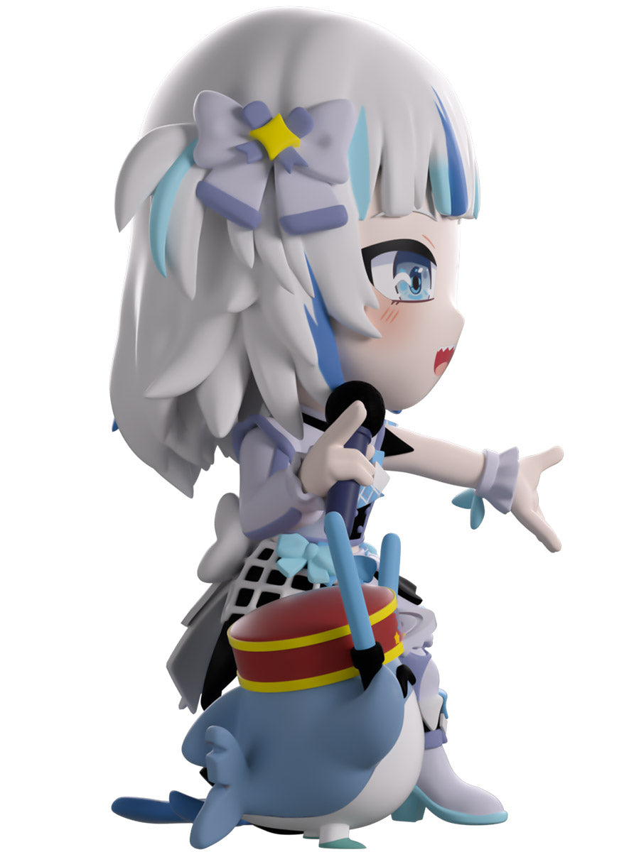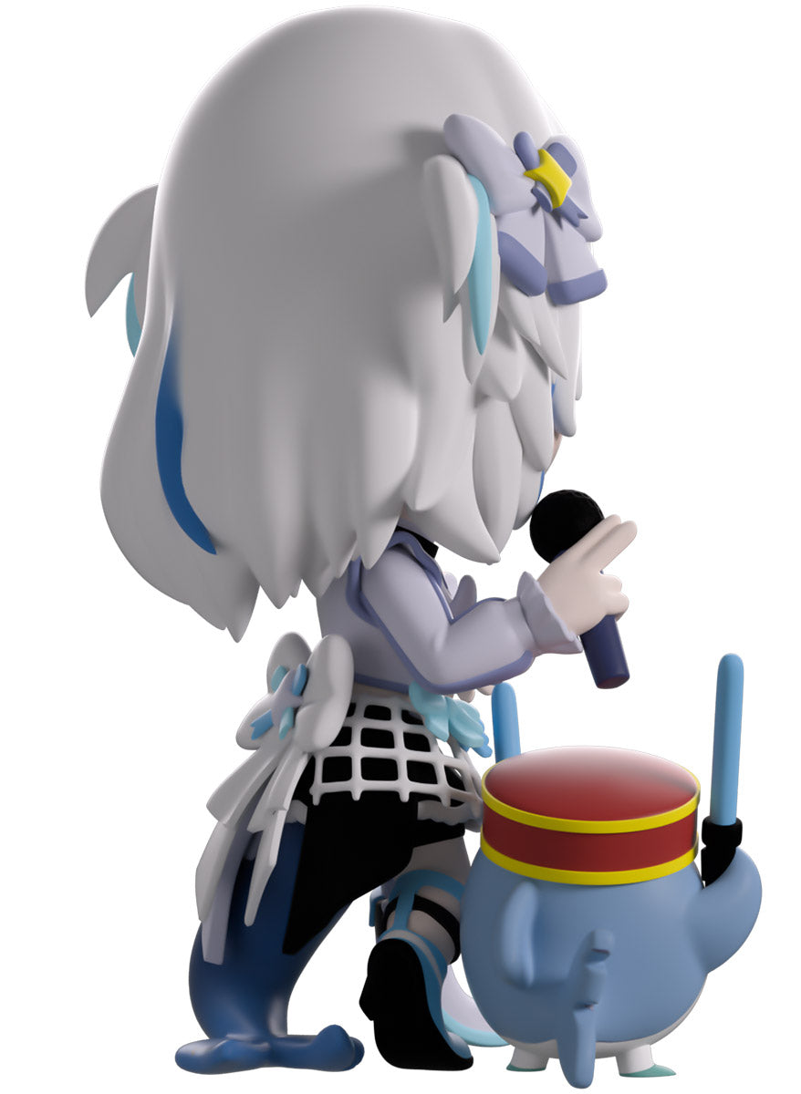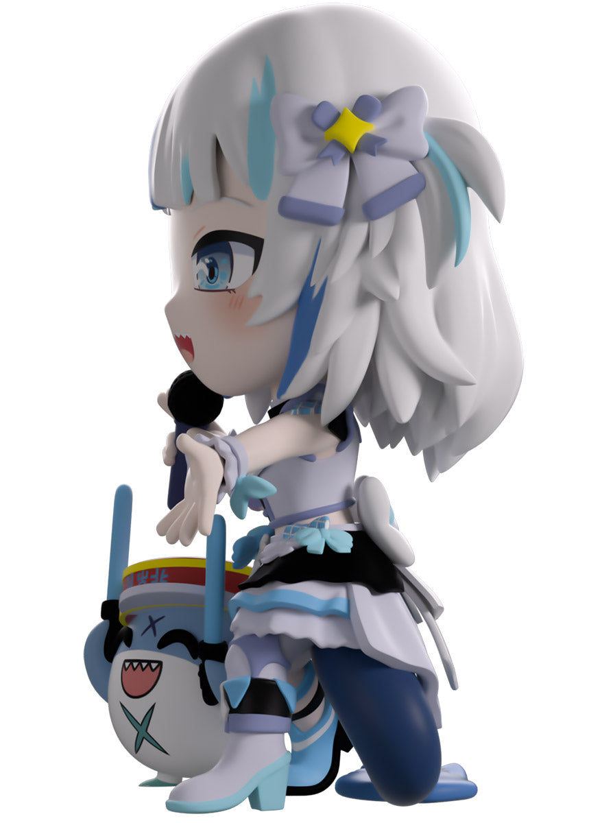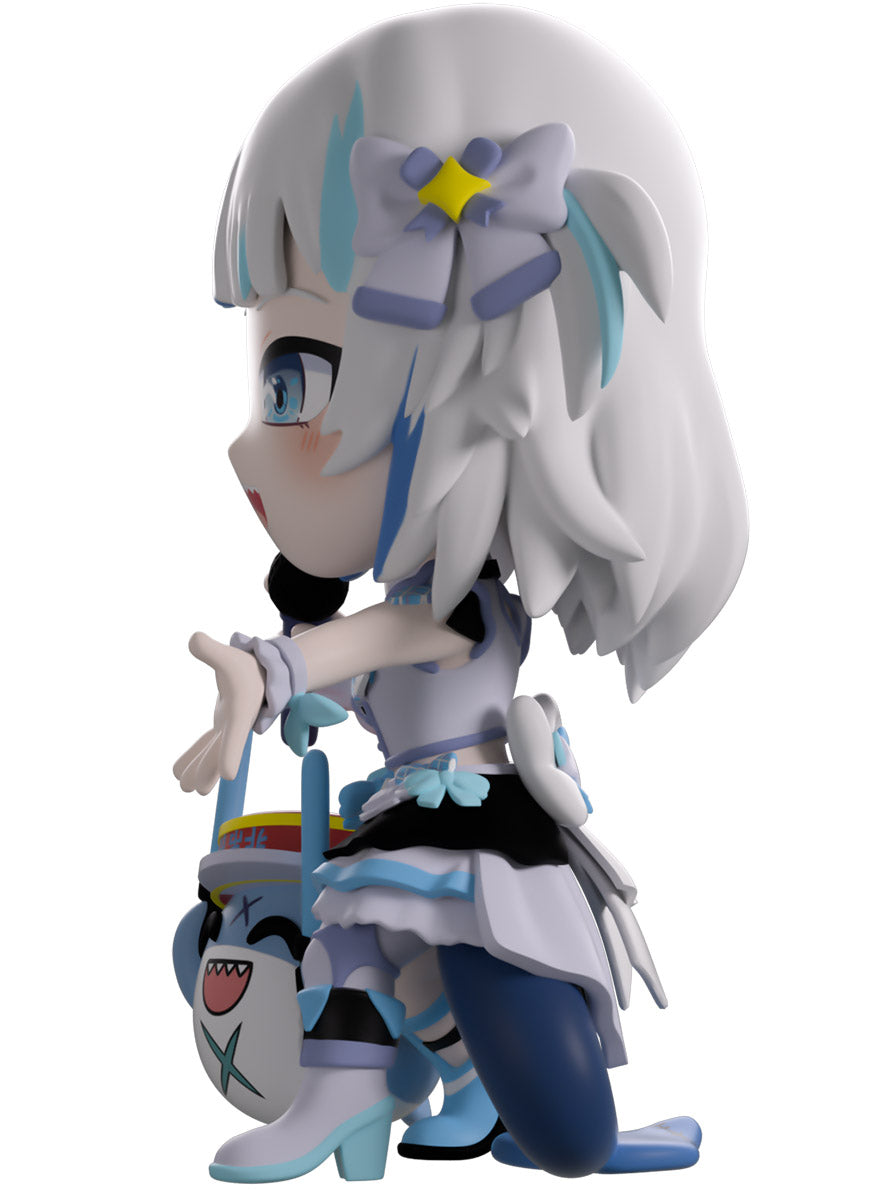 Wait, what’s this? Gawr Gura has swum into Youtooz to make her vinyl debut! Standing at 4.5 inches tall and ready to belt out the sweetest tunes topside of the ocean, her left hand is stretched out welcomingly as the right holds a microphone up to her face. With blushing cheeks, dazzling blue eyes and a cheery open mouth that reveals a small row of sharp teeth, her white and blue streaked hair is topped with a pair of delicate bows and sits in a blunt fringe across her forehead while falling down to just below her shoulders in thick strands. Dressed and accessorized to put on the best show ever, she wears an intricate blue, black and white outfit covered in bows, patterns and frills as her large blue tail rests at her behind and the adorable Bloop cheers her on with a huge smile and their lightsticks raised! The exterior of her packaging is a bright star sending out illuminating rays over a blue and purple background. The interior is a light blue Seigaiha pattern that fades to white and is covered in shining stars which continues onto the protective sleeve as her figure can be seen through the large clear window at the packaging’s front. This collectible ships in a matte, embossed, protective outer sleeve and a custom-sized plastic protector for maximum protection during shipping.