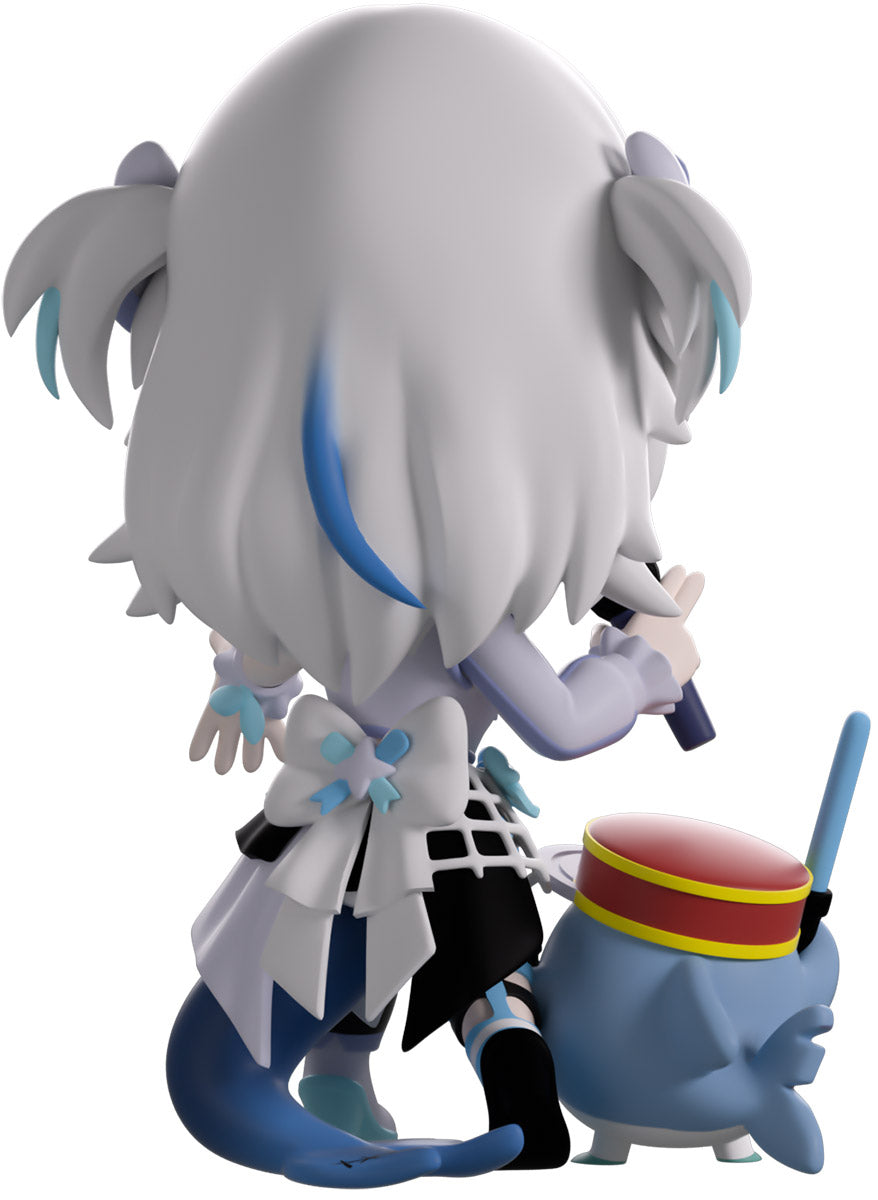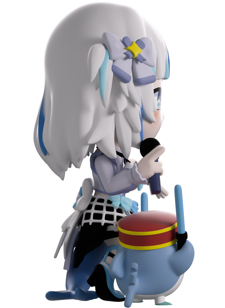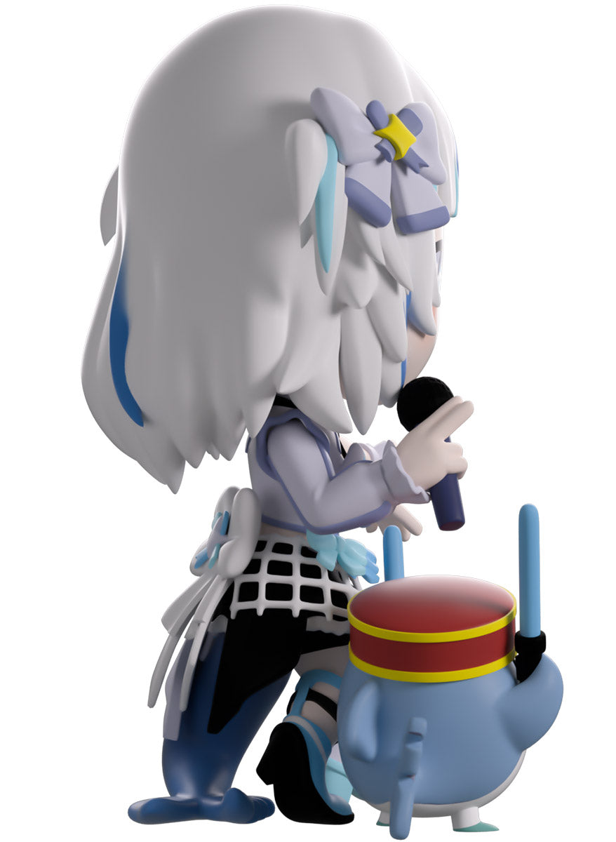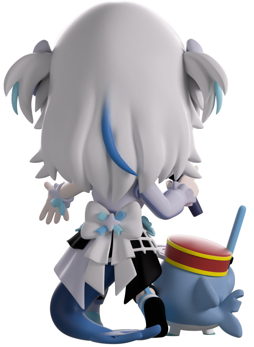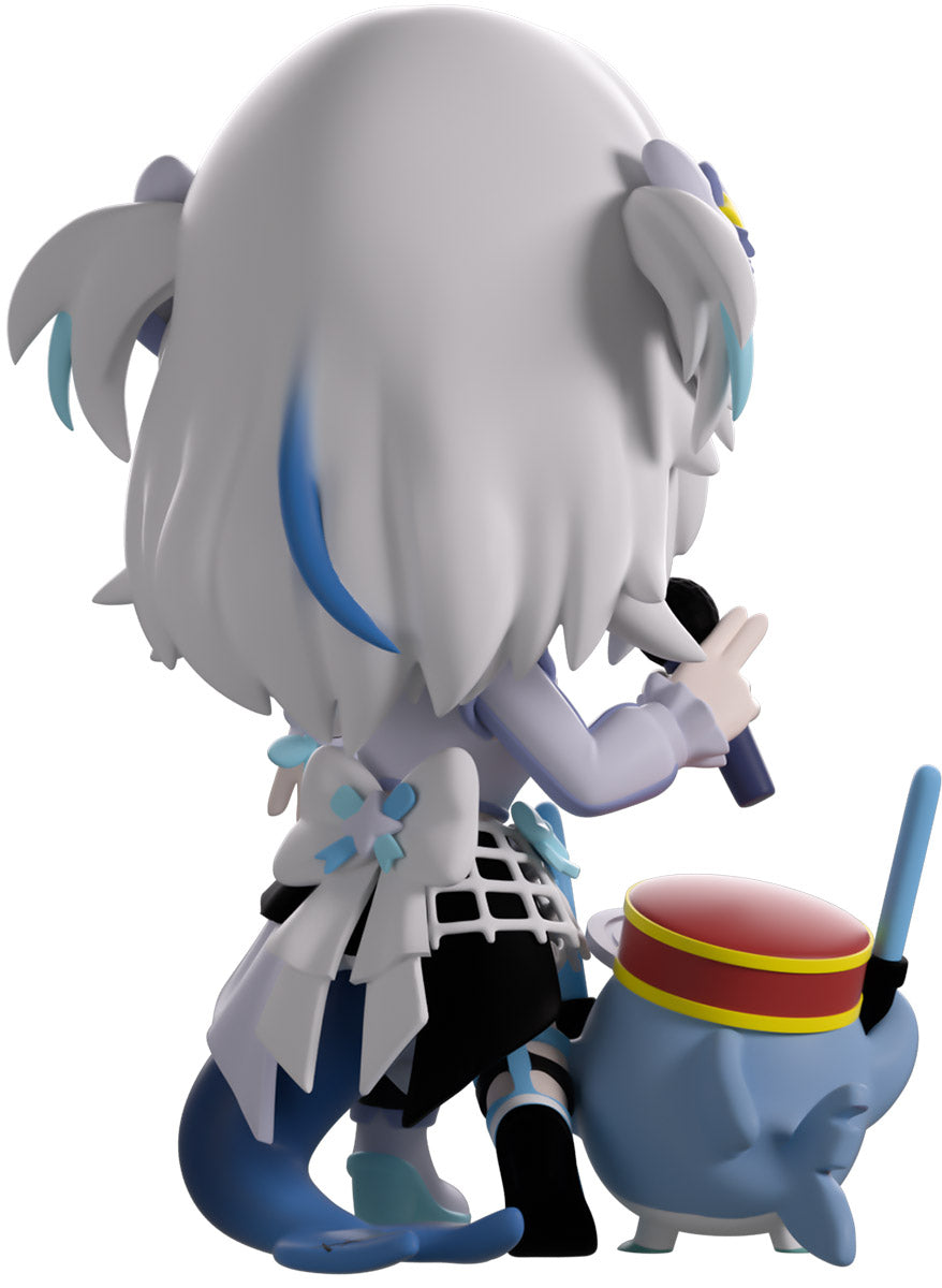 Wait, what’s this? Gawr Gura has swum into Youtooz to make her vinyl debut! Standing at 4.5 inches tall and ready to belt out the sweetest tunes topside of the ocean, her left hand is stretched out welcomingly as the right holds a microphone up to her face. With blushing cheeks, dazzling blue eyes and a cheery open mouth that reveals a small row of sharp teeth, her white and blue streaked hair is topped with a pair of delicate bows and sits in a blunt fringe across her forehead while falling down to just below her shoulders in thick strands. Dressed and accessorized to put on the best show ever, she wears an intricate blue, black and white outfit covered in bows, patterns and frills as her large blue tail rests at her behind and the adorable Bloop cheers her on with a huge smile and their lightsticks raised! The exterior of her packaging is a bright star sending out illuminating rays over a blue and purple background. The interior is a light blue Seigaiha pattern that fades to white and is covered in shining stars which continues onto the protective sleeve as her figure can be seen through the large clear window at the packaging’s front. This collectible ships in a matte, embossed, protective outer sleeve and a custom-sized plastic protector for maximum protection during shipping.