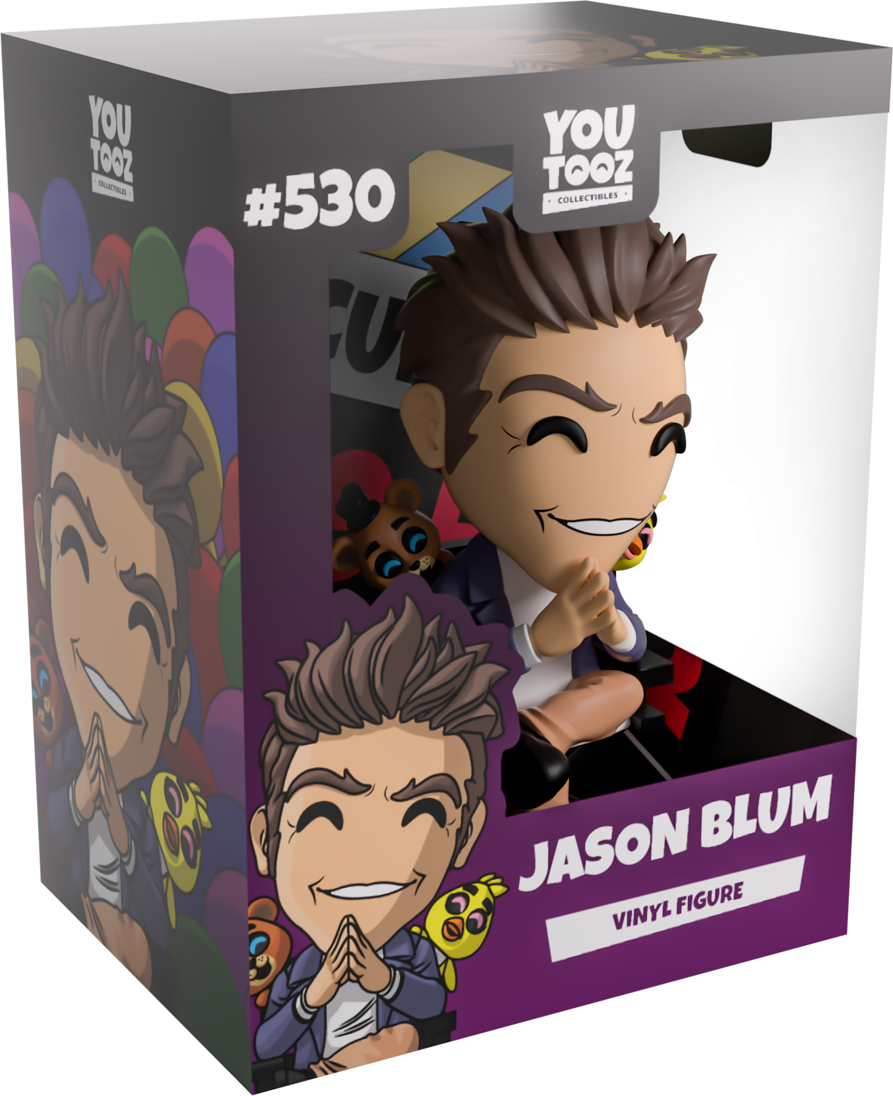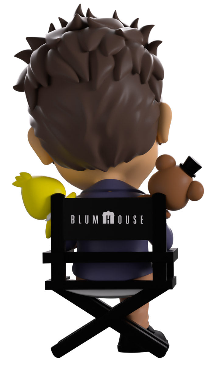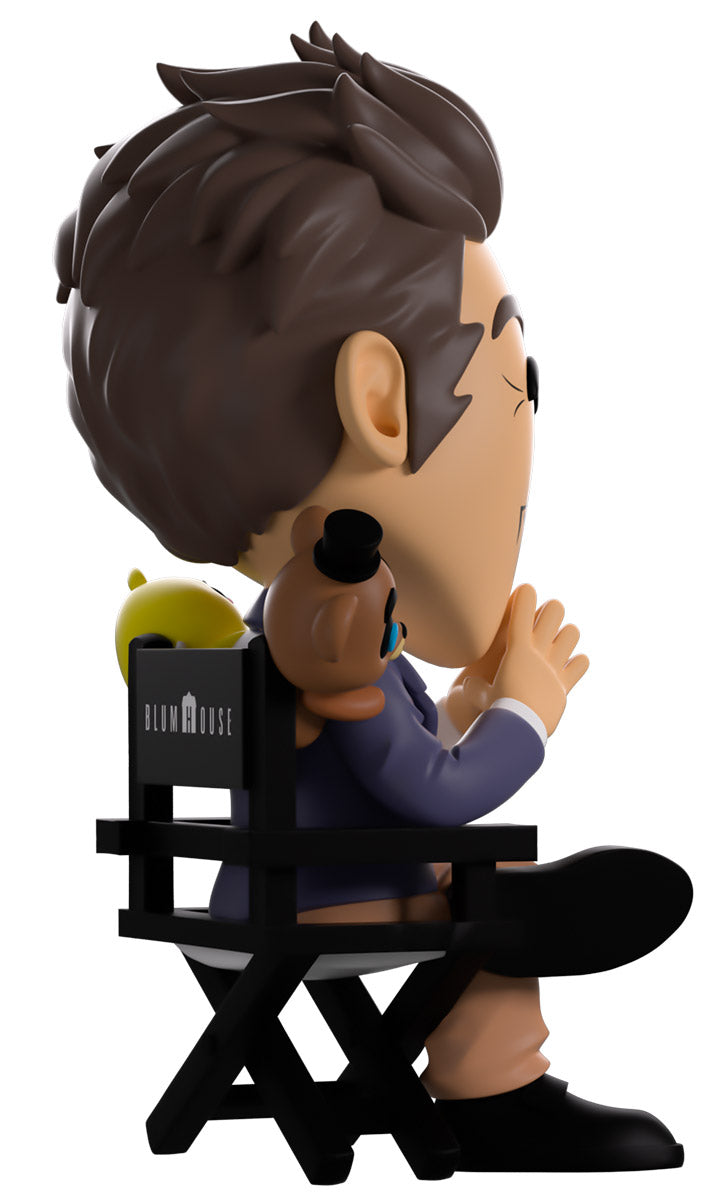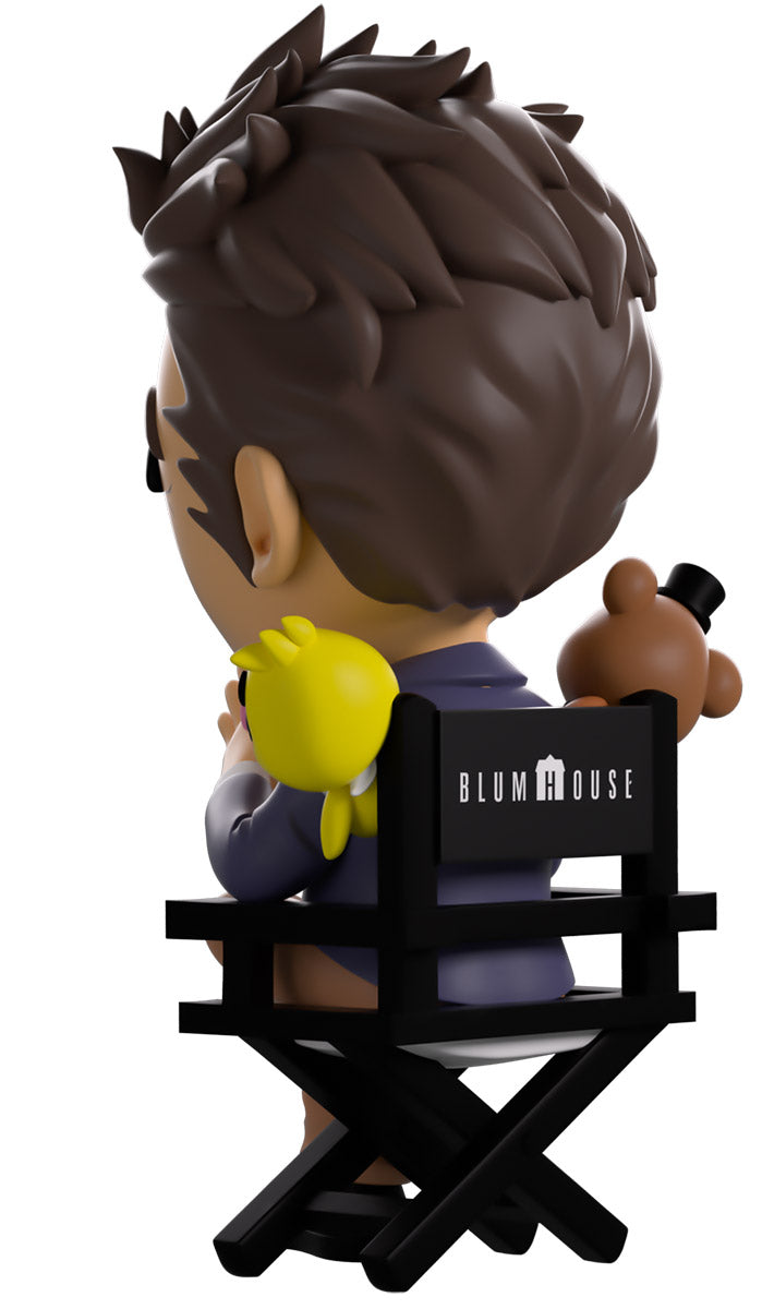 Sitting at 4.6 inches tall in a wooden directors chair with his head tilted to the side and a grin stretching across his face, a thick eyebrow raises playfully as Jason's brown hair is pushed back and comes down in thick sideburns. With one leg crossed over the other and his fingertips pressed together as his hands sit to the front, he wears a blue blazer over a white shirt along with tan pants and black shoes. While, making sure he never has to make another decision alone again, the adorable Freddy and Chica poke their heads over each of his shoulders that they hang from. The exterior of his packaging shows Jason nestled amongst the bright colors of a ball-pit as his eyes glow an ominous red. The interior shows a large movie clapboard over a deep black which continues onto the protective sleeve which is covered in glowing red eyes as his figure can be seen through the large clear window at the packaging’s front. This collectible ships in a matte, embossed, protective outer sleeve and a custom sized plastic protector for maximum protection during shipping.