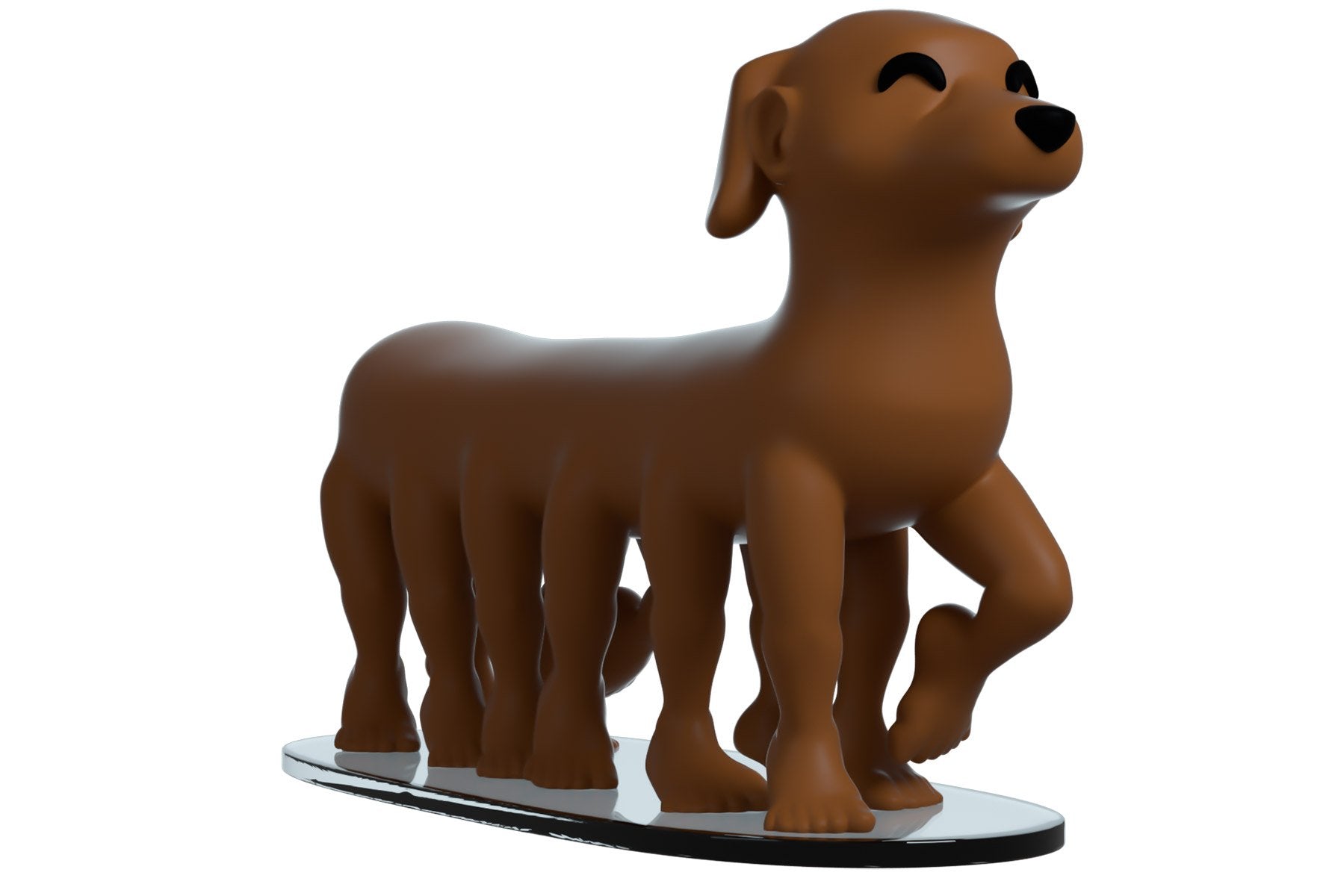 The figure stands at 3.2 inches tall, on 6 sets of legs. LongDog also sports human feet and a set of human ears in front of some floppy dog ears. The windowed display box is illustrated with green rolling hills speckled with white fluffy clouds in front of a blue sky. The interior of the box continues a bright blue sky with clouds floating across. On the protective sleeve are solid colours, with green from the hills and blue from the sky. This collectible was designed in collaboration with the community member @therealracckun, ships in a matte, embossed, protective outer sleeve and a custom-sized plastic protector for maximum protection during shipping.