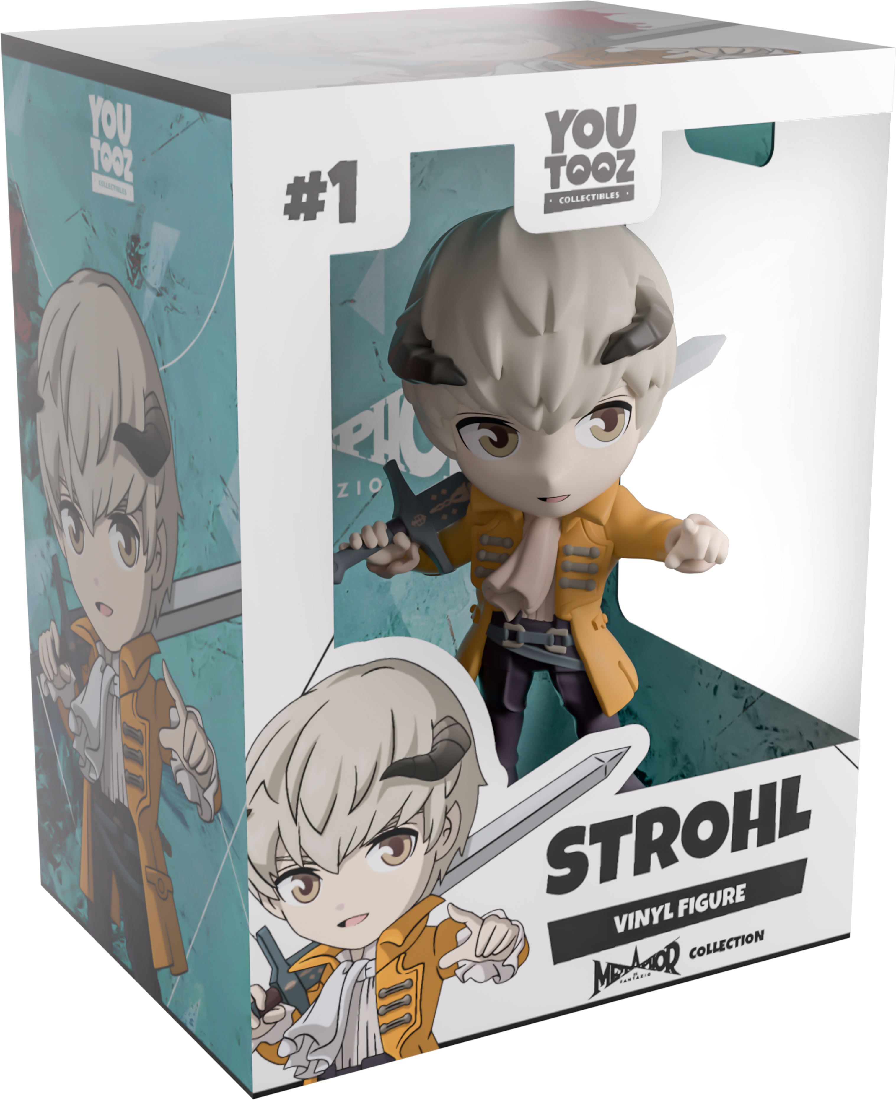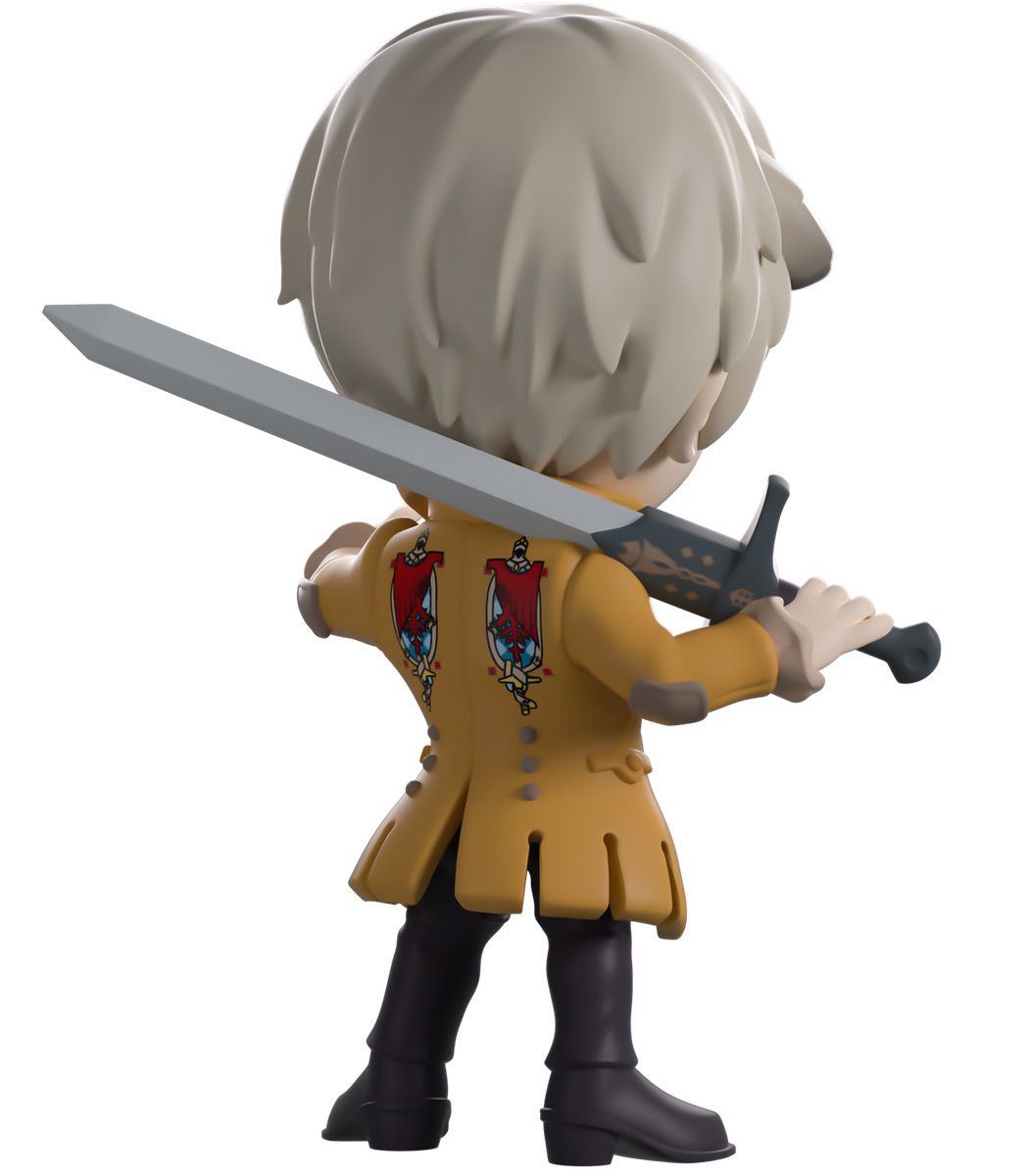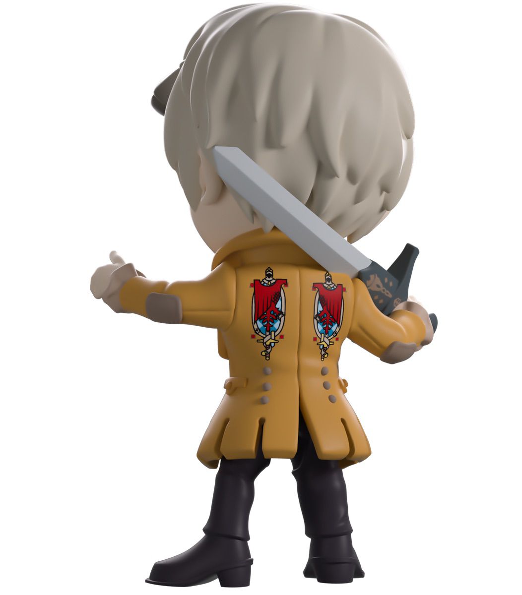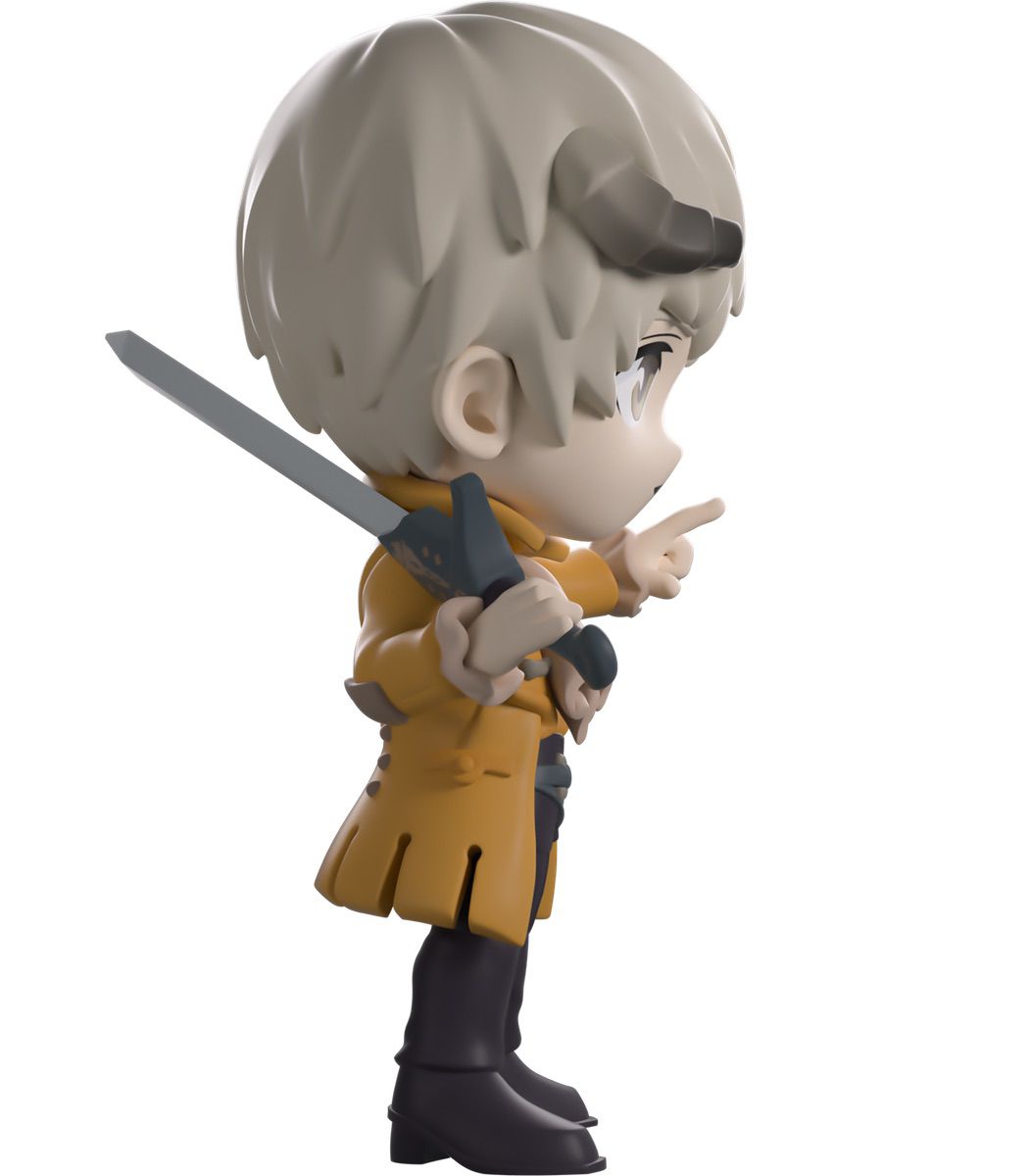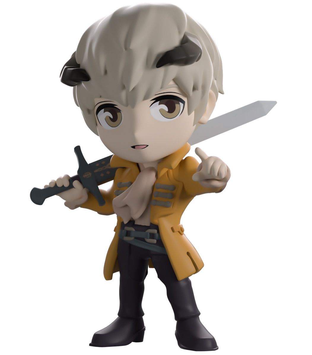 What more could a nobleman want than their very own Youtooz? Standing at 4.8 inches tall a greatsword slung over his right shoulder, his left hand points forward, dark horns curl out from the silver hair covering his head as pale eyes rest above an open mouth. With a long cravat billowing out over his white shirt and wearing a long beige coat with the crest of House Haliaetus on its back, grey-blue belts wrap around his waist as brown pants match his pointed boots. The exterior of their packaging is covered in a pale red pattern, which continues onto the interior and melds into a light teal. The white protective sleeve then has a dissipating black bar along the bottom as the figure can be seen through the large clear window at the packaging’s front. This collectible ships in a matte, embossed, protective outer sleeve and a custom-sized plastic protector for maximum protection during shipping.