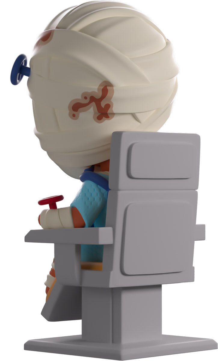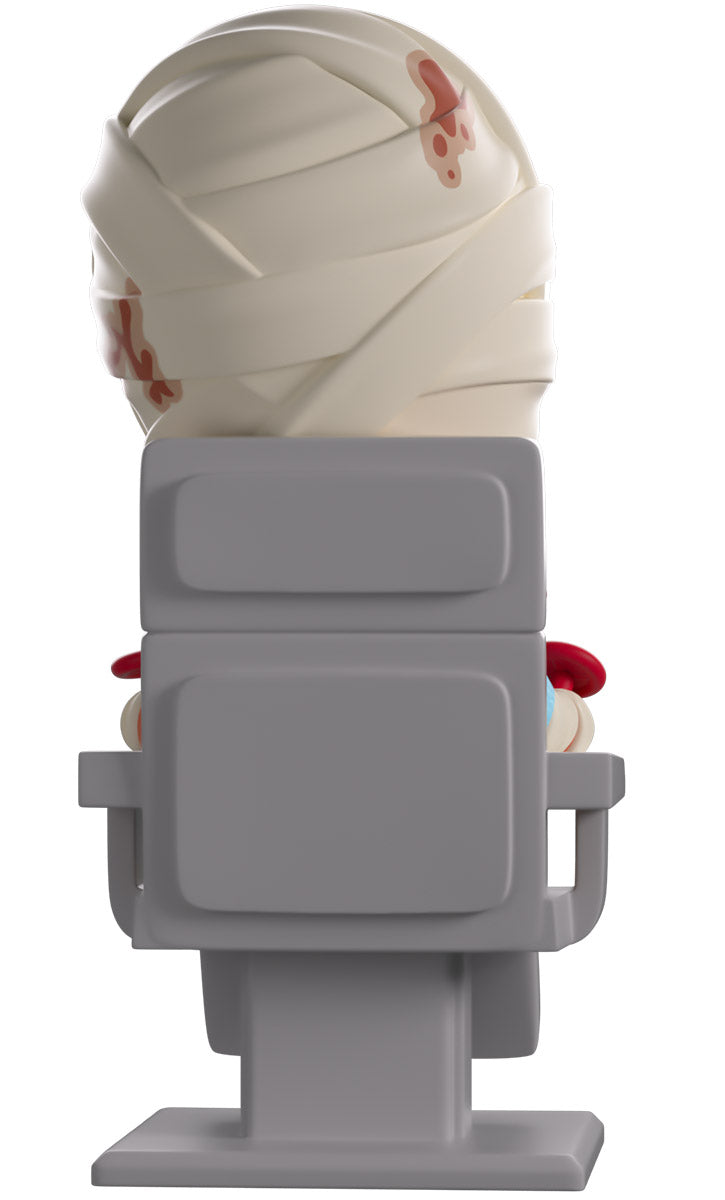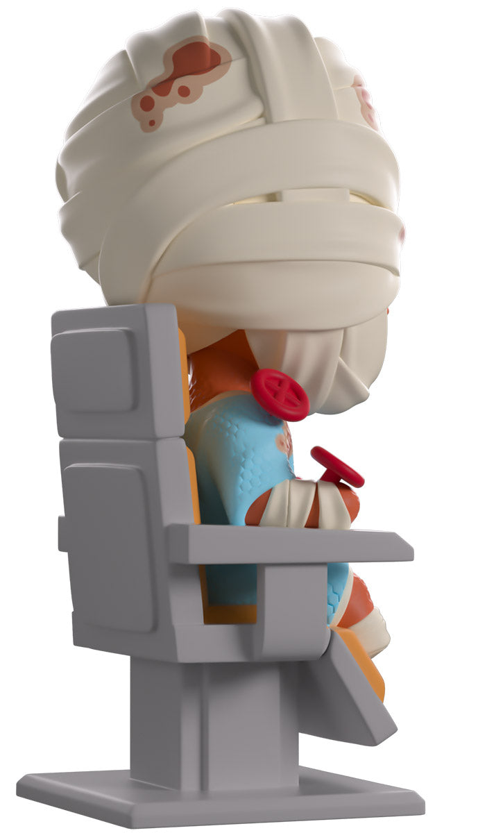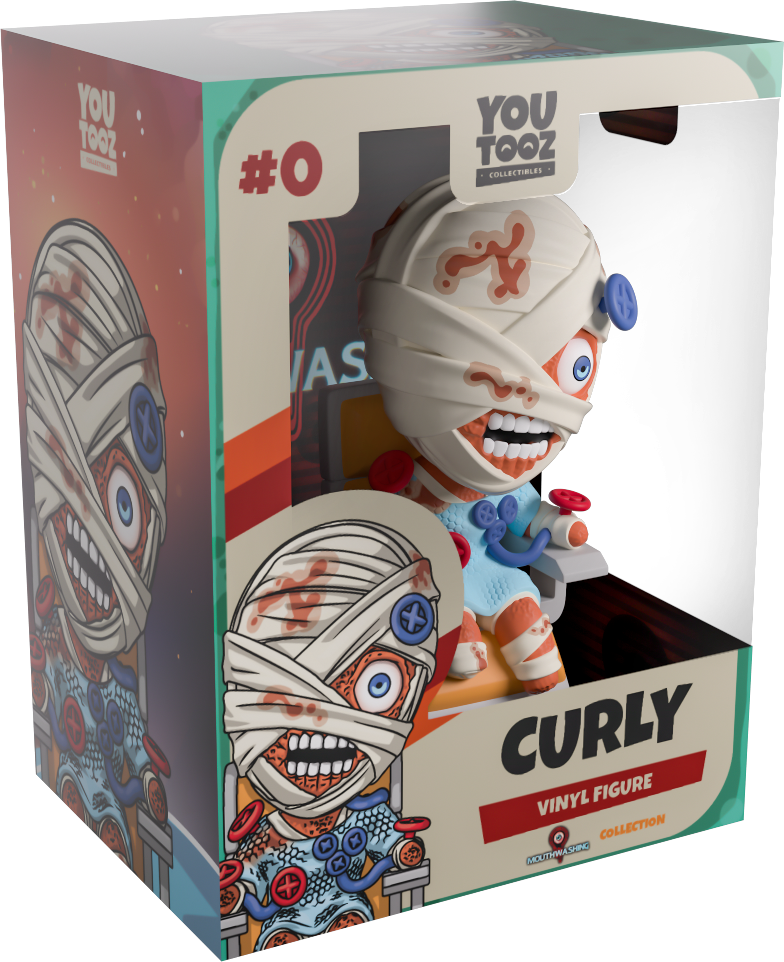 The Tulpar’s crash has landed Curly at Youtooz for the most unsettling debut we’ve had! Sitting atop a beige and grey chair at 4.5 inches tall with burnt flesh covering his entire body as bright white teeth are visible through a lipless mouth, blood-stained bandages wrap around his head and leave a horrifying blue eye uncovered to stare at you endlessly. Wearing a blue medical gown as red and blue valves and tubes poke out from his body, handless arms rest to his sides as footless legs stick out the front. The exterior of his packaging is covered in screens that show a swirling cosmos, while the interior is filled with staring eyeballs. The protective sleeve is then bathed in red warning lights as eyeballs cover the control screens and his figure can be seen through the large clear window at the packaging’s front. This collectible ships in a matte, embossed, protective outer sleeve and a custom-sized plastic protector for maximum protection during shipping.