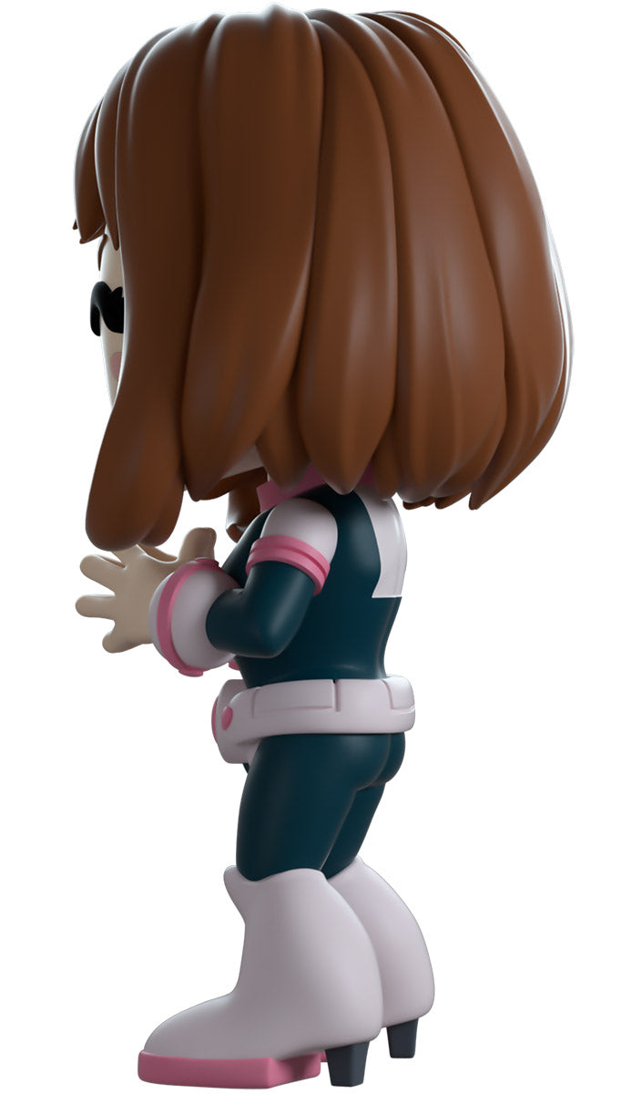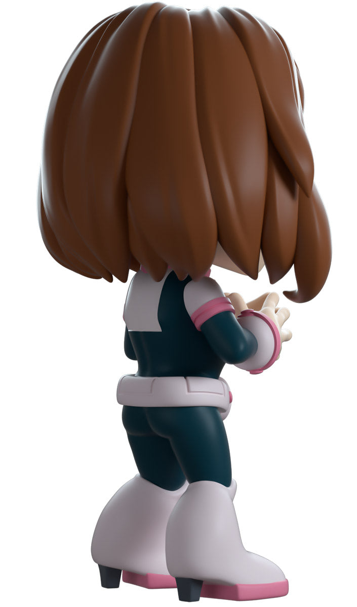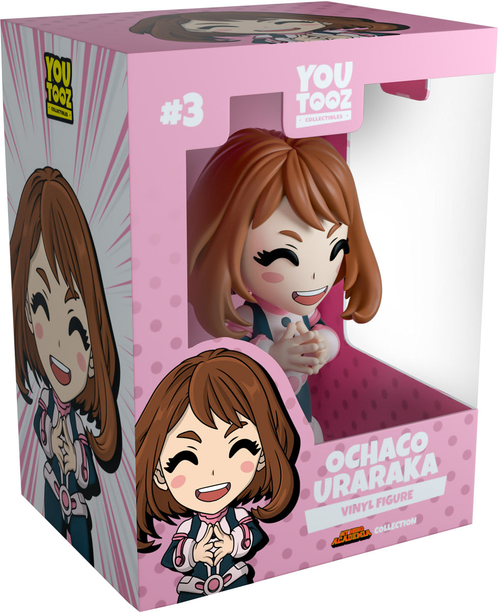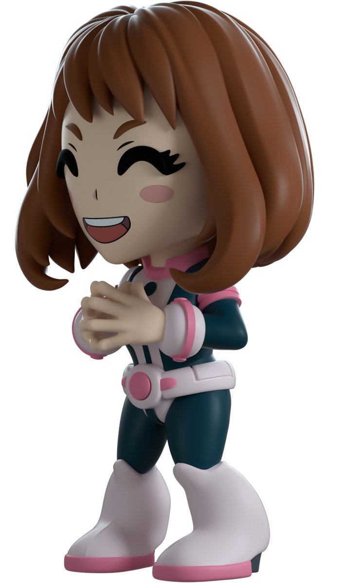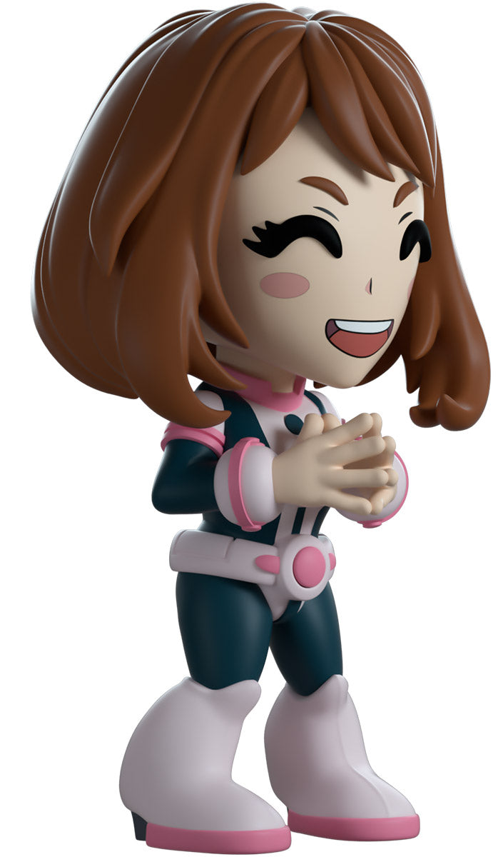 Ochaco floats into Youtooz gracefully making her weightless debut! At 4.3 inches tall, her cheerful smile sits open between two blushing pink cheeks and under long lashed eyes as a shoulder length brown bob of hair flares out at the front. Posed with both hands held out in front and her pressing her fingertips together, she focuses her quirk in preparation to make everyone, and everything, lose its grounding! Her hero costume consists of a skin tight black bodysuit with white marks down its front to match her shoulders, while being perfectly complimented with a chunky white and pink belt, wrist guards and boots. The exterior of her packaging is an illustration of Ochaco with dual shadows surrounded by soft pink impact lines, this palette continues through to its interior to surround them completely as a simple dot pattern fades out from the bottom. The protective sleeve shows a collage of the crew dissected by diagonal lines with the ‘My Hero Academia’ Logo. This collectible ships in a matte, embossed, protective outer sleeve and a custom sized plastic protector for maximum protection during shipping.