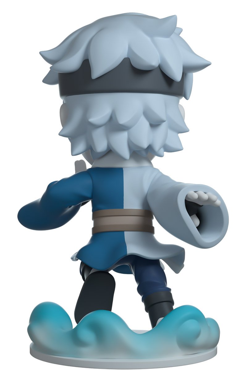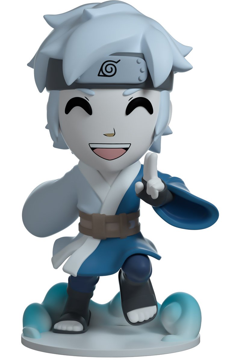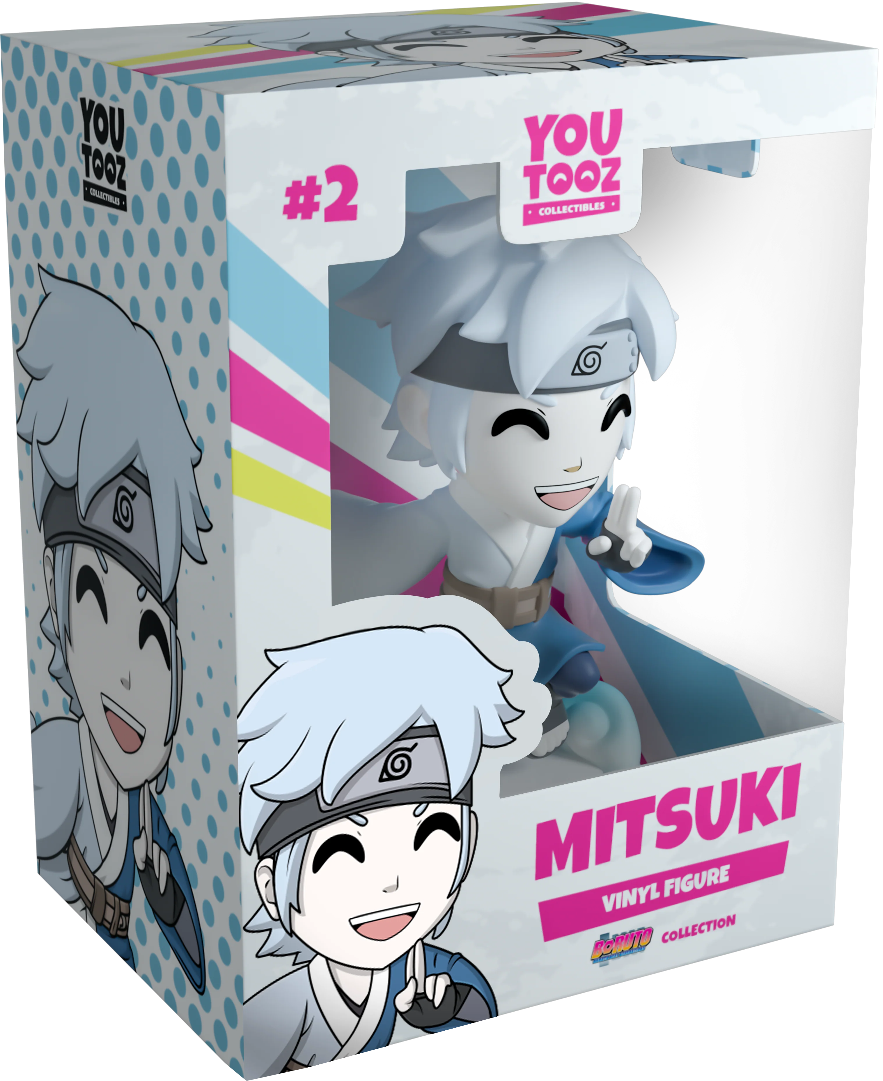 Mitsuki makes his cool and calculated Youtooz debut to round out team 7! At 4.3 inches tall this true shinobi is posed with his left hand raised from a loose sleeve gesturing a jutsu while the other trails behind him as he runs. His big open smile is framed by long chunky white hair that falls over a grey Konoha headband, as his furrowed brows exposes a cheeky intent! Dressed in a long flowing blue and white robe that’s cinched at the waist with a brown belt, his outfit is complete with blue pants and black sandals. The exterior of his packaging is a simple pattern of yellow dots over a white background, this continues onto the protective sleeve which is stamped with the Boruto logo. While the interior of the packaging is lined blue, pink and yellow streaks over a mottled white. This collectible ships in a matte, embossed, protective outer sleeve and a custom sized plastic protector for maximum protection during shipping.