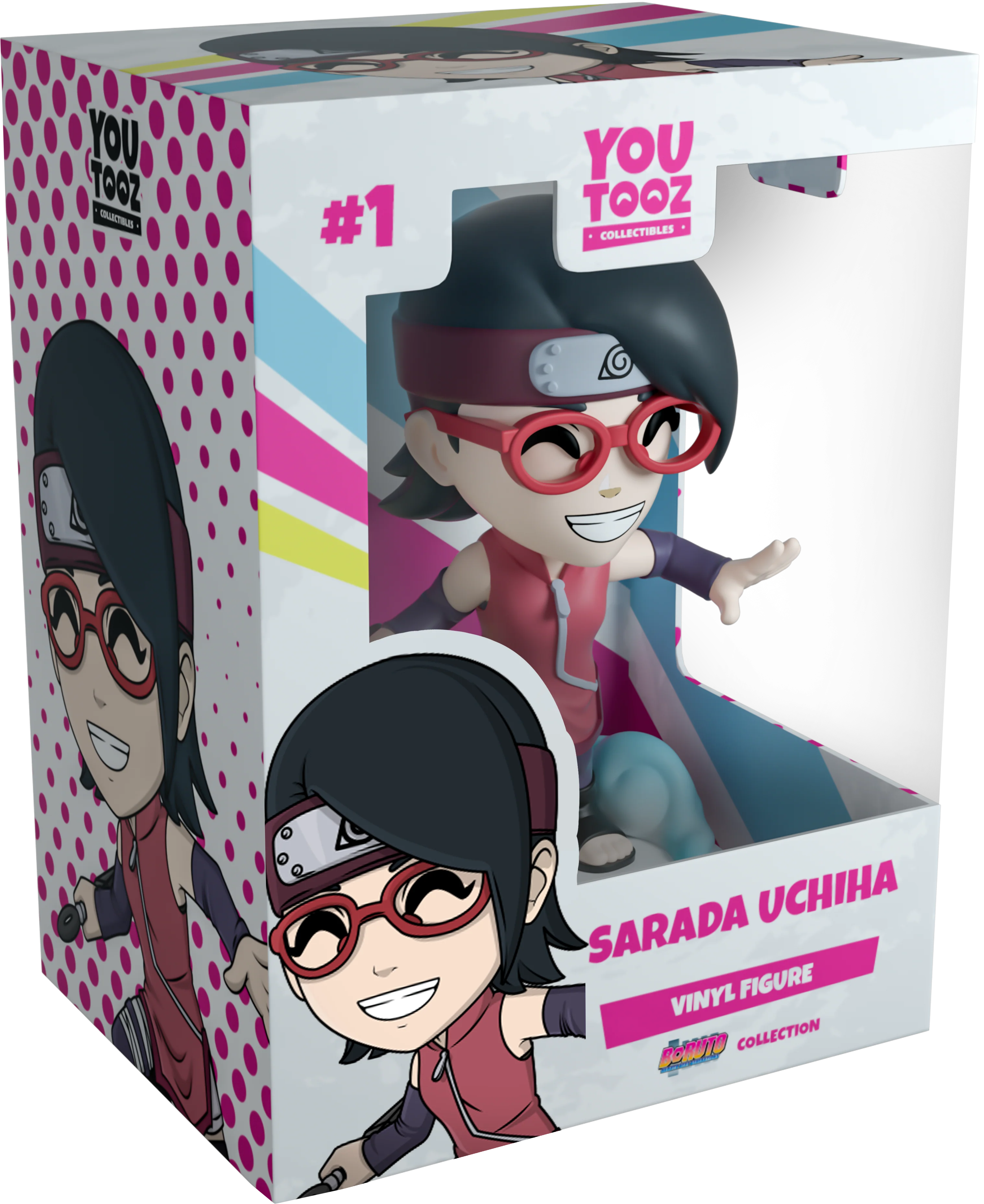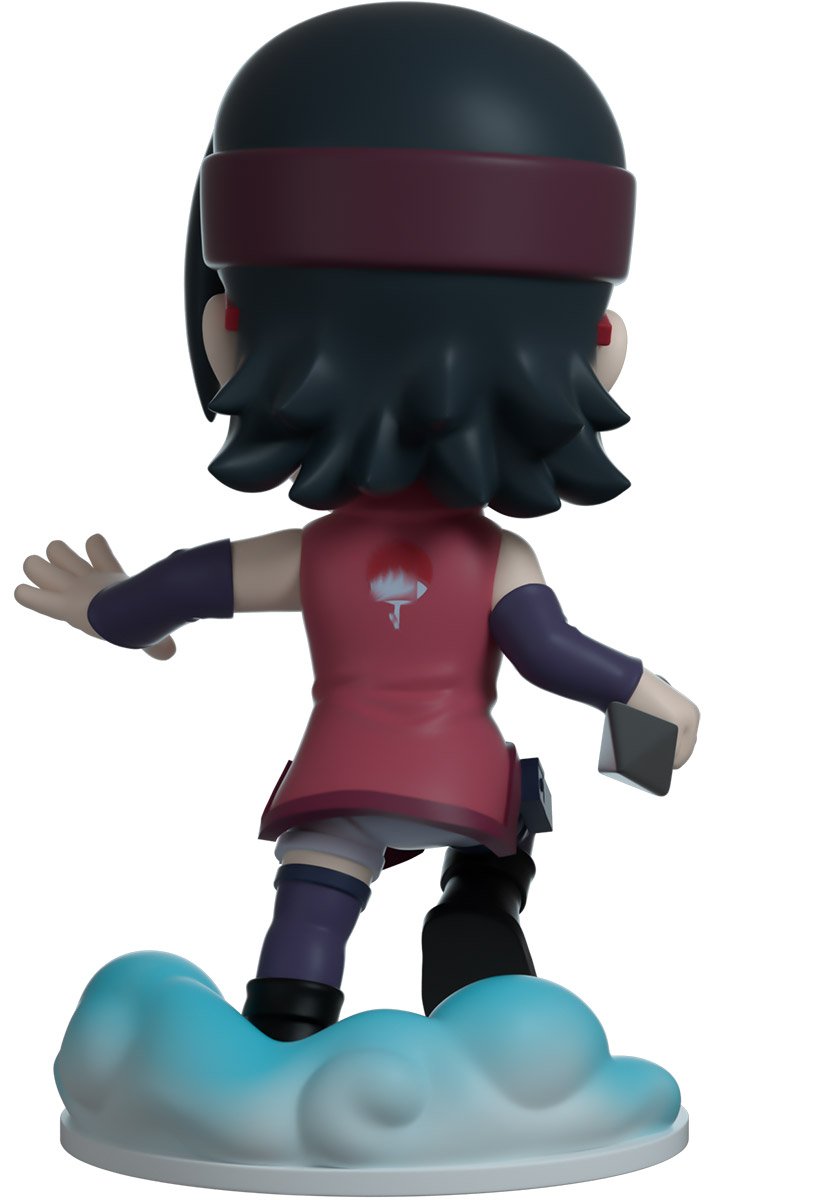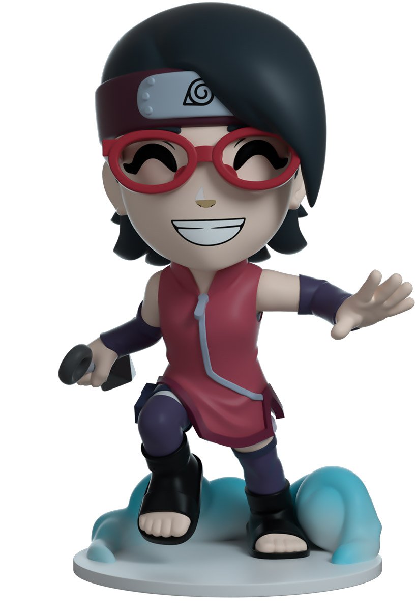 Sarada makes her Youtooz debut to show everyone she’s not her father! Standing at 4.2 inches tall she’s posed in a mid dash sending a cloud of white smoke billowing from her feet while wielding a large kunai in her right hand, the other hand stretches outwards in anticipation. Her large smile is topped with red glasses and a thick maroon Konoha headband which is partially covered by her thick black hair. She wears a sleeveless red tunic with the Uchiha clan symbol printed on its back while her arms and legs are covered in black wraps as she wears open toe combat sandals. The exterior of her packaging is a simple pattern of pink dots over a white background, this continues onto the protective sleeve which is stamped with the Boruto logo. While the interior of the packaging is lined blue, pink and yellow streaks over a mottled white. This collectible ships in a matte, embossed, protective outer sleeve and a custom sized plastic protector for maximum protection during shipping.