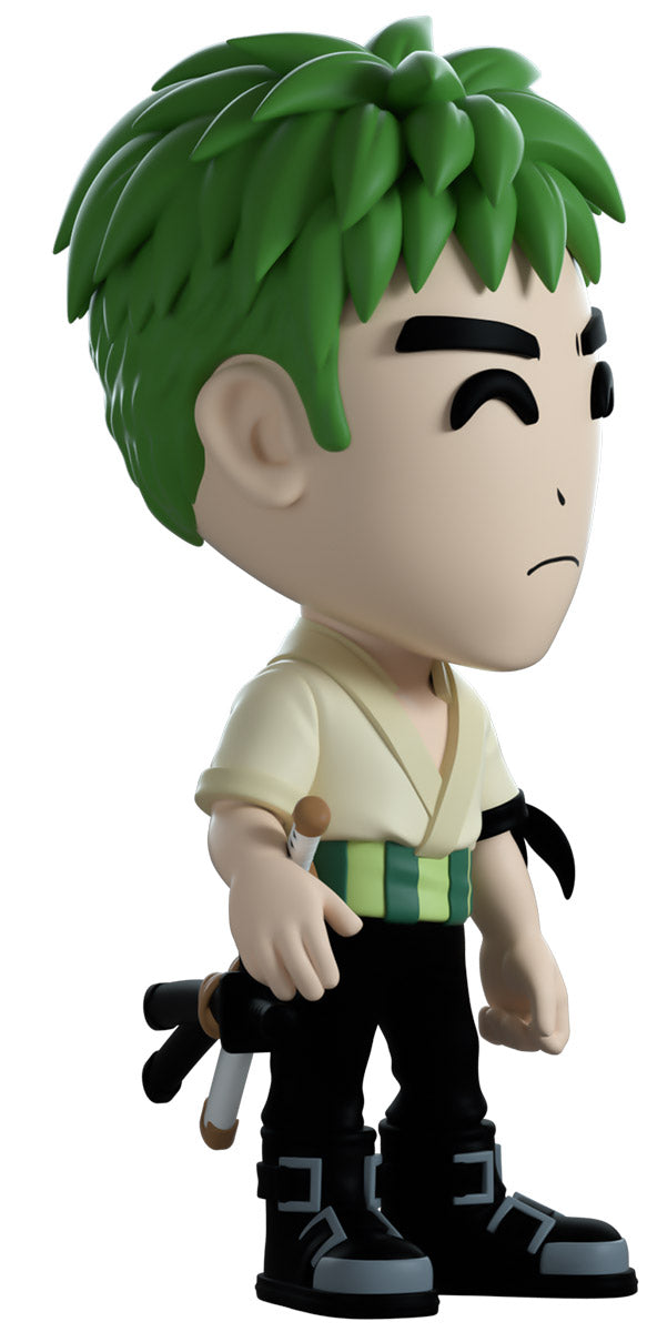 You could never count the amount of people Zoro cut through just to arrive at Youtooz for his debut! At 4.7 inches and casting a stern look from his stoic face, spikes of short mossy green hair top his head while three golden earrings hang from his left ear. With a beige open front shirt tucked into the green striped wrap around waist and a black armband tied around his right arm, his left hand rests on the three swords sheathed at his side while his outfit is complete with tight black pants and buckled boots. The exterior of his packaging is a beautiful scene of pink petals drifting down from bending trees. While the interior sees a vibrant blue crashing wave sending white sea foam skywards in front of beautiful pale yellow background, this design then flows onto the protective sleeve where his figure can be seen through the large clear display window at its front. This collectible ships in a matte, embossed, protective outer sleeve and a custom-sized plastic protector for maximum protection during shipping.