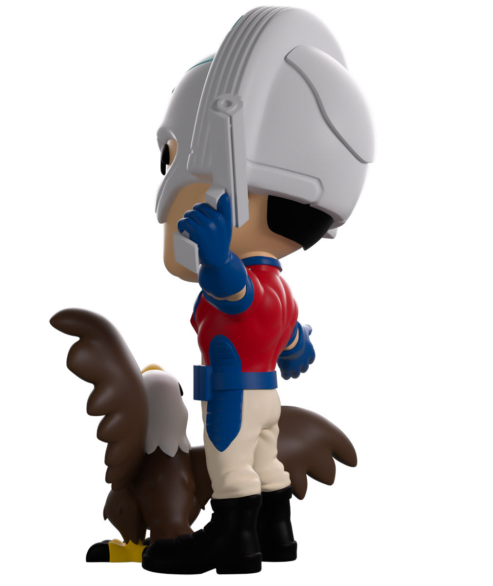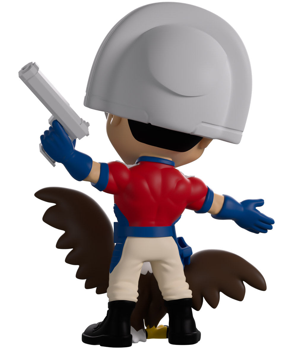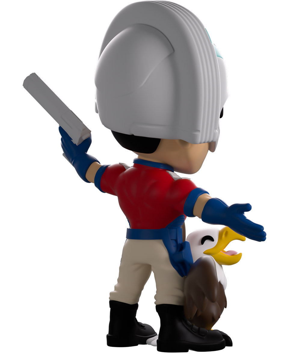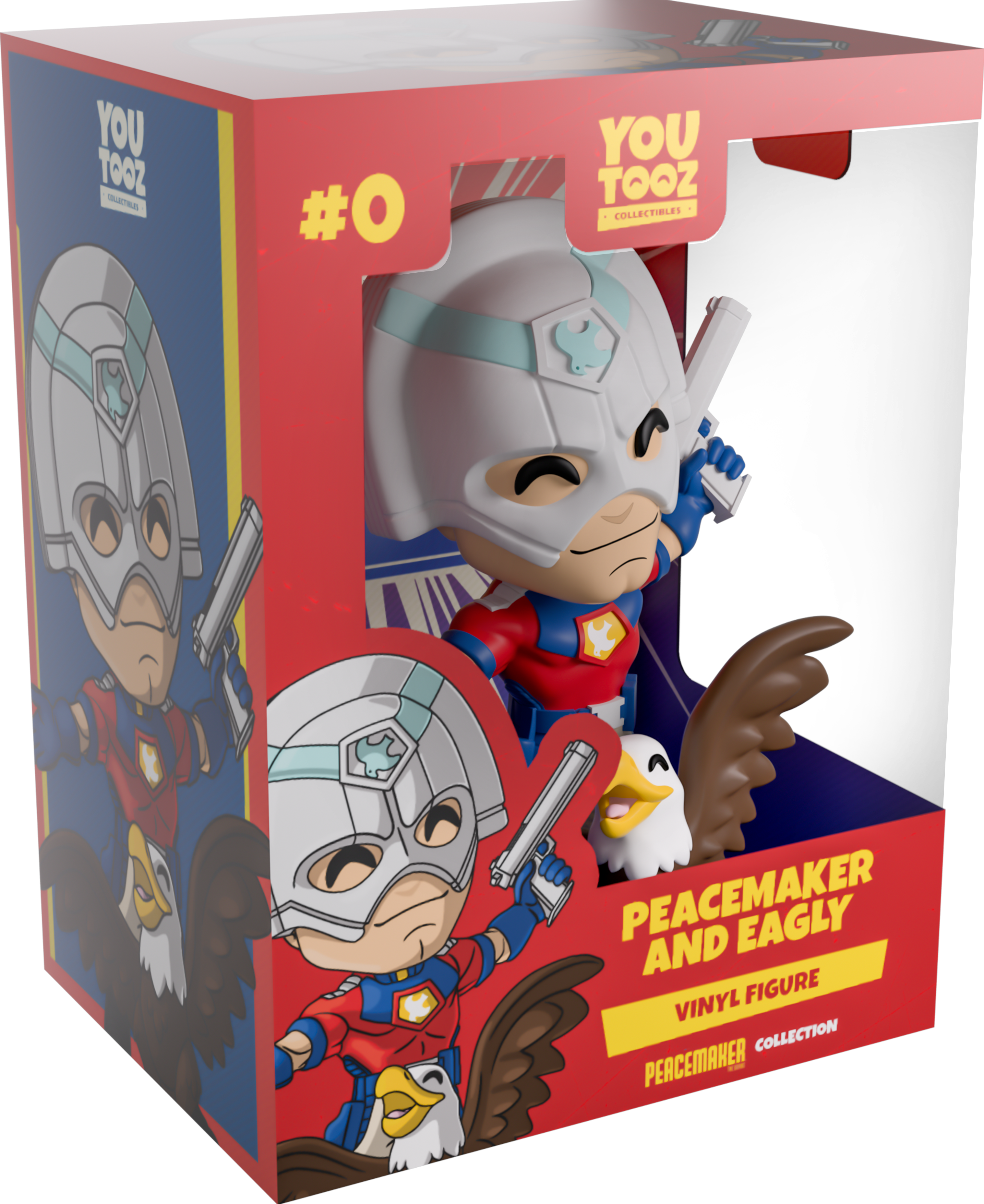 Peacemaker has arrived at Youtooz to show us exactly how peace is done! With a gun and some violence! Standing at 5 inches tall and throwing his arms out to either side as he brandishes a silver pistol to the sky, a confident smile crosses his chiseled face which pokes out from the bottom of his iconic helmet that has blue lines running across the forehead to lead to an dove symbol in the center. Wearing a red shirt with a blue chest plate and yellow emblem on the front, along with beige pants and thick black boots, Eagly stands in front of him happily flapping his long brown wings and letting out a caw from his yellow beak. The exterior of their packaging is covered in blue and red patterns and features the pair standing in a postage stamp frame, while the interior is a red-to-blue gradient. The protective sleeve is then covered in a scratched-up deep red as their figures can be seen through the large clear window at the packaging’s front. This collectible ships in a matte, embossed, protective outer sleeve and a custom sized plastic protector for maximum protection during shipping.