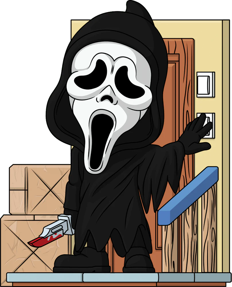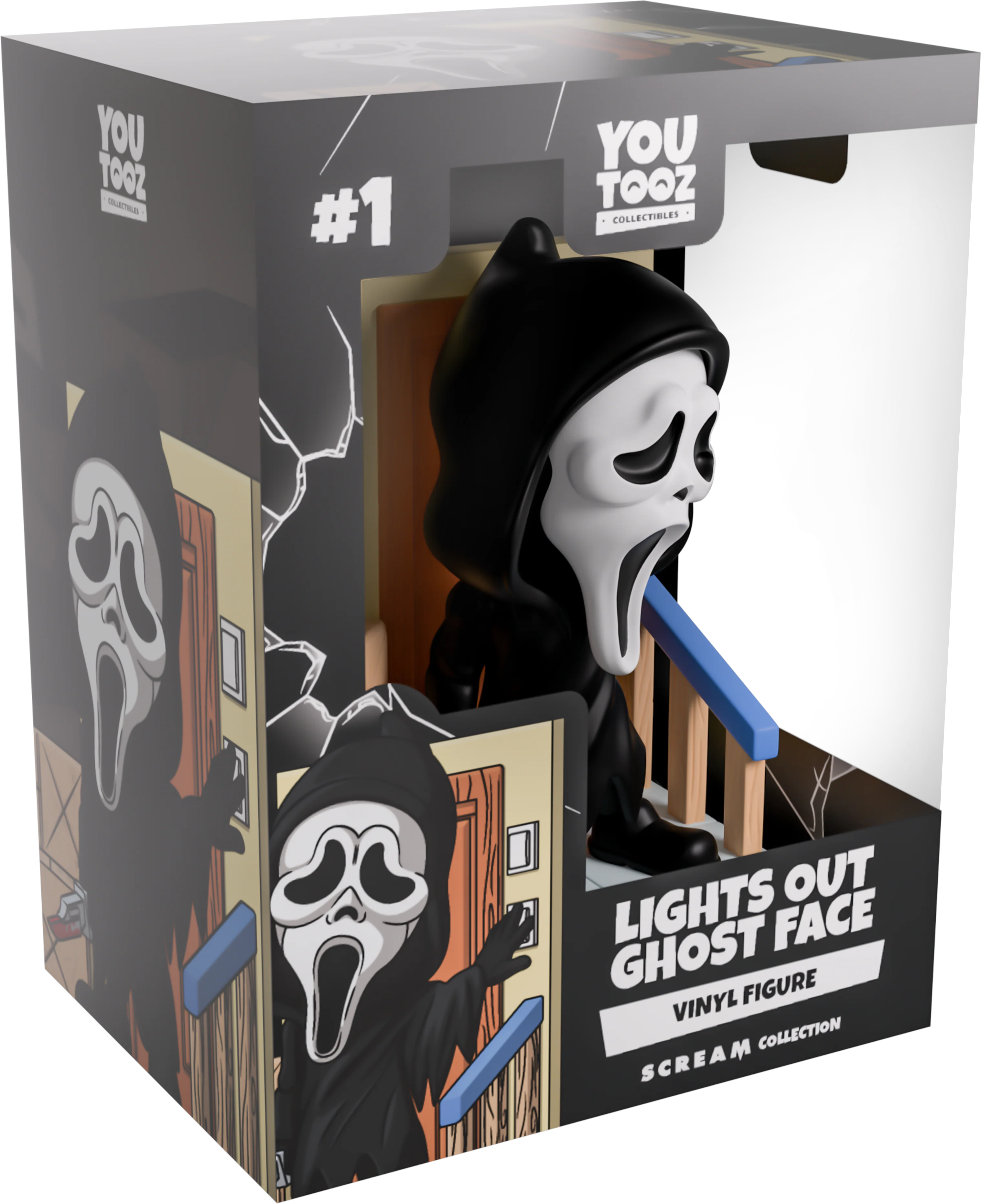 Why is it so dark in here? Who turned off the lights?! Wait, it couldn’t be… could it?! Standing in front of a closed door atop a set of stairs at 4.9 inches tall, Ghost Face masks his way past a pair of discarded boxes to reach his hand out and flick the light switch to plunge you into the most terrifying darkness. Wearing his iconic white mask which will haunt you through the shadows with its horrifying open mouth, his body is covered in a long black cloak that sits over his head and falls from his arms in jagged points. The exterior of his packaging is a close-up of Ghost Face flicking a light switch. The pitch-black interior cracks with shattered glass as his white mask peers through the shadows, this then continues onto the protective sleeve where his figure can be seen through the large clear window at the packaging’s front. This collectible ships in a matte, embossed, protective outer sleeve and a custom-sized plastic protector for maximum protection during shipping.