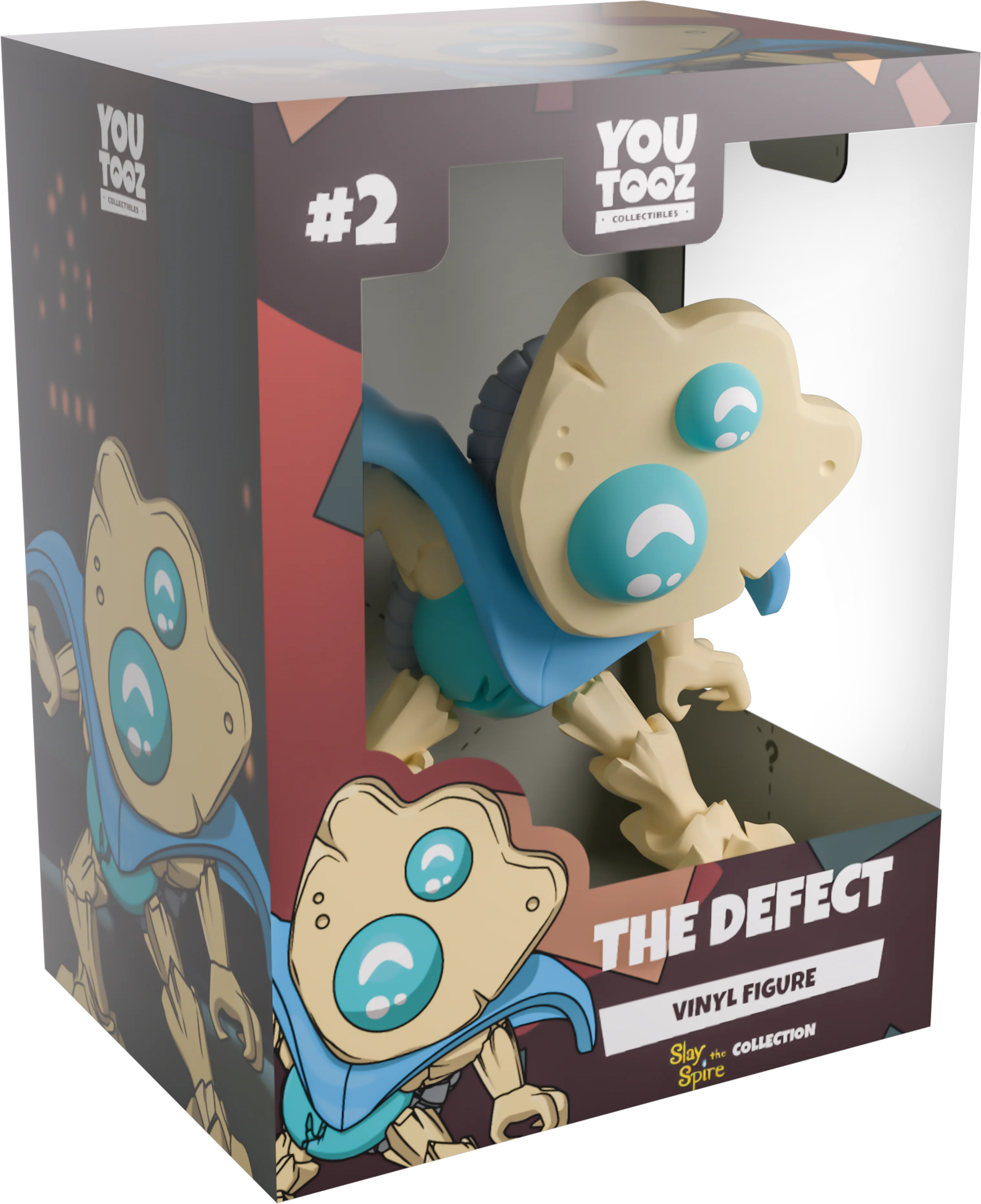 The Defect has slayed the spire and is now setting its eyes on Youtooz! Leaning to the side at 4.1 inches tall with sharp claws on each hand, two orbs sit on top of each other in the center of their softly angled face. With a blue cape billowing from their shoulders as a series of thick grey pipes run from the back of their head to the blue orb of their torso, light brown jagged and segmented legs are planted firmly on the ground as they prepare to leap into attack. The exterior of their packaging sees shadowy ornate pillars against a dark sky, while the interior is covered in the branching paths of the game's map. The protective sleeve shows the spire reaching to and through the clouds with the sun peaking through the hole the spire creates as their figure can be seen through the large clear window at its front. This collectible ships in a matte, embossed, protective outer sleeve and a custom-sized plastic protector for maximum protection during shipping.