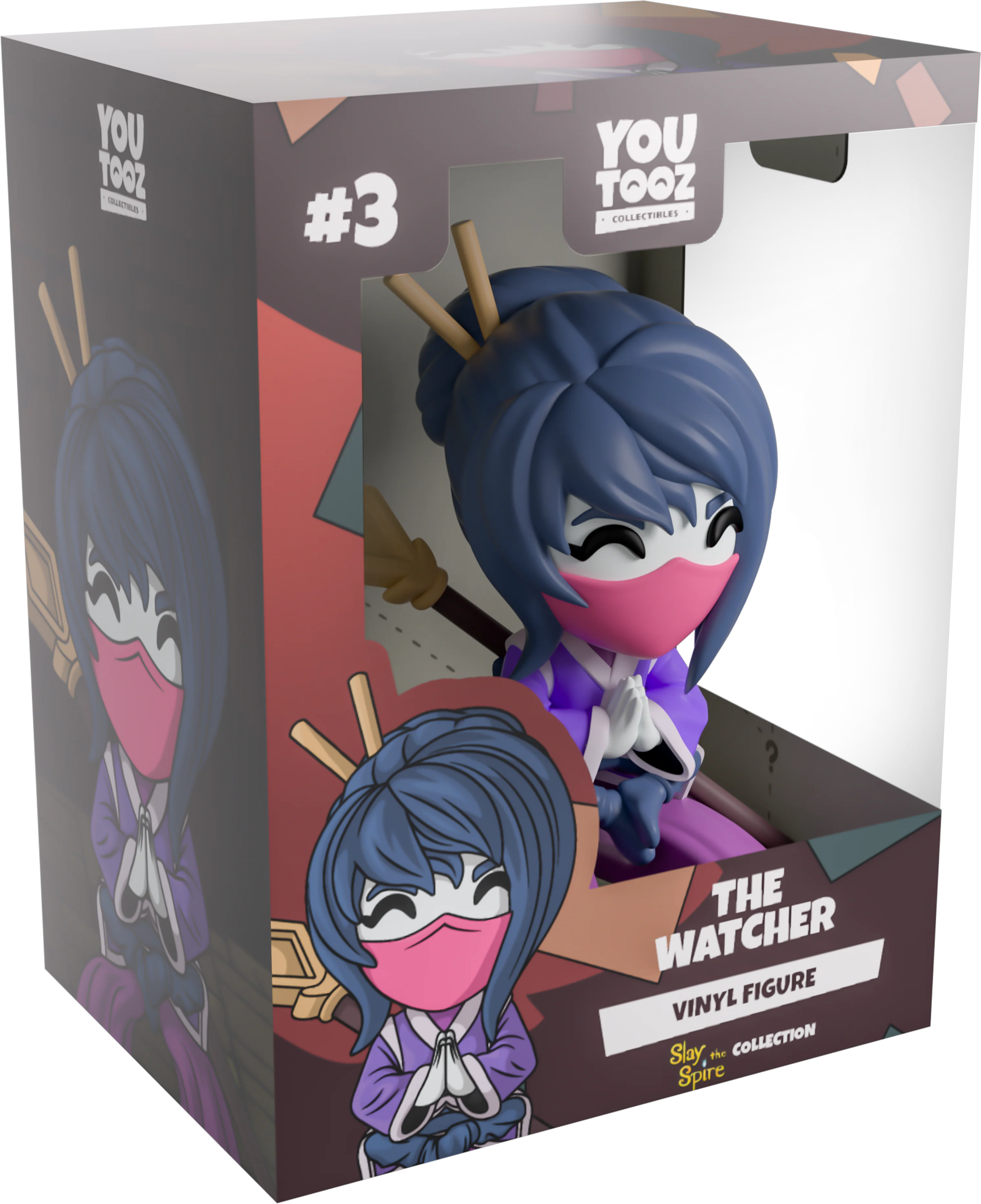 The Watcher has deemed the Spire isn’t the only thing that needs observing, so they’ve come to Youtooz to see exactly what’s going on! Sitting cross-legged as she levitates above the tails of her robe at 4.2 inches tall, her hands are pressed together at the front as she channels energy for the next attack. With a staff strapped to her back with a bow, her long hair sweeps to the side to fall over a masked face and is pulled into a bun at the back of her head as she wears a purple robe with a light trim. The exterior of their packaging sees an empty arena with glowing green flames on the brick wall, while the interior is covered in the branching paths of the game's map. The protective sleeve shows the spire reaching to and through the clouds with the sun peaking through the hole the spire creates as their figure can be seen through the large clear window at its front. This collectible ships in a matte, embossed, protective outer sleeve and a custom-sized plastic protector for maximum protection during shipping.