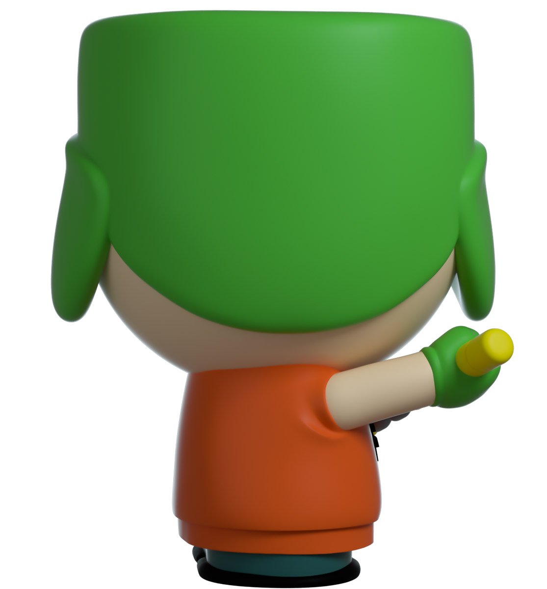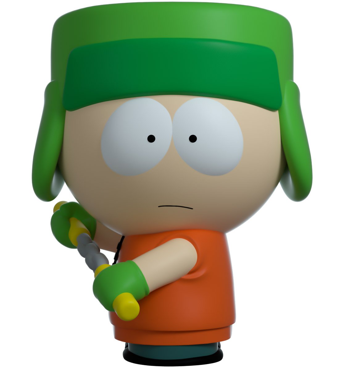 Kyle makes his Youtooz debut as his ninja persona Bunraku, a deadly but compassionate ninja who protects those in trouble. At 3.4 inches tall he stares forward and grips a pair of nunchaku across his front, its chain held taught and ready for an onslaught. He wears a warm green flapped hat and matching gloves, his bright orange shirt is sleeveless orange for optimum mobility of course. The exterior of his packaging shows the glass cases of the weapon ‘shop’ where the boys procured their arms. While the interior is a simple greyscale repeating pattern of the South Park Logo The protective sleeve shows the four boys' faces peeking from the corners of the packaging over a rich black background. This collectible ships in a matte, embossed, protective outer sleeve and a custom sized plastic protector for maximum protection during shipping.