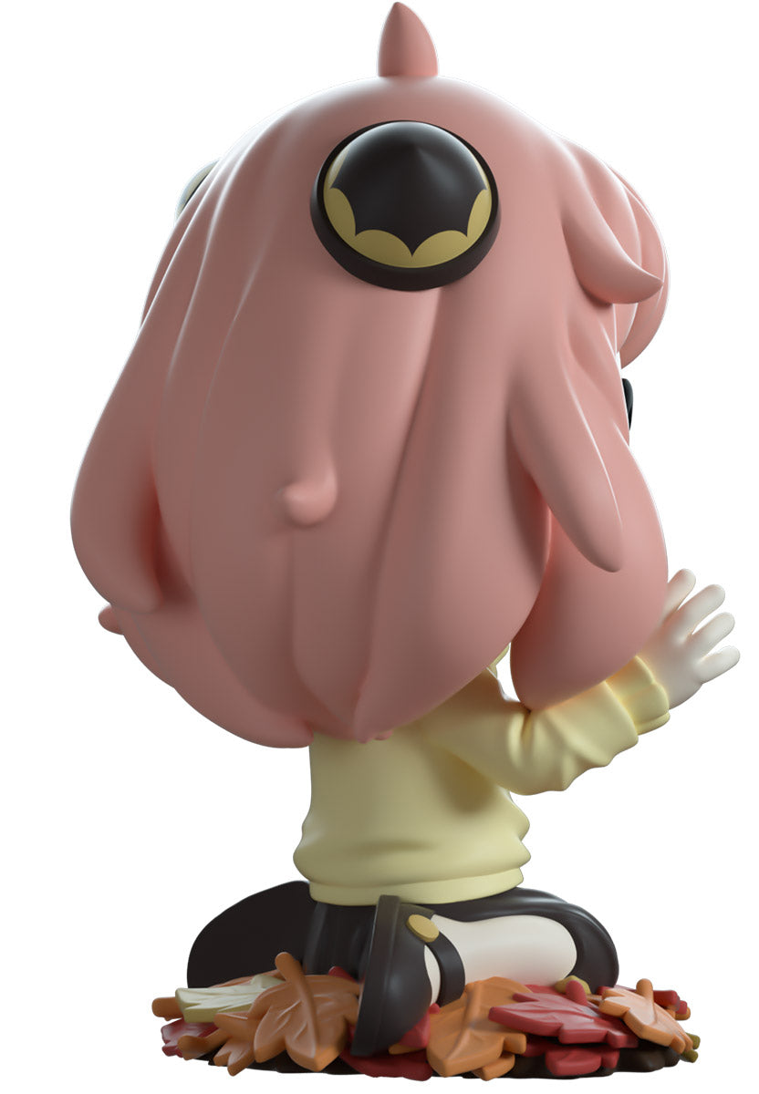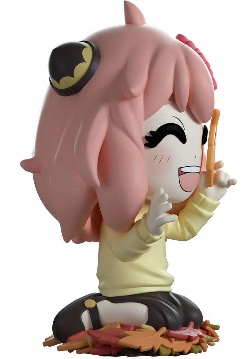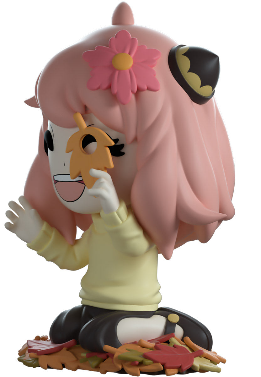 Anya returns to Youtooz for her second vinyl figure and, more importantly, to enjoy the delights of the Autumn season! Kneeling at 3.4 inches tall amongst the fallen Autumn leaves, she delightedly holds up a pointed leaf to look through the hole at its center while letting out an excited laugh from her open mouth. With blushing cheeks and long locks of pale pink hair that’s adorned with her iconic headpieces and a deep pink flower, she wears a thick cream sweater with ribbed collar and cuffs along with a brown skirt and shoes. The exterior of her packaging sees a silhouetted Anya standing on a long stretching X over a bright orange background, while the interior is a beautiful pattern created by various autumn leaves. The protective sleeve continues the Autumn theme with falling leaves and is printed with the Spy x Family logo over a large distinct X, as her figure can be seen through the large clear display window at its front. This collectible ships in a matte, embossed, protective outer sleeve and a custom-sized plastic protector for maximum protection during shipping.
