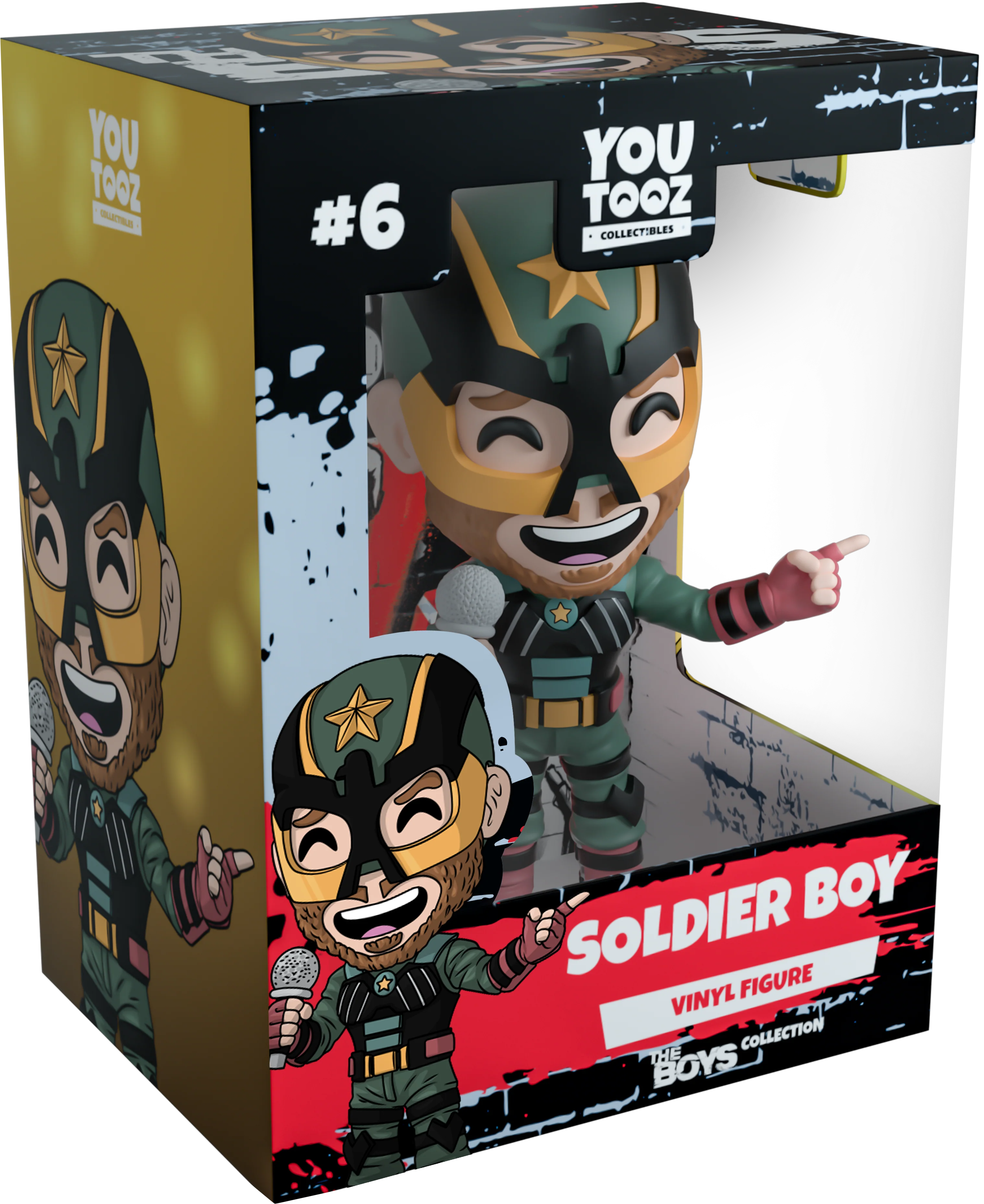Soldier Boy hits the stage to debut his arrival at Youtooz, no it’s not cheesy! Look how classy he is! Busting out some sweet tunes to show just how much of an icon he is and standing at 4.7 inches tall with a silver microphone held in one hand, the other points a finger outwards friskily. Wearing a green, gold and black mask that covers the top of his face and resembles an eagle and a yellow star on the forehead, he wears a green costume with a back chestplate and bands around his legs along with maroon gloves and shin guards. The exterior of his packaging shows Soldier Boy standing on a dazzling golden stage with a microphone held to his mouth. The interior surrounds him in a graffiti scrawled white brick wall that continues onto the protective sleeve with blood stains, as his figure can be seen through the large clear window at the packaging’s front. This collectible ships in a matte, embossed, protective outer sleeve and a custom sized plastic protector for maximum protection during shipping.